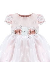 The Isabel Baby Dress is made for special moments. Its embroidered tulle skirt features delicate floral designs, lace appliqués, and subtle sparkles that add a magical touch. The top is soft and elegant, paired with lace sleeves and a floral waistband that completes an angelic look.