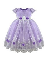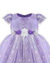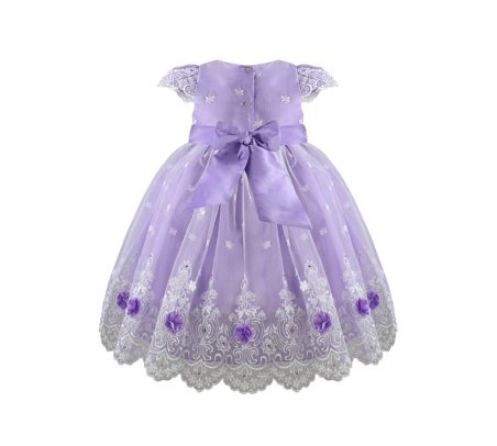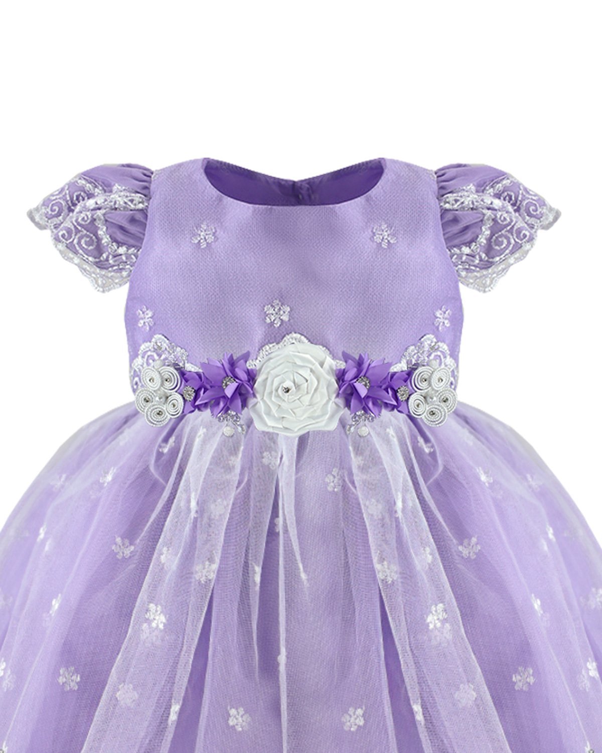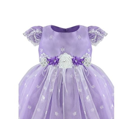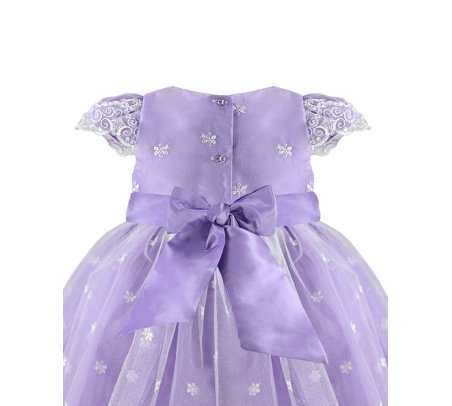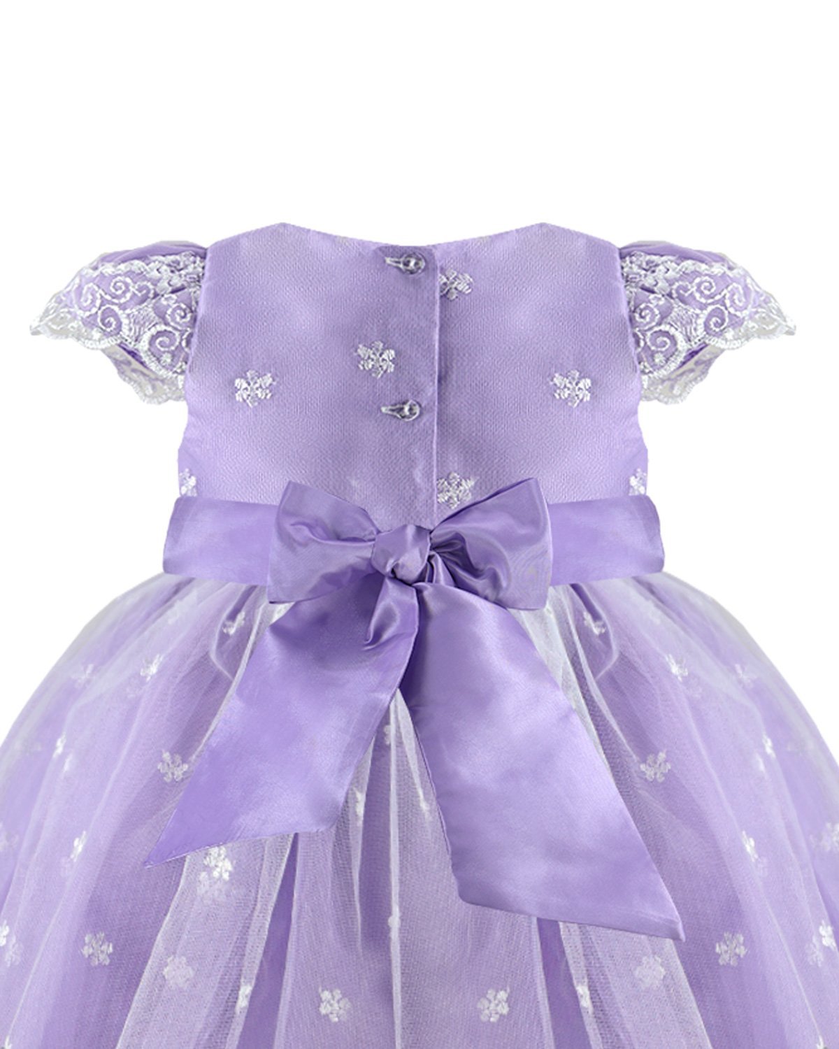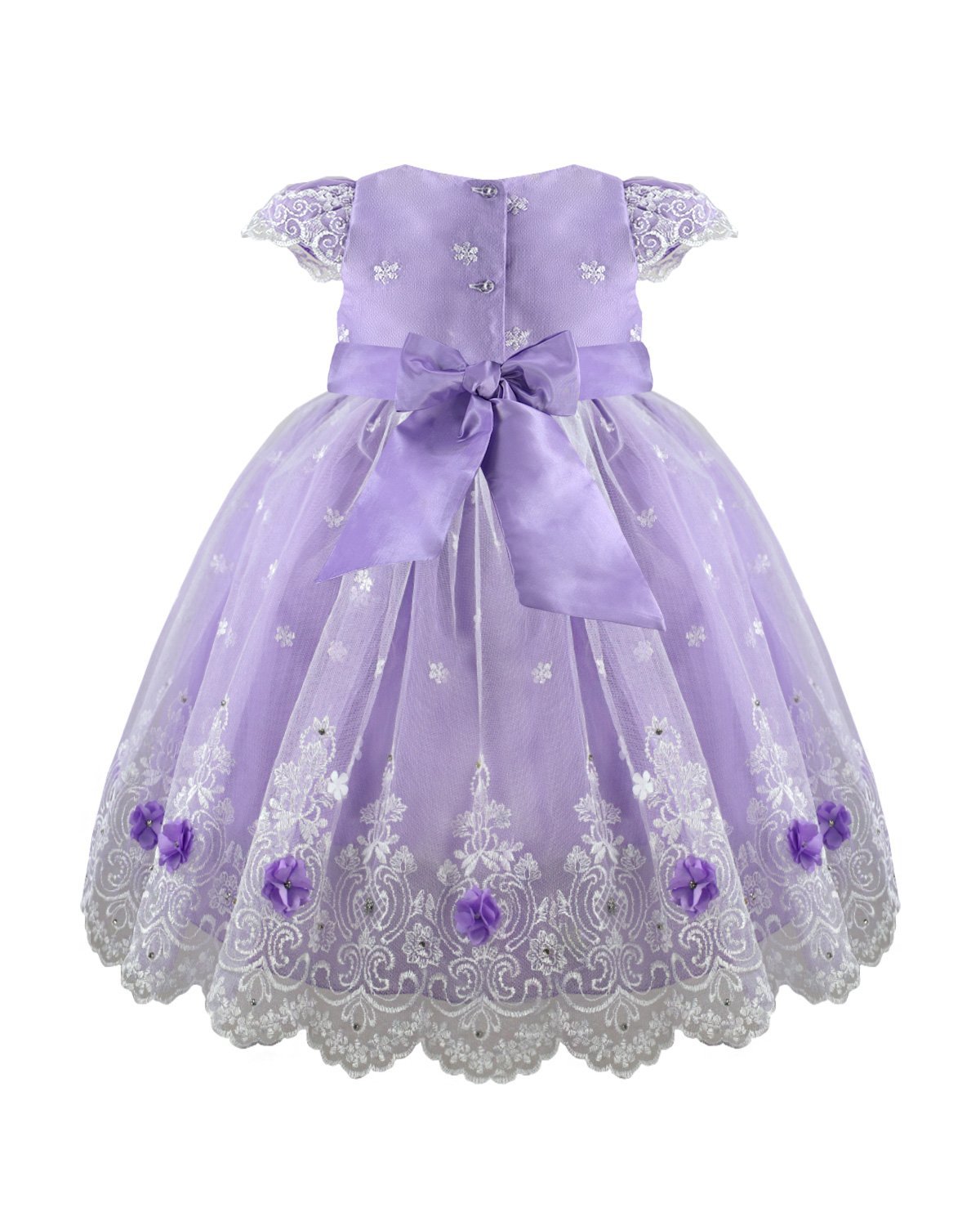Isabel Baby Dress with embroidered tulle, lace details, and floral waistband. Perfect for special occasions.