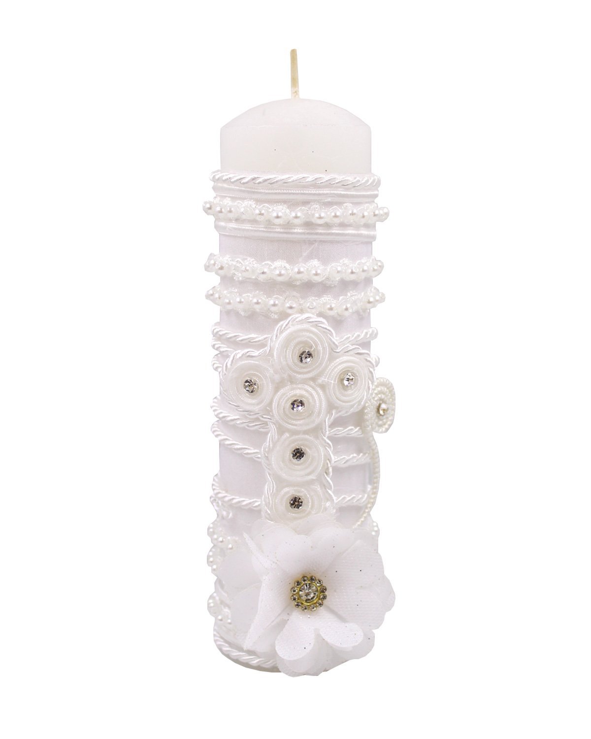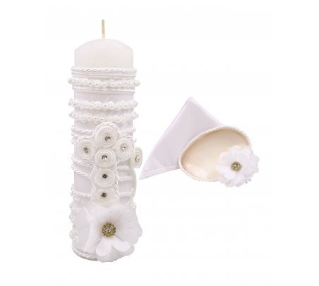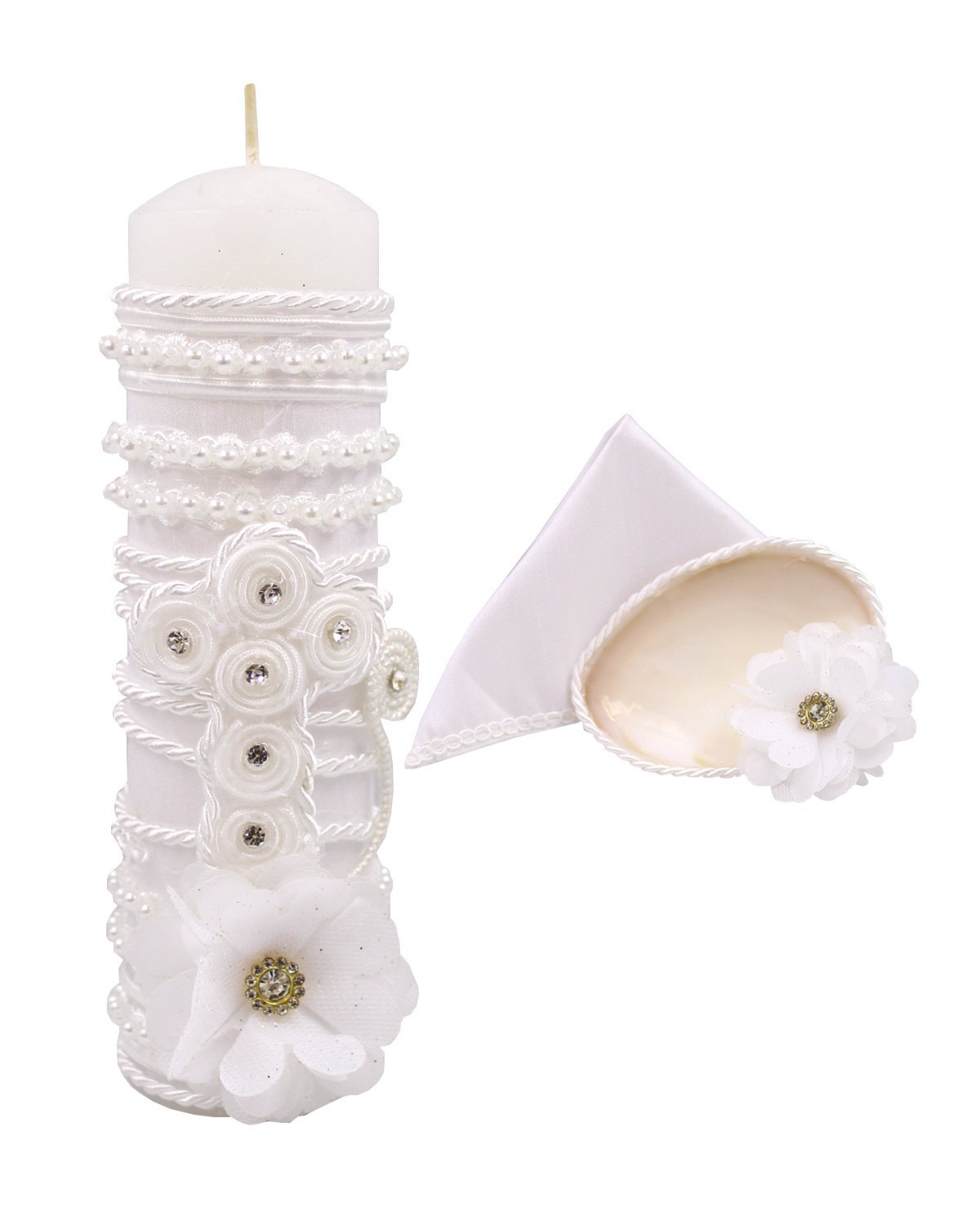 The Cristi Baptism Kit offers elegance and detail to celebrate this special moment. It includes a candle, a shell, and a cloth decorated with embroidery, ribbons, 3D flowers, pearls, and rhinestones.