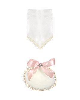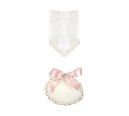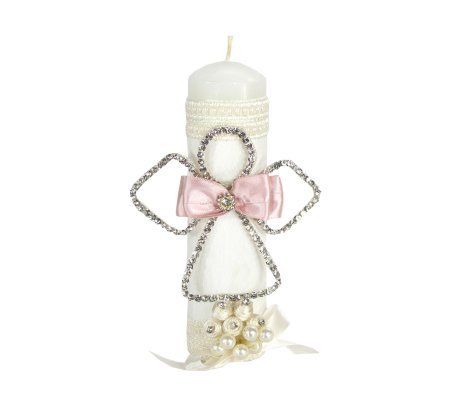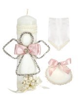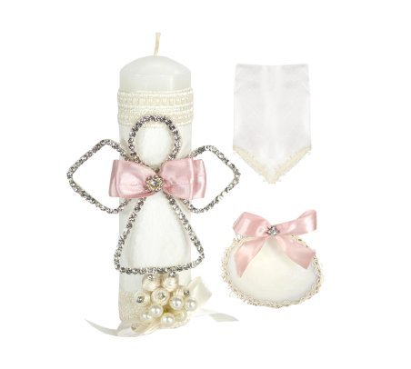 The Angelito Baptism Kit offers charm and elegance for your loved one's baptism. It includes a candle, a shell, and a cloth, decorated with embroidery, ribbon, pearls, and rhinestones, and a little angel figure made with rhinestones embedded in fine aluminum wire.