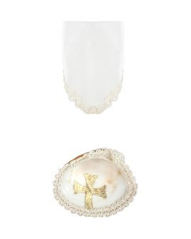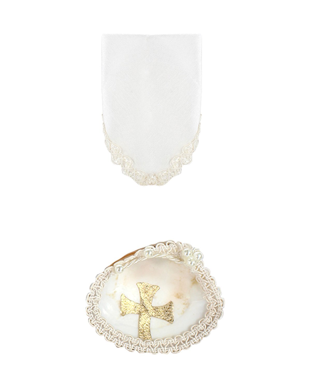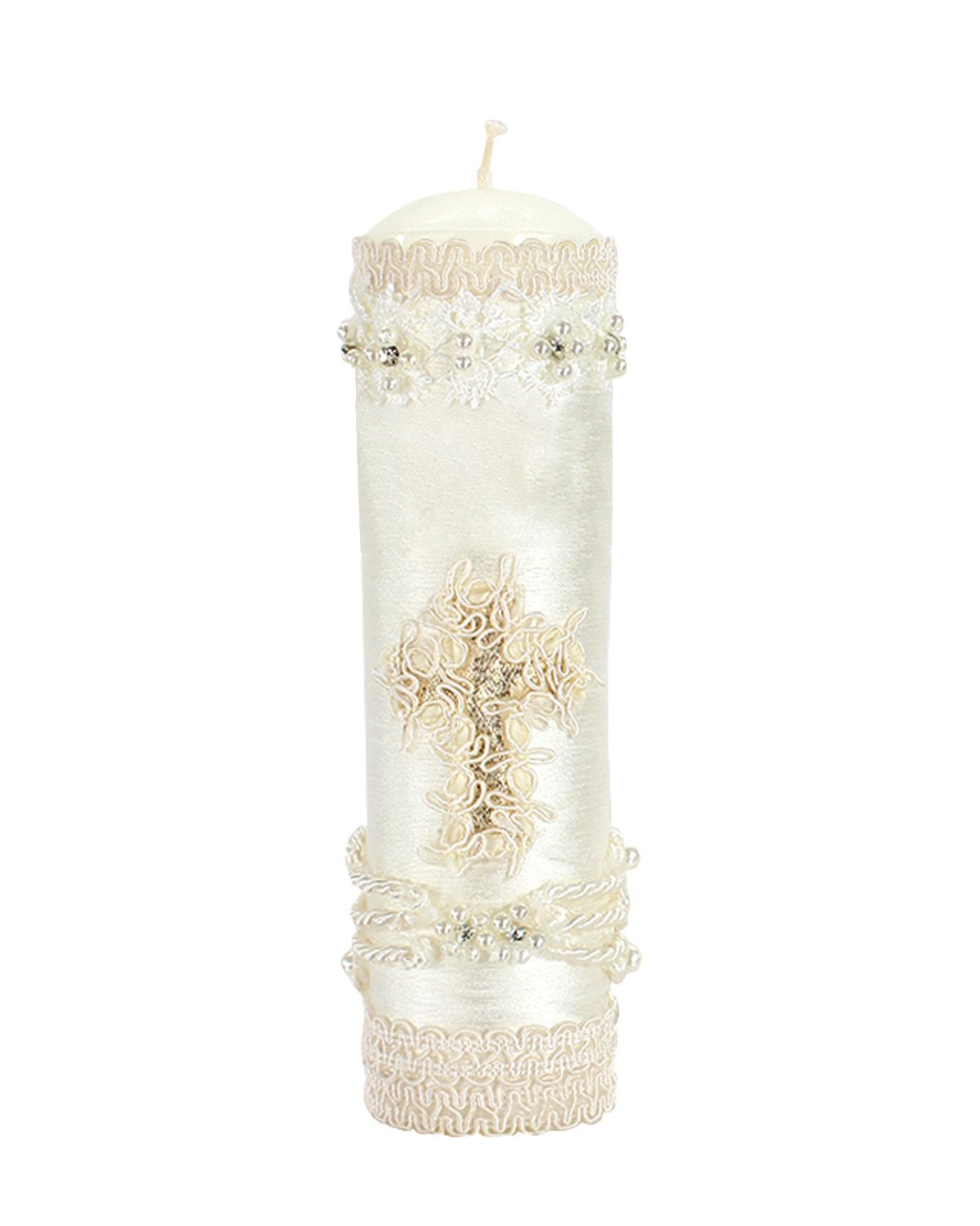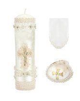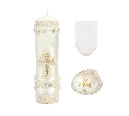 The Noe Baptism Kit offers elegance and meaning for your loved one's baptism. It includes a candle, a shell, and a cloth, with the candle wrapped in fabric, decorated with embroidery, rhinestones, and pearls, and a ribbon cross at the center.