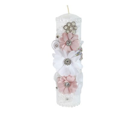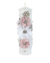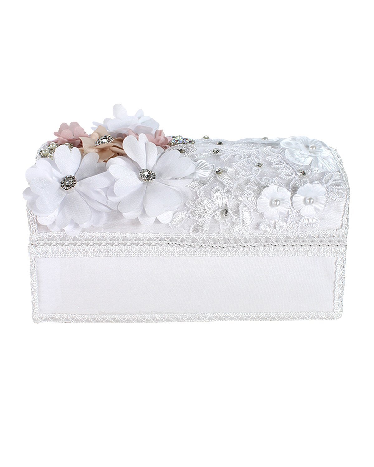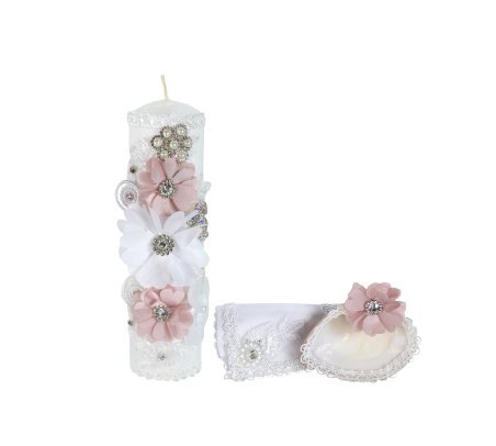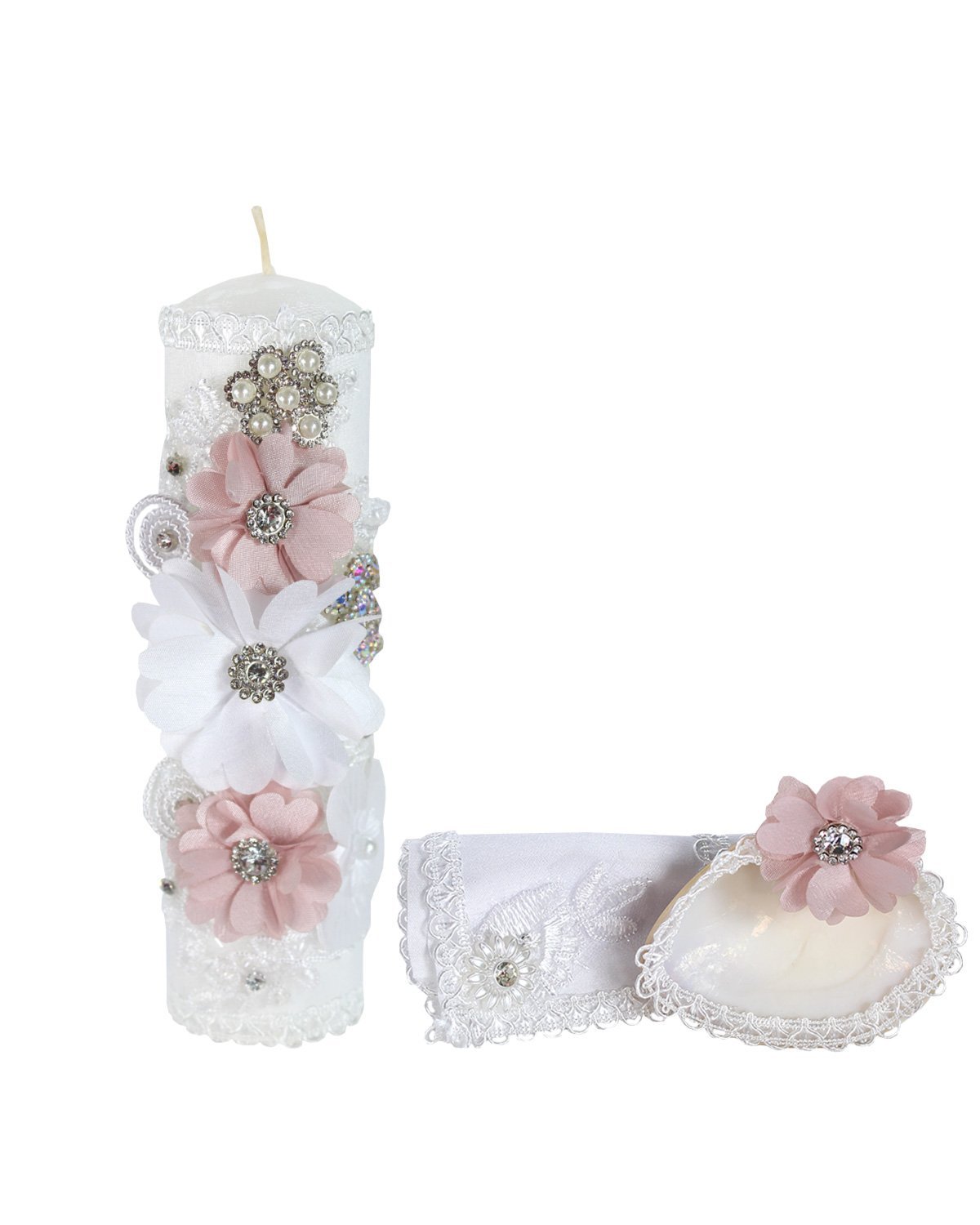 The Baptism Chest Kit Eleonora is the perfect choice to celebrate your loved one's baptism with style and distinction. With a chest, a candle, a cloth, and a shell, each piece is adorned with embroidery, rhinestones, pearls, and 3D flowers, creating a truly charming ensemble.