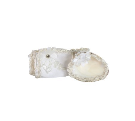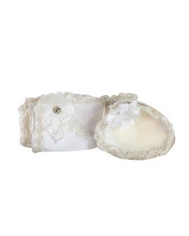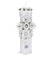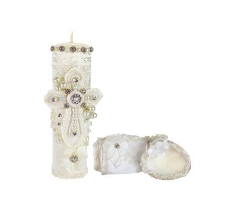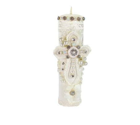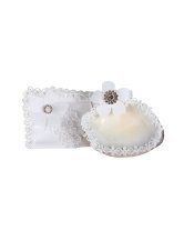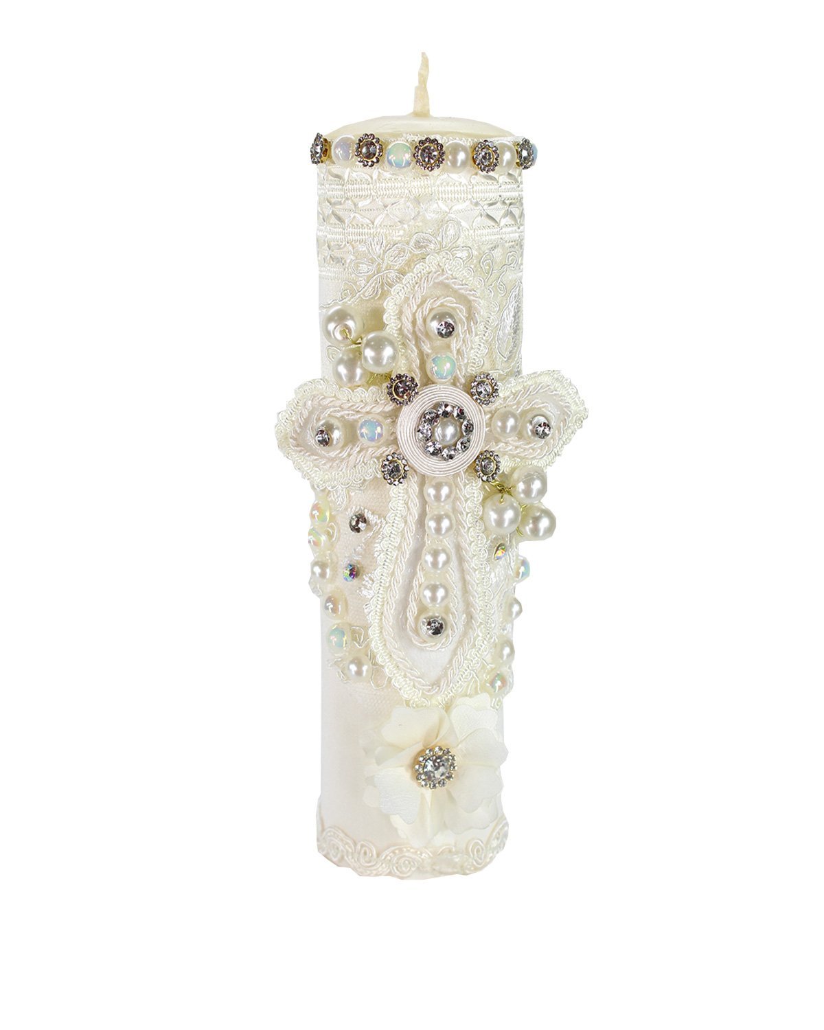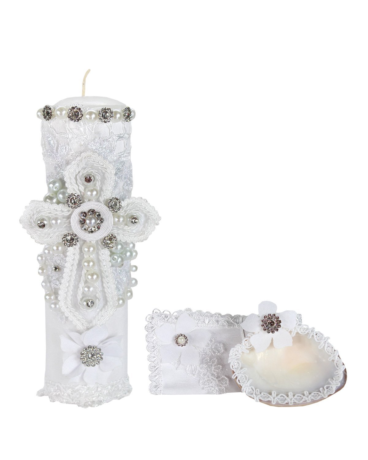 The Franco Baptism Kit offers style and elegance to celebrate your loved one's baptism. Including a candle, a cloth, and a shell, each piece is adorned with embroidery, rhinestones, and pearls, as well as 3D flowers. The cross formed with pearls adds a special and meaningful touch to this set.