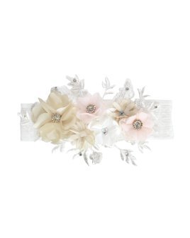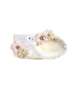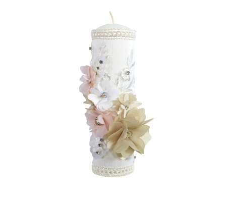 Irlanda Baptism Kit with candle, shell, cloth, and elastic headband, adorned with 3D flowers, crystal beading, pearls, and embroidered edges.