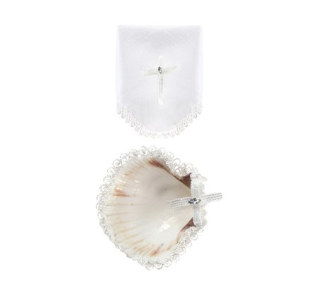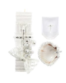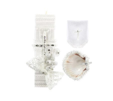Alberto Baptism Kit, with candle, shell, and cloth adorned with ribbons, embroidered borders, pearls, and rhinestones. Available in white and beige.