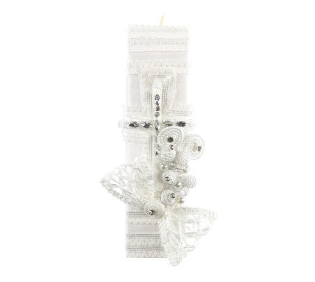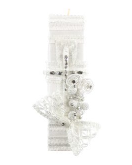 The Alberto Baptism Kit is a unique set that blends tradition with elegant details. It includes a candle, shell, and cloth, all wrapped in fine ribbons and embroidered borders that enhance its design. Each piece is adorned with pearls and rhinestones, adding a sophisticated touch. The candle features a delicate cross, while the cloth, decorated with ribbons and a cutwork bow, completes this harmonious set. Available in classic white and beige, this kit is perfect for making this significant occasion even more special.
