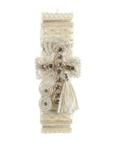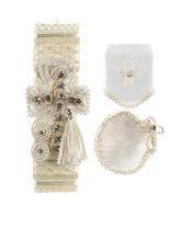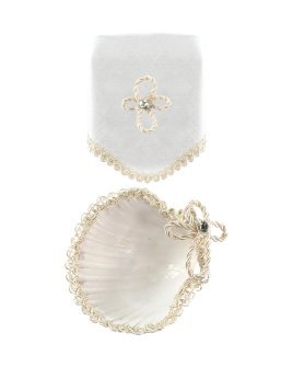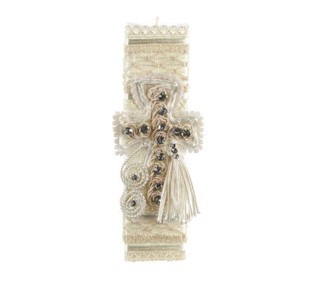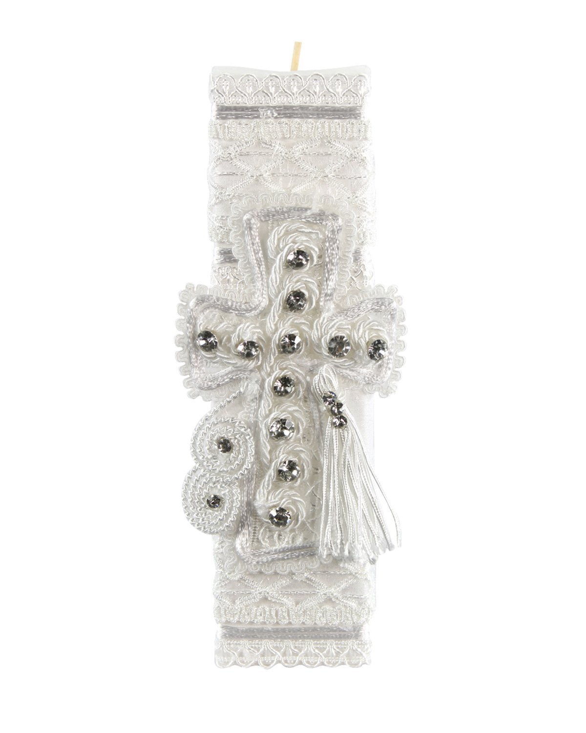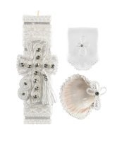 Maximiliano Baptism Kit with a candle, shell, and cloth adorned with pearls and rhinestones. The candle features a ribbon cross with rhinestone and pearl details.