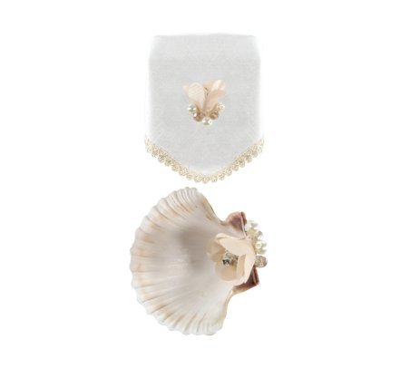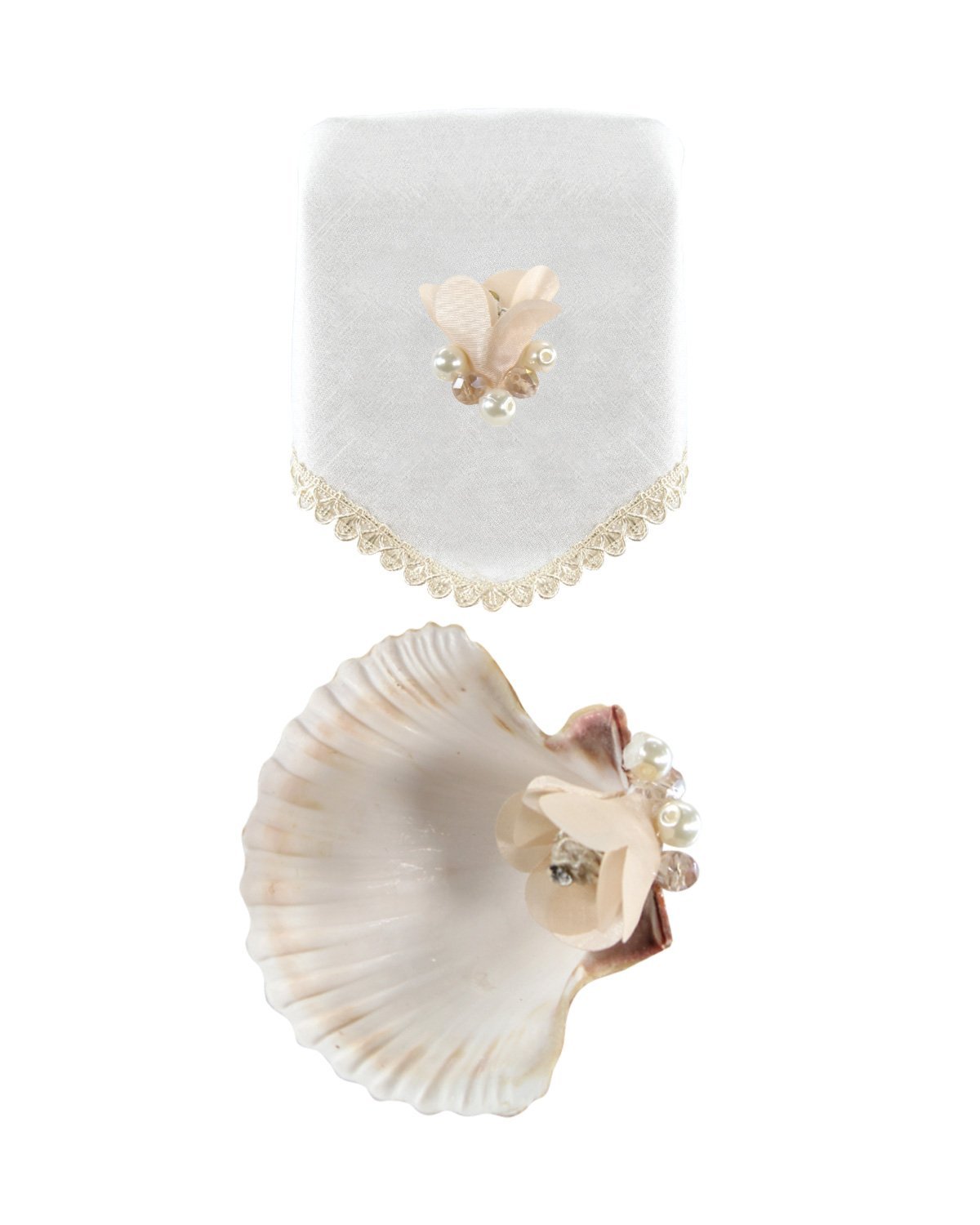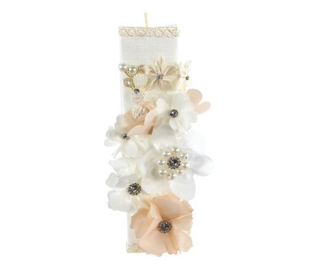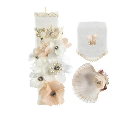 Samira Baptism Kit includes a candle, shell, and cloth decorated with pearls and rhinestones. The candle features 3D flowers, decorated with rhinestones and pearls.