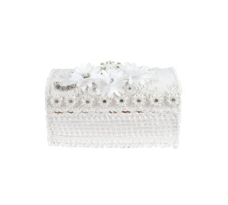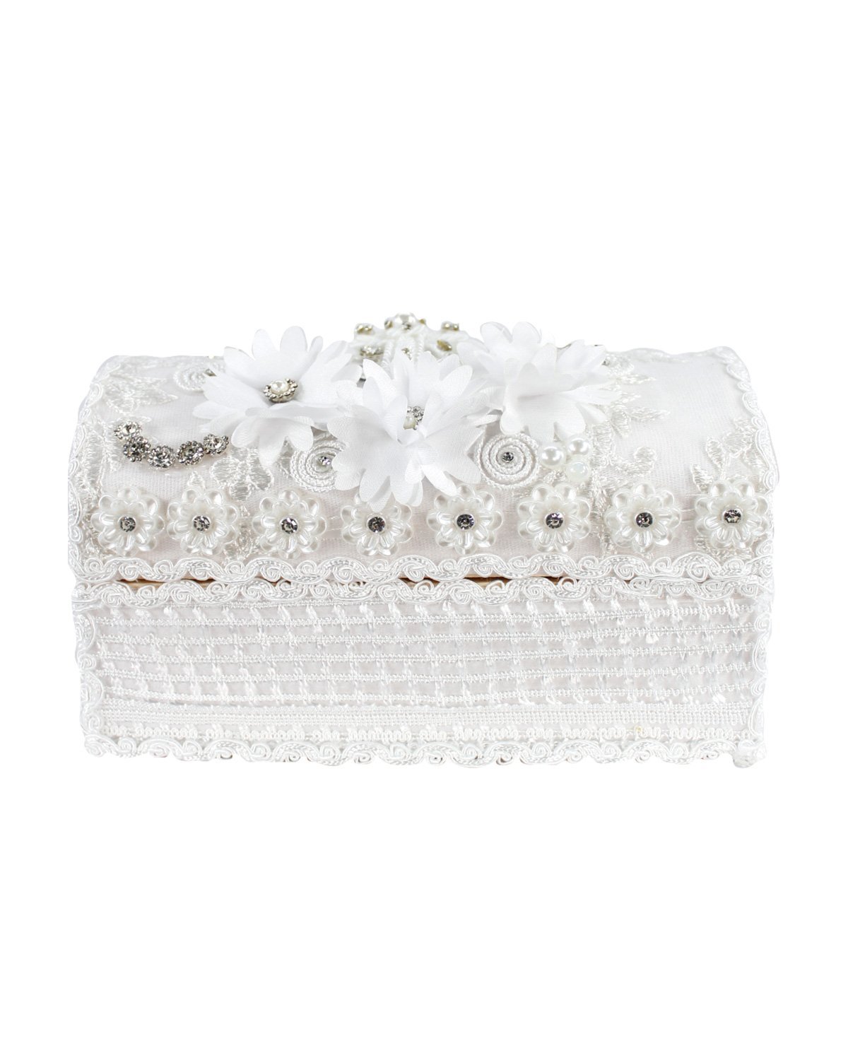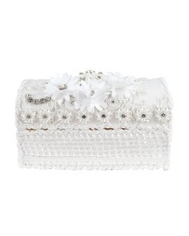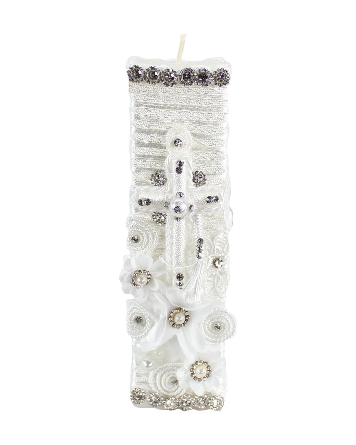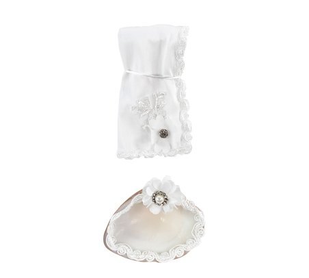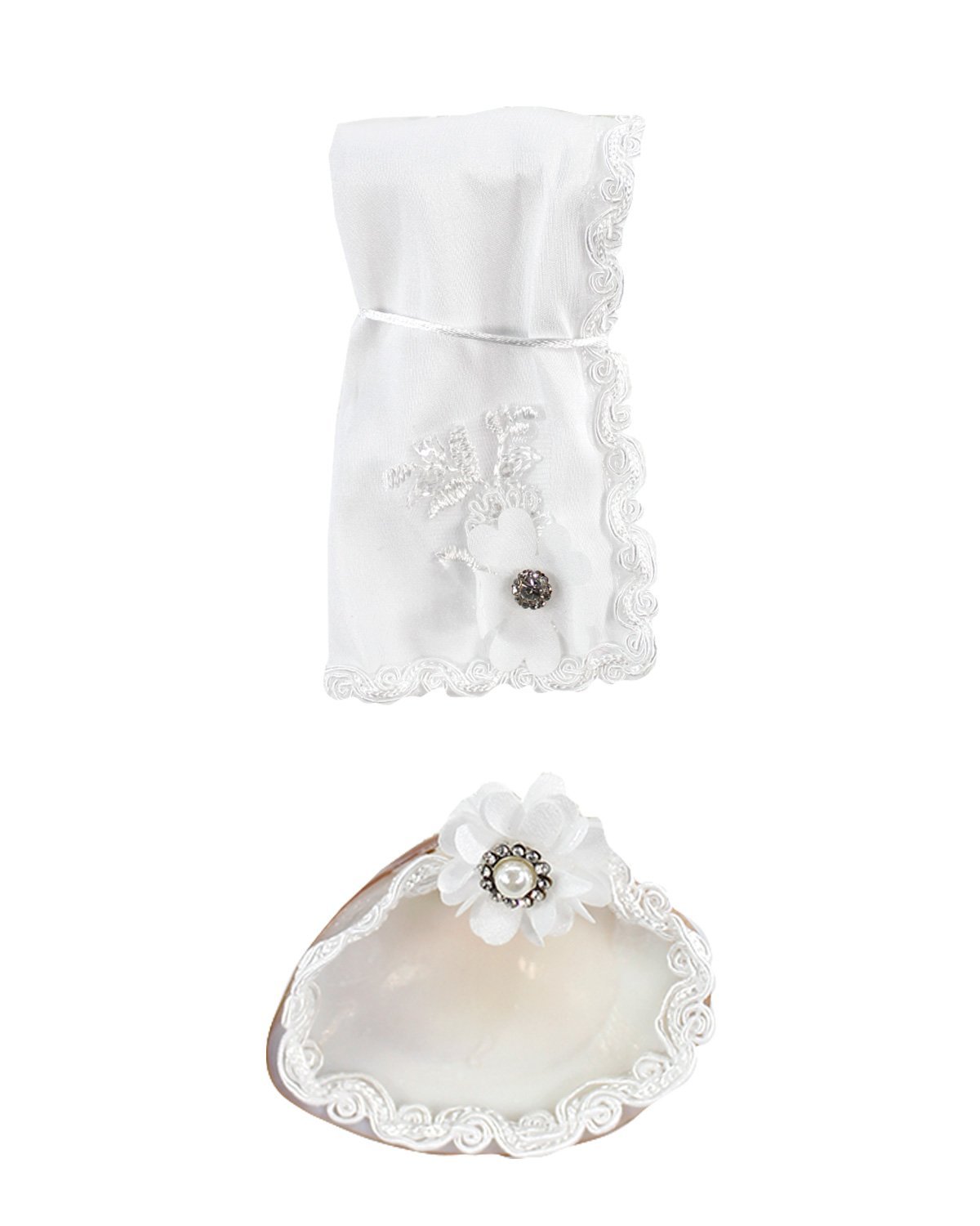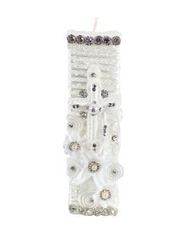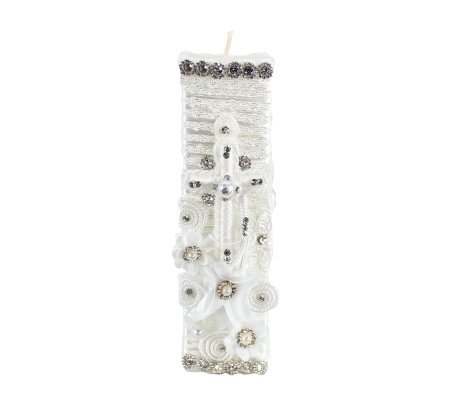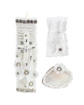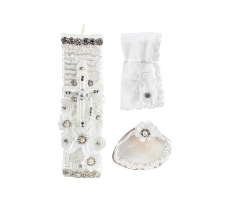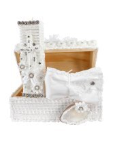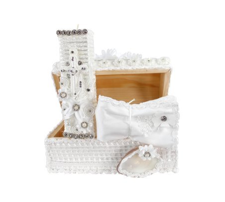 The Enrique Baptism Chest Kit includes a candle, shell, cloth, and decorated chest with rhinestone and lace details, perfect for a special ceremony.