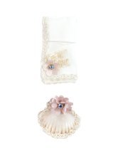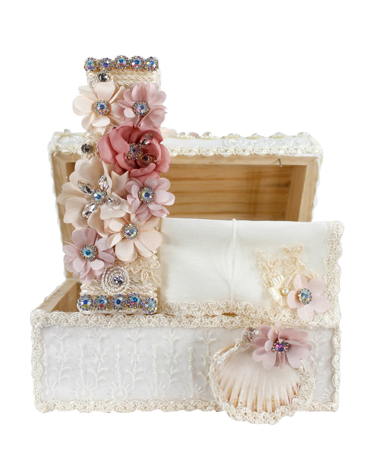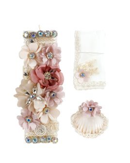 The Selene Baptism Chest Kit includes a candle, shell, cloth, and decorated chest with lace, pearls, and rhinestone details, ideal for a special ceremony.