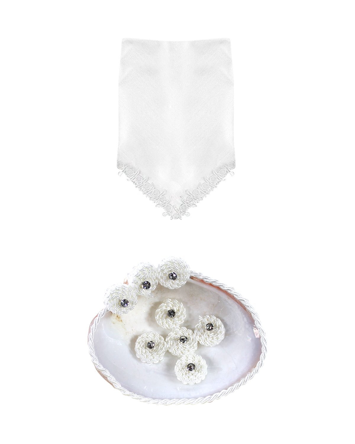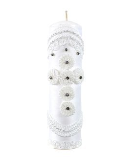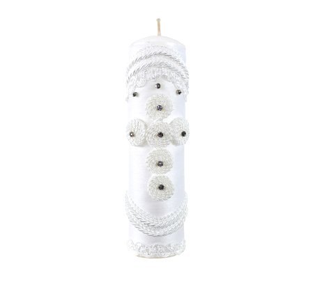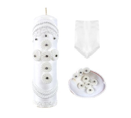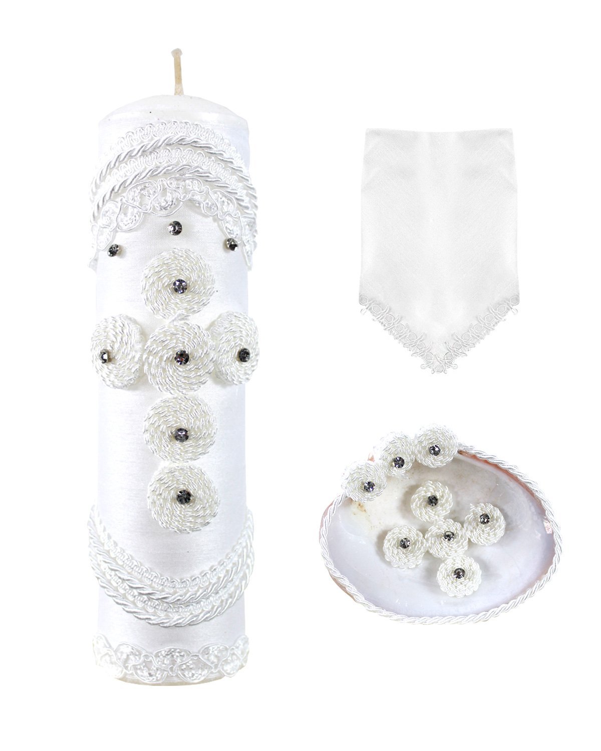Christening Kit, With round candle, shell and sheet. Very beautiful and elegant, perfect for one of our Maylin collection robes. We have white and beige. The sail is lined, designed with trimmings forming a cross and small sirconia. It contains a perfect cross-shaped design that undoubtedly makes it a beautiful and simple model.