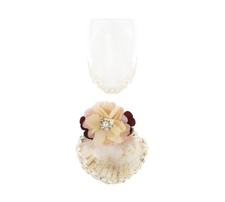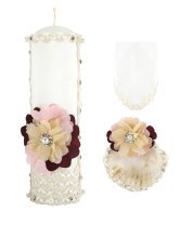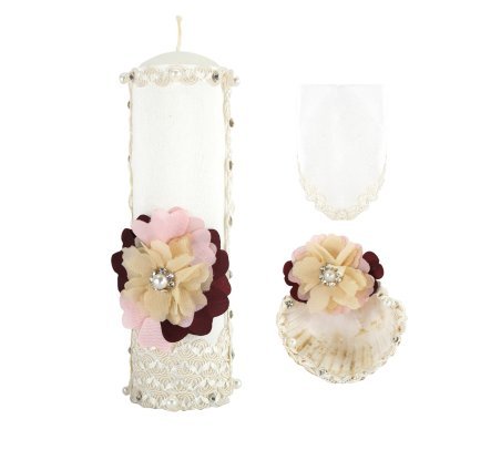 Madison Baptism Kit with candle, shell, and cloth decorated with fabric, embroidered edge, gemstones, and 3D flowers with gemstones.