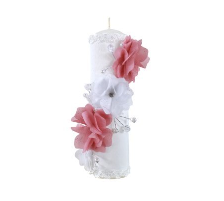 Julia Baptism Kit with candle, shell, and cloth decorated with embroidery, 3D flowers, gemstones, and pearls, with embroidery on the edge.