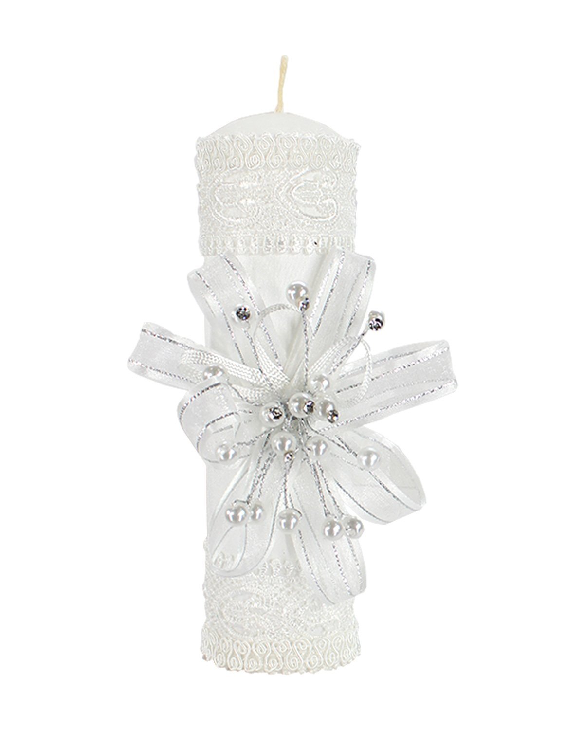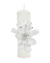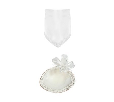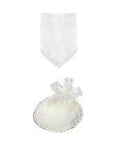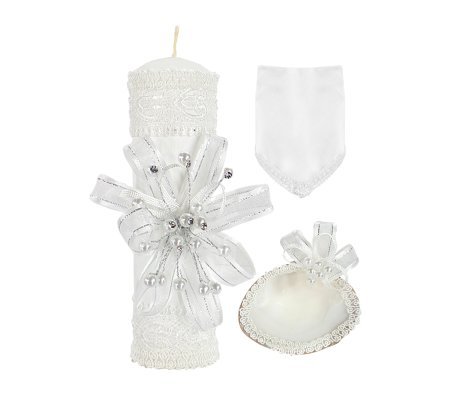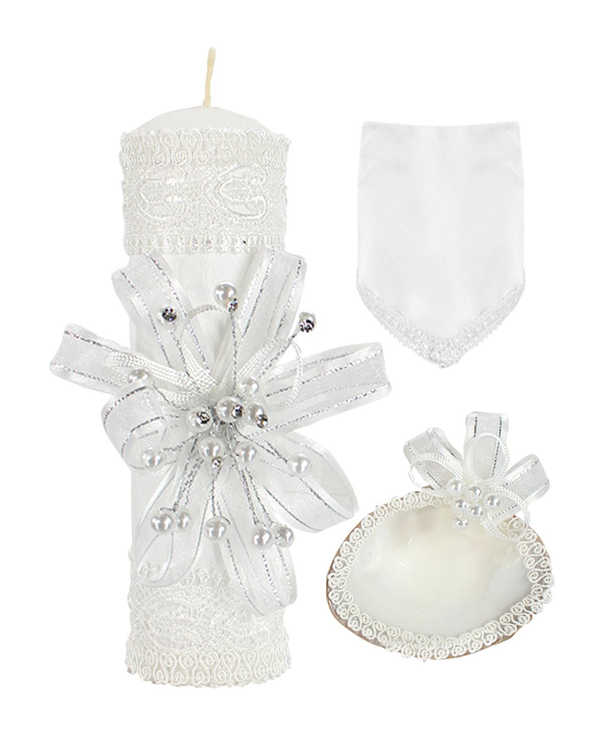 Damian Baptism Kit with candle, shell, and cloth decorated with embroidery, ribbon bow with pearls and gemstones.