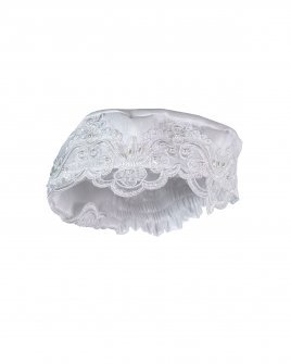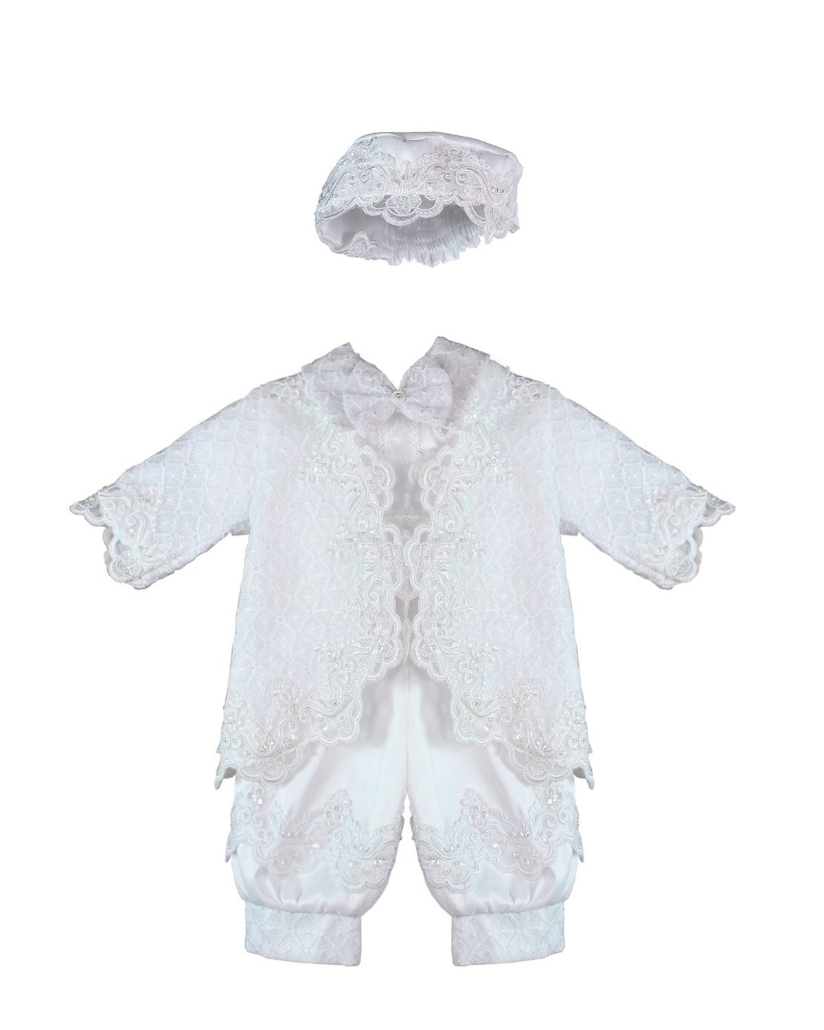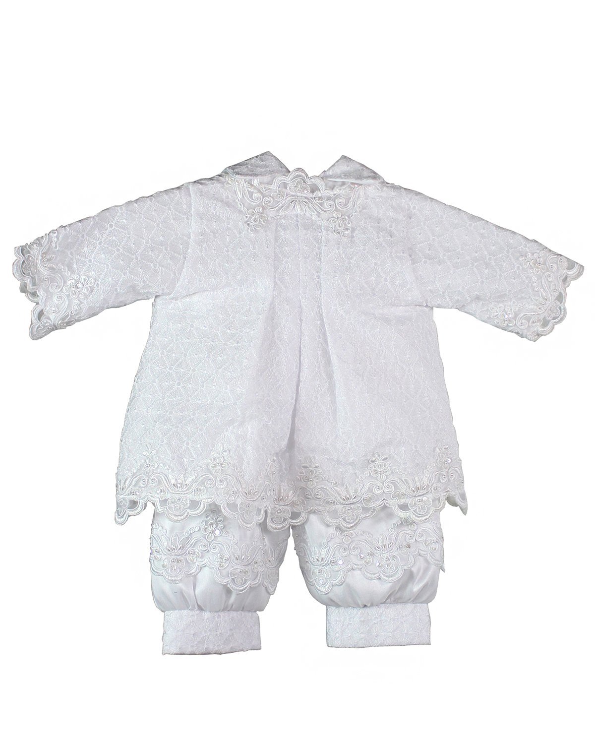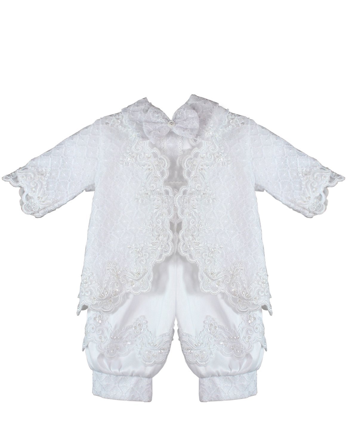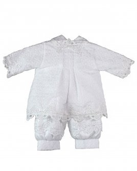 Maylin's boy's robe is made of shantung and features fine embroidery, sequin and pearl embroidered band, and Louis XV-inspired design.
