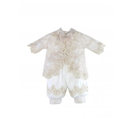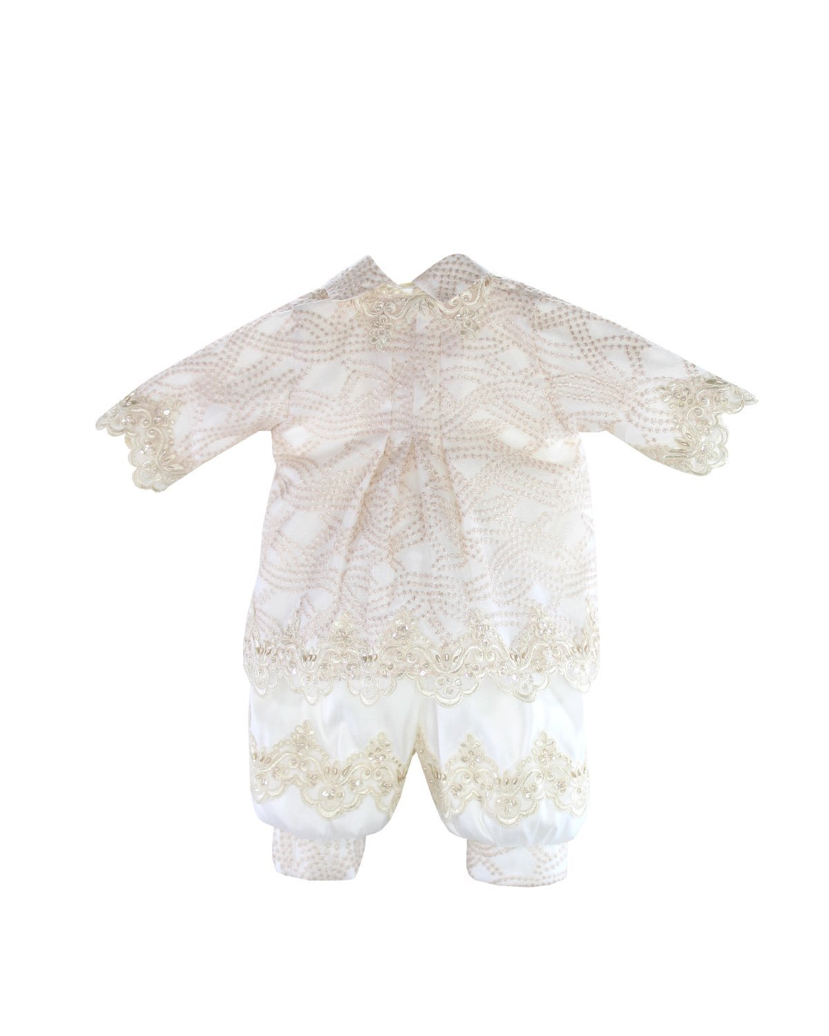 Maylin's boy's robe is made of shantung and features fine embroidery, sequin and pearl embroidered band, and Louis XV-inspired design.