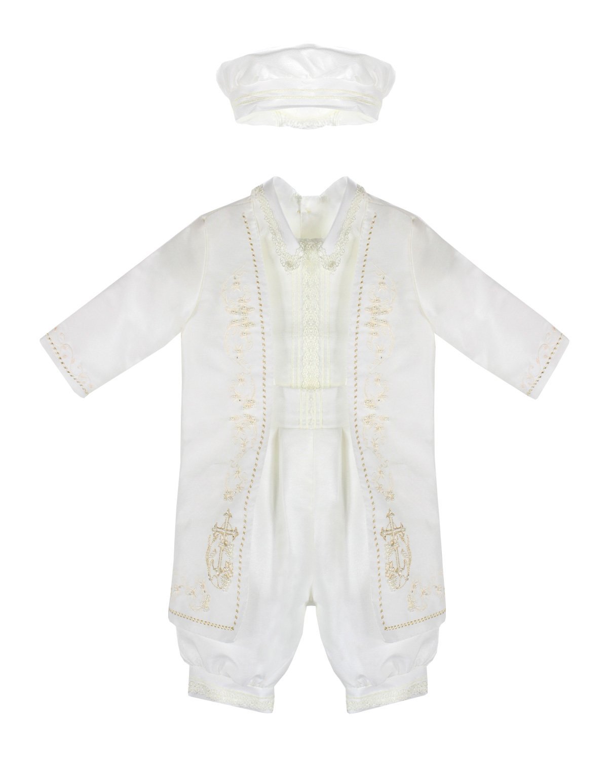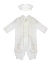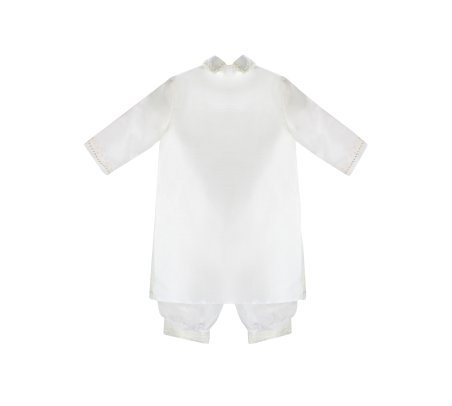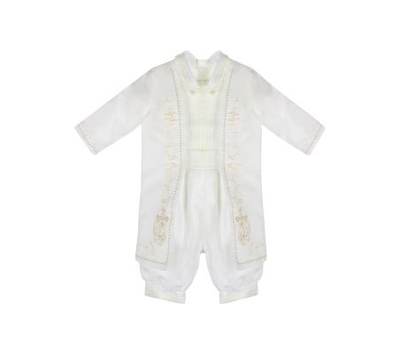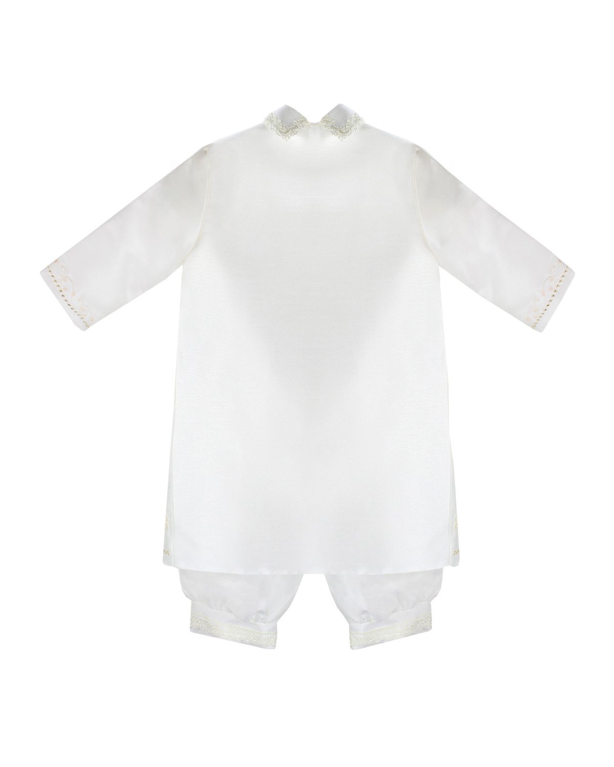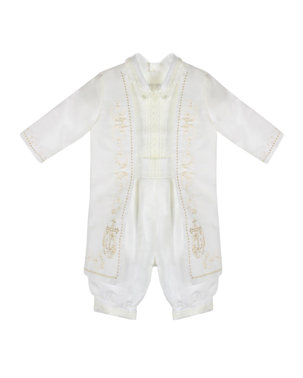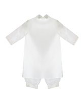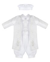 The Mariano Boy's Gown is made of shantung and includes a shirt with light embroidery on the collar and in the center, pants with embroidery at the bottom, front-buttoned suspenders, a jacket with embroidery and pearls, and long sleeves with embroidery at the end.