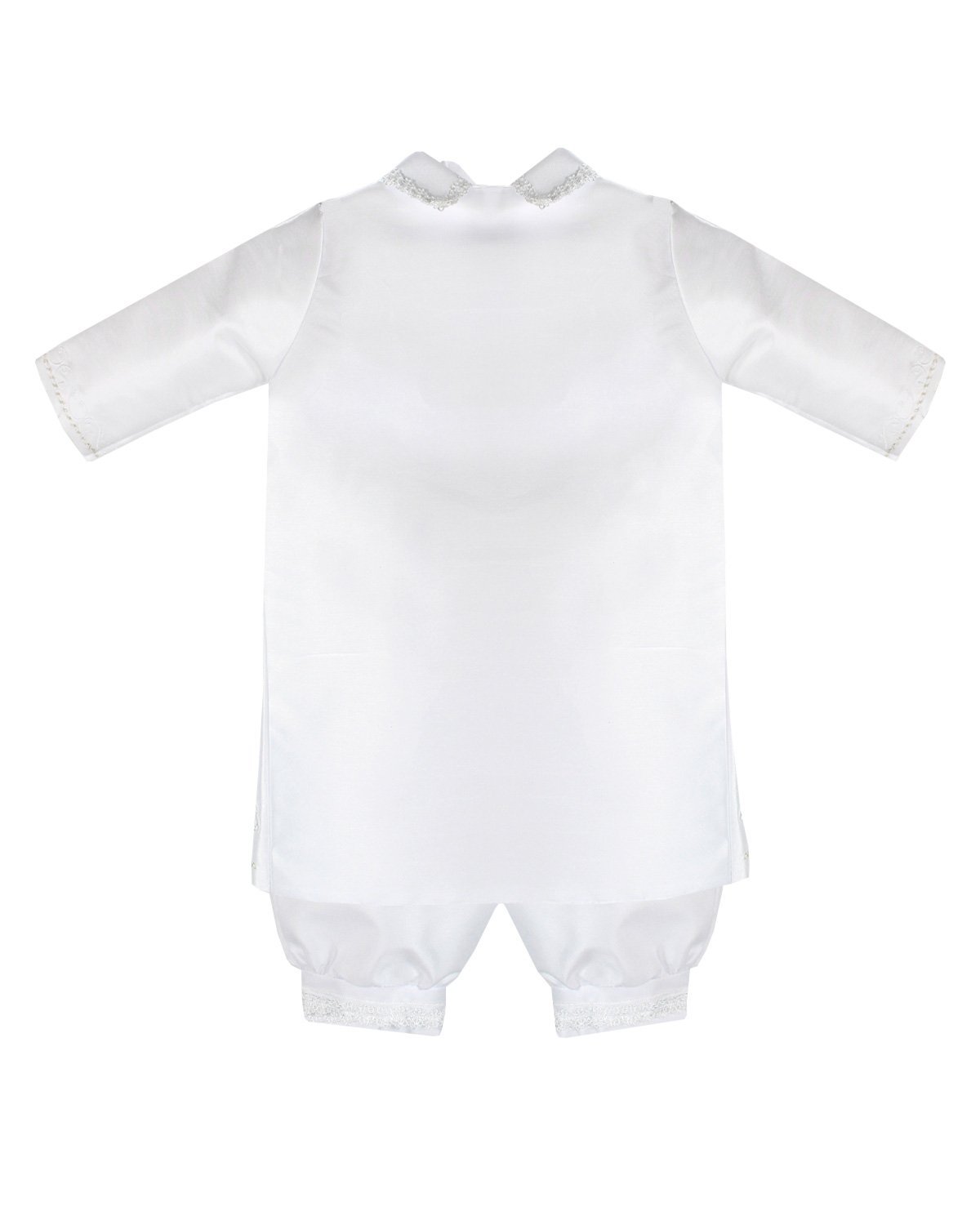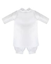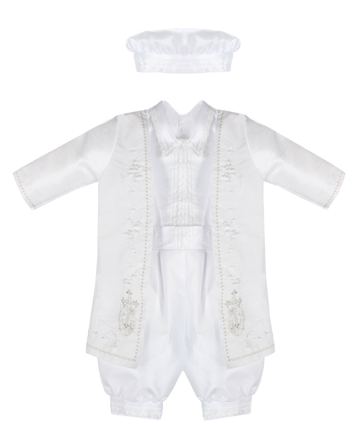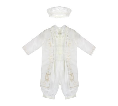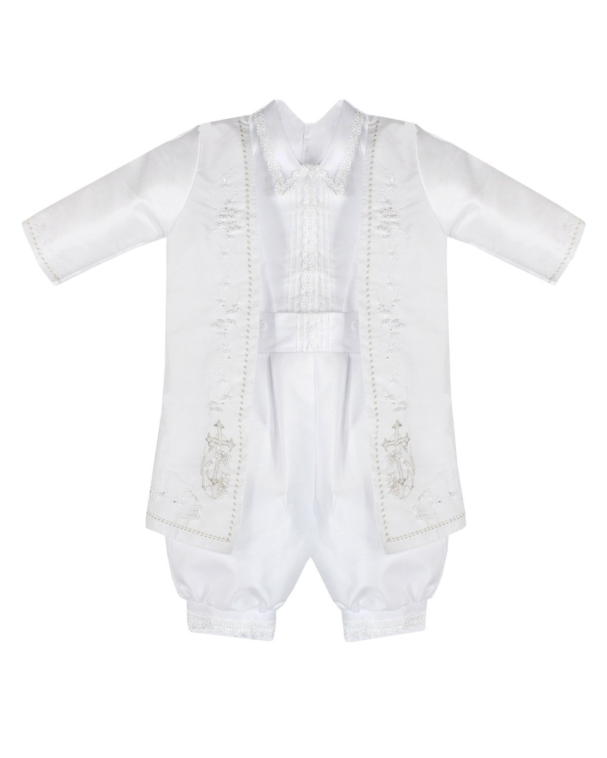 The Mariano Boy's Gown is made of shantung and includes a shirt with light embroidery on the collar and in the center, pants with embroidery at the bottom, front-buttoned suspenders, a jacket with embroidery and pearls, and long sleeves with embroidery at the end.