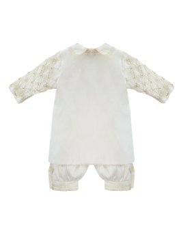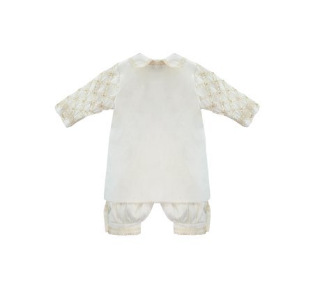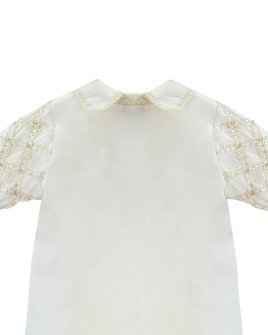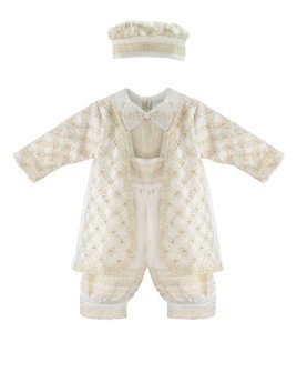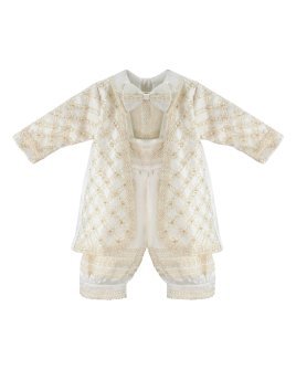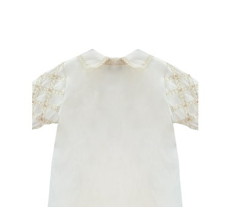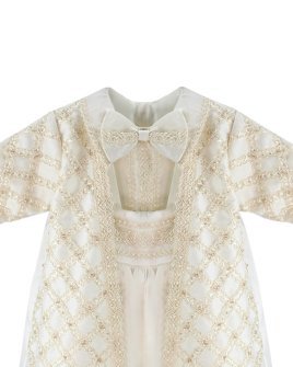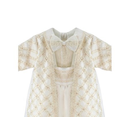 Boy's christening gown style, made of shantung with embroidered guipure details, crystal beading, and pearls. Elegant design with diamond-shaped embroidery and front buttons.