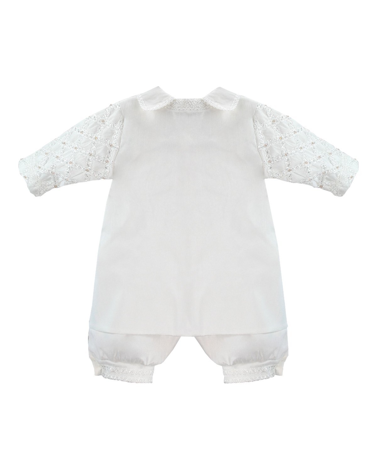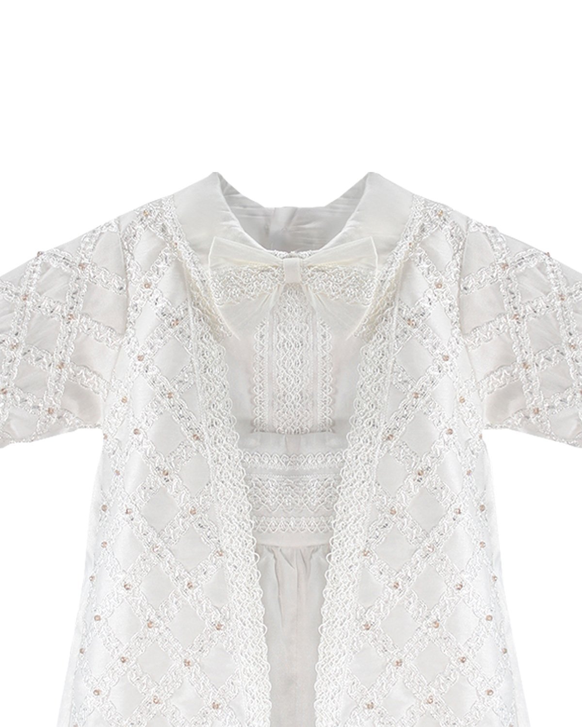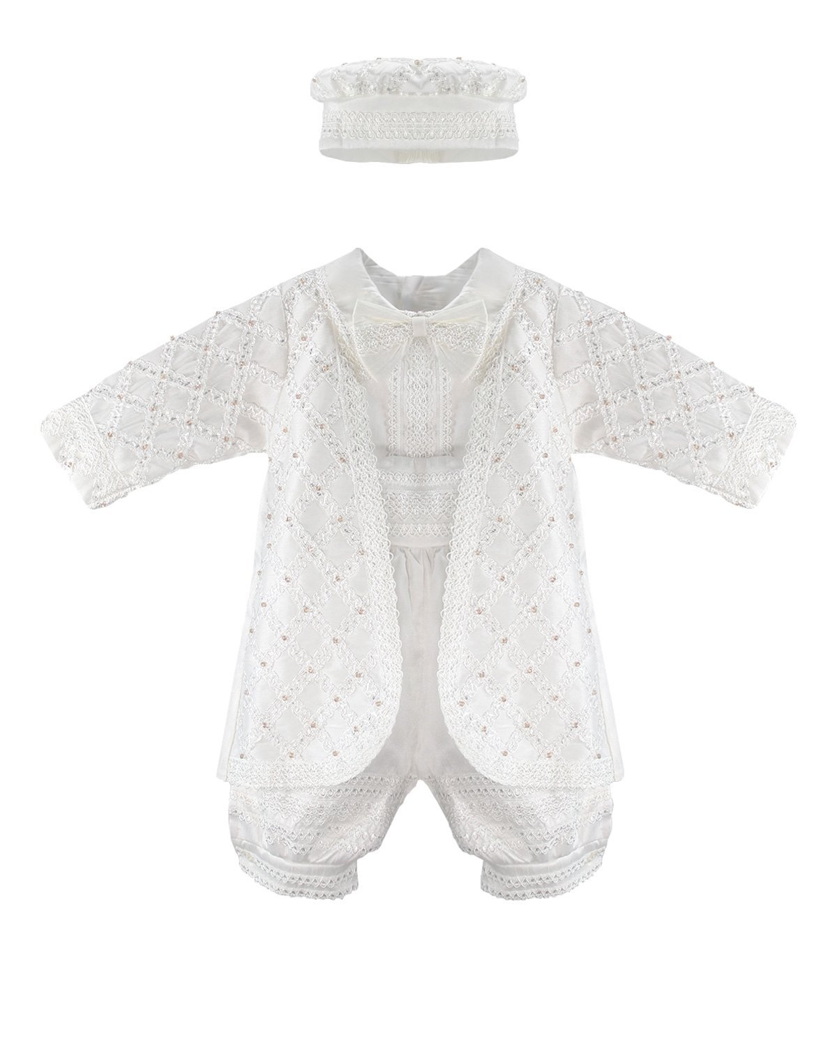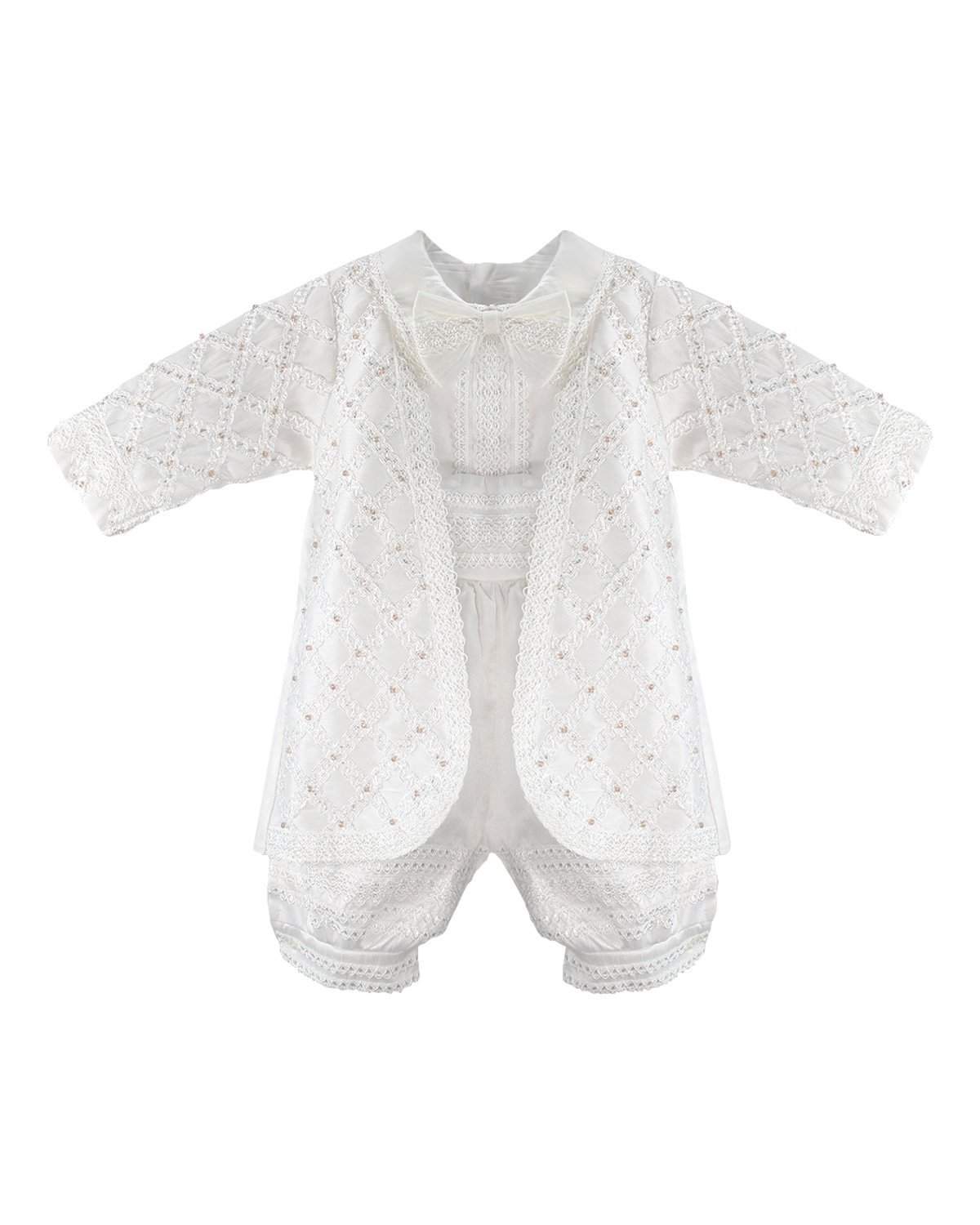 Boy's christening gown style, made of shantung with embroidered guipure details, crystal beading, and pearls. Elegant design with diamond-shaped embroidery and front buttons.