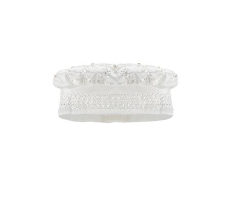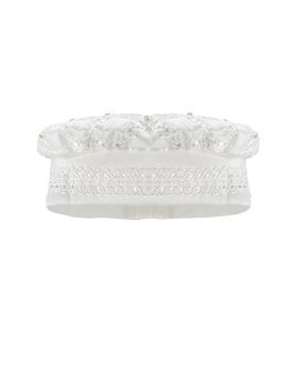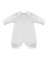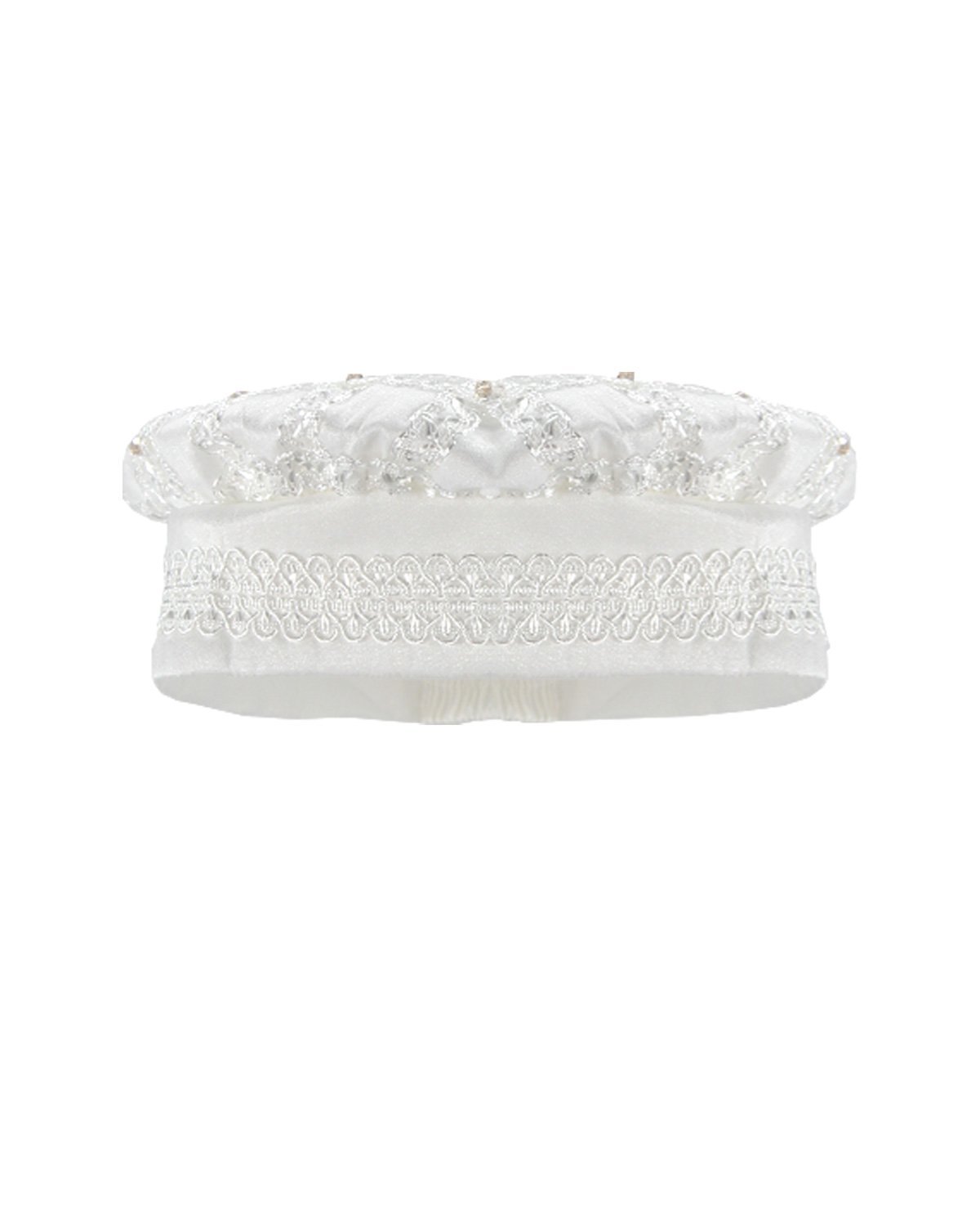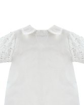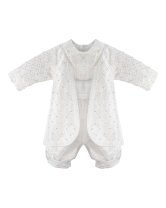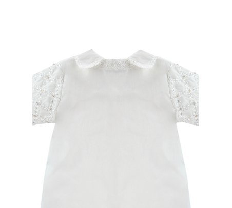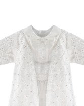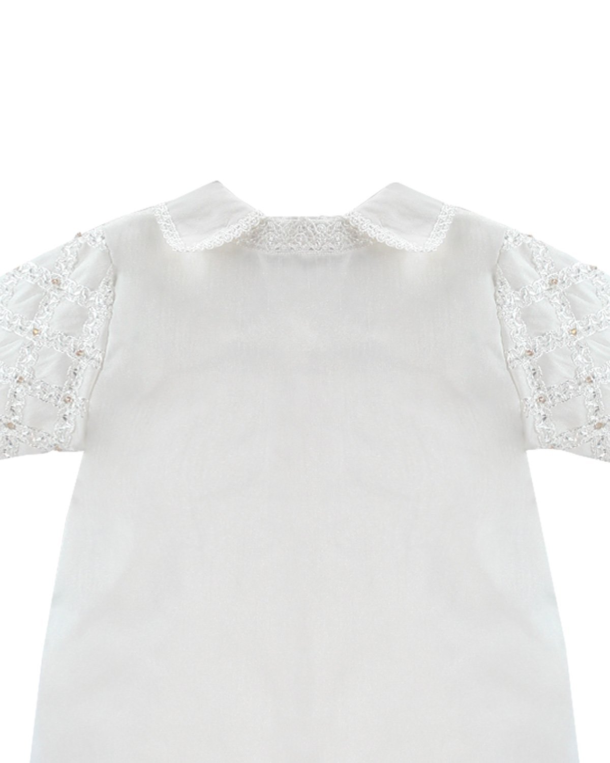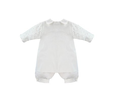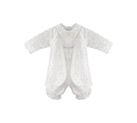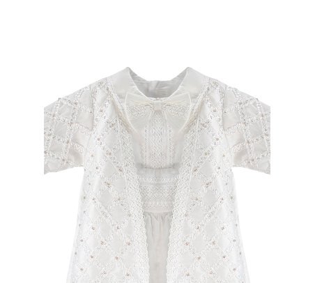 Boy's christening gown style, made of shantung with embroidered guipure details, crystal beading, and pearls. Elegant design with diamond-shaped embroidery and front buttons.