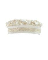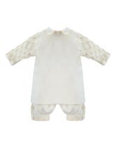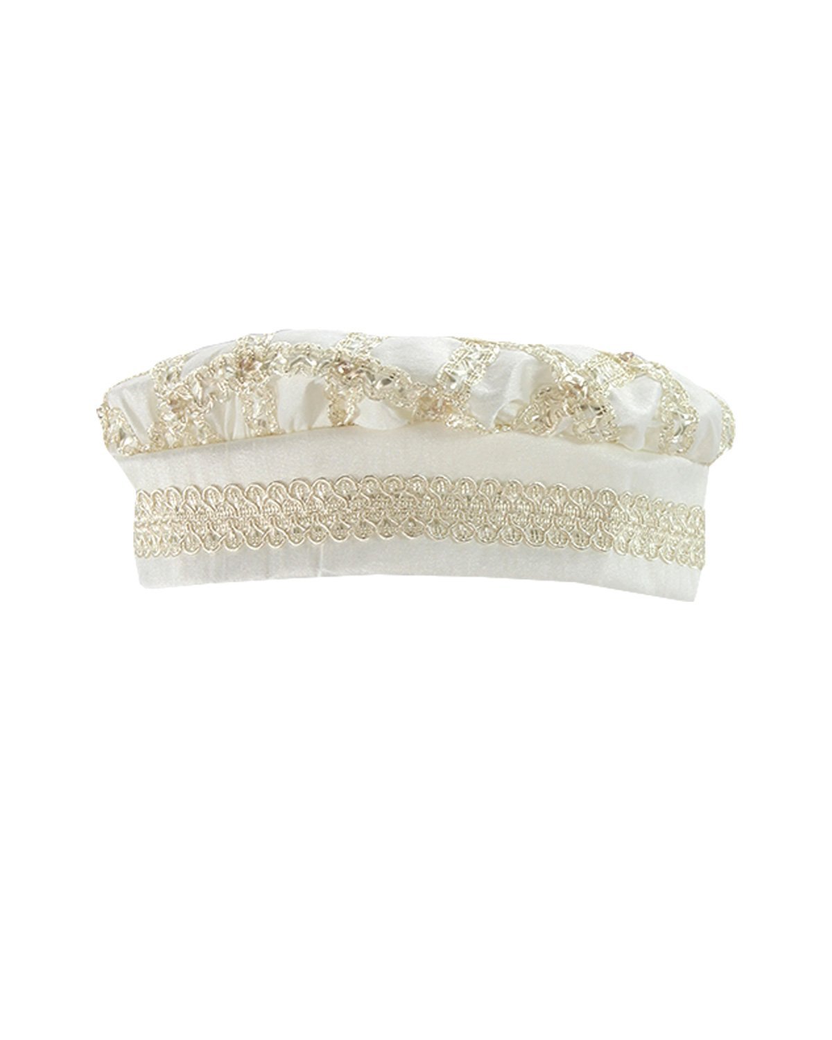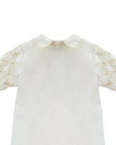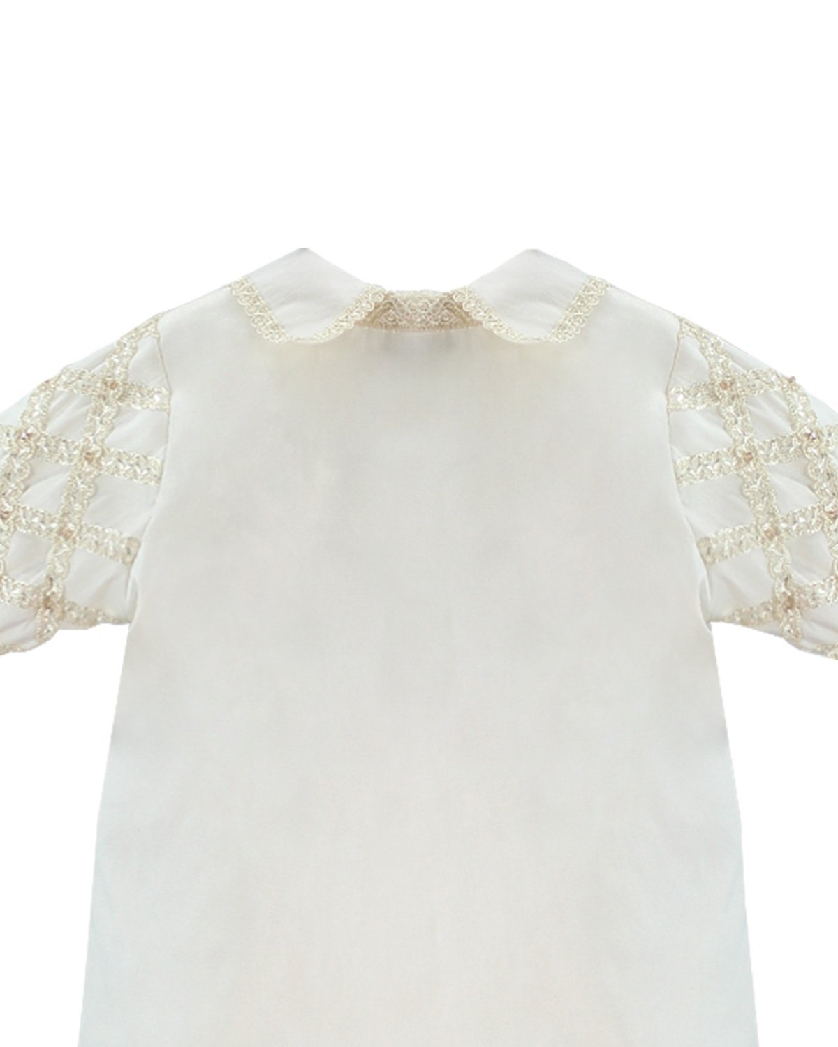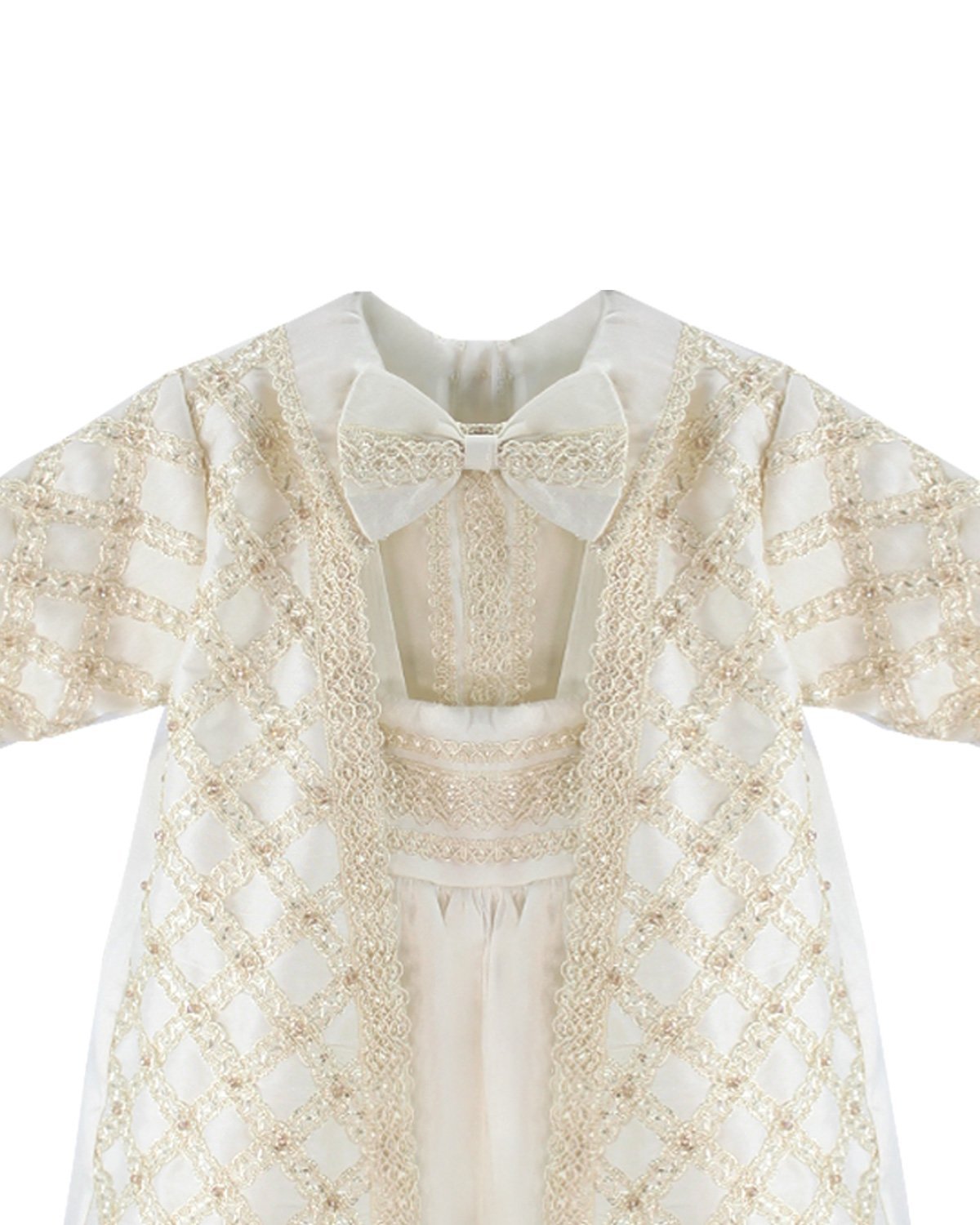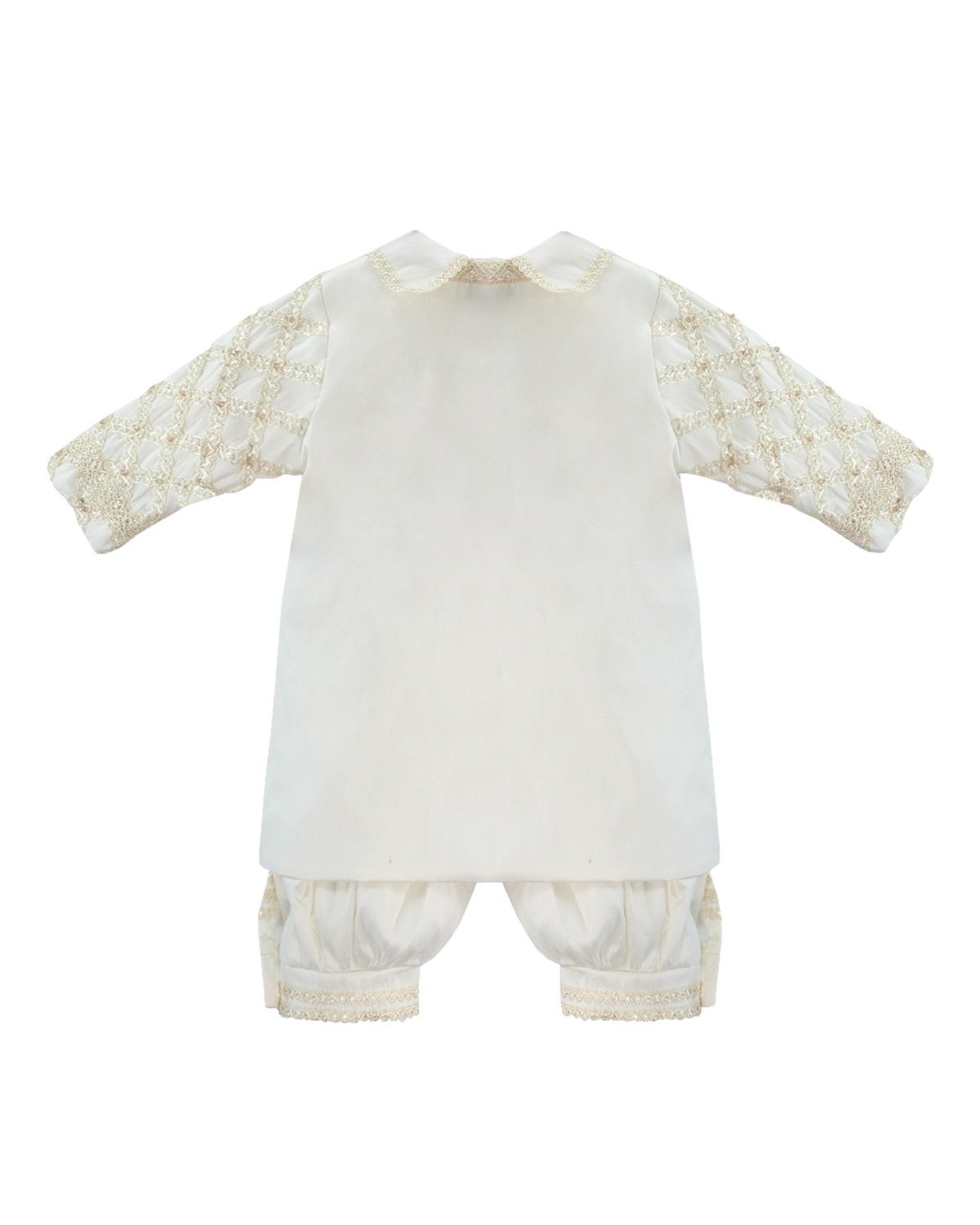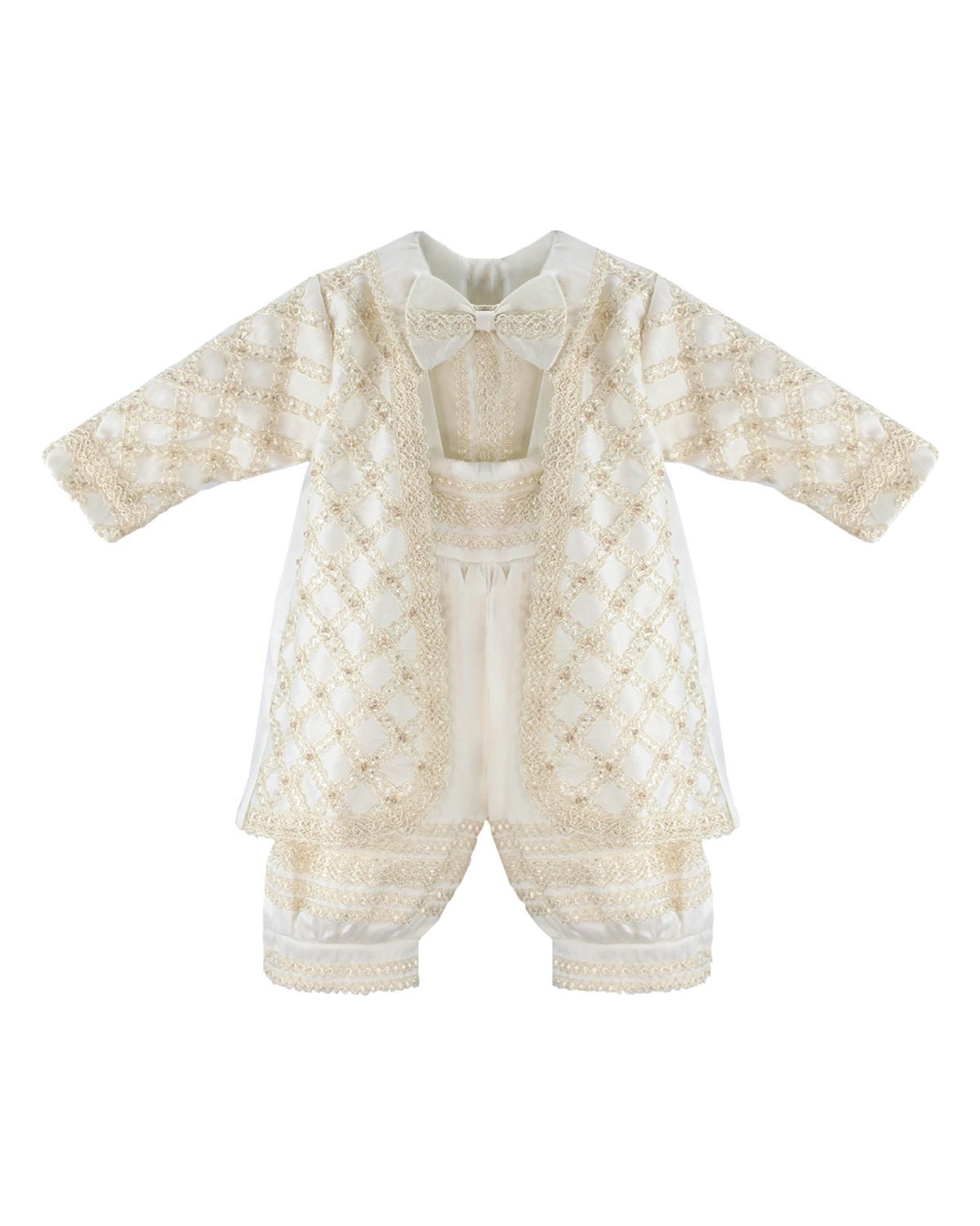 Boy's christening gown style, made of shantung with embroidered guipure details, crystal beading, and pearls. Elegant design with diamond-shaped embroidery and front buttons.