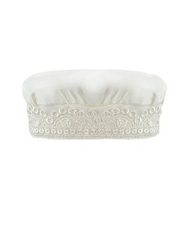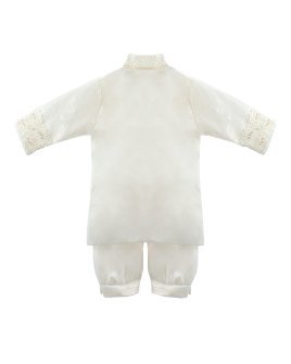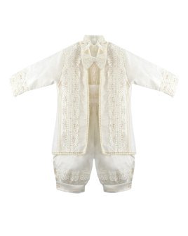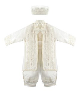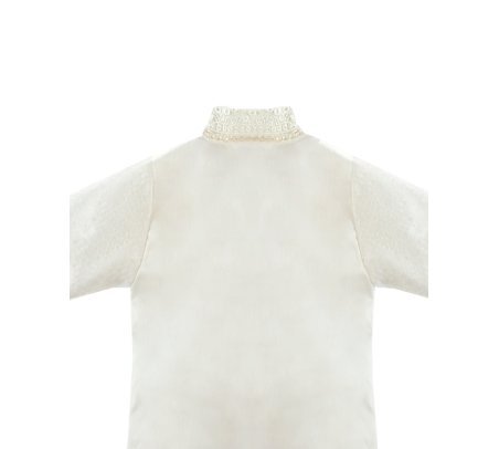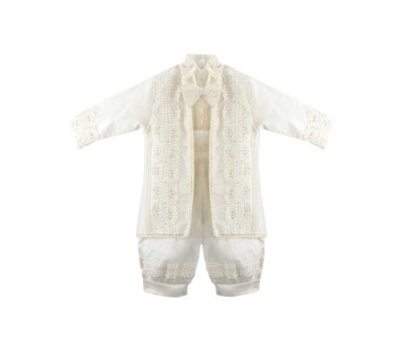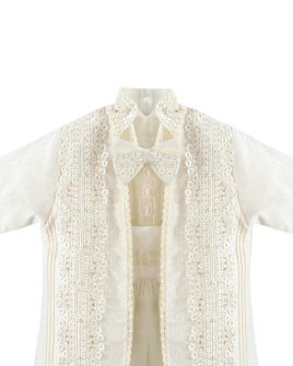 Boy's christening gown style, made of shantung with embroidered guipure, lace, crystal beading, and pearls. Elegant details with front buttons.
