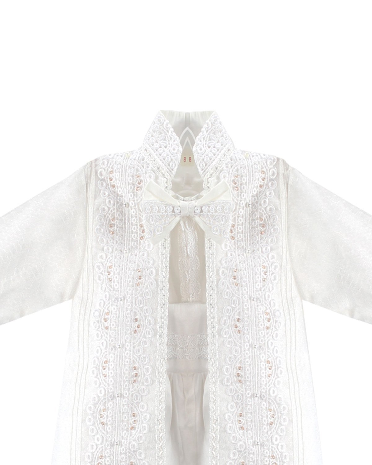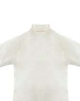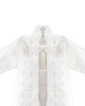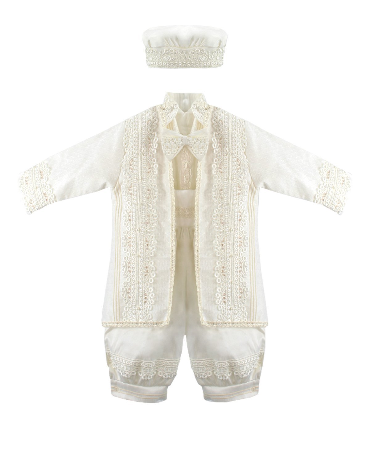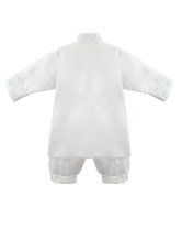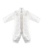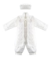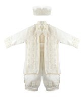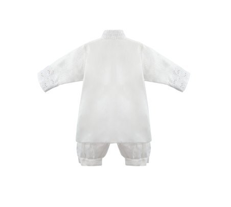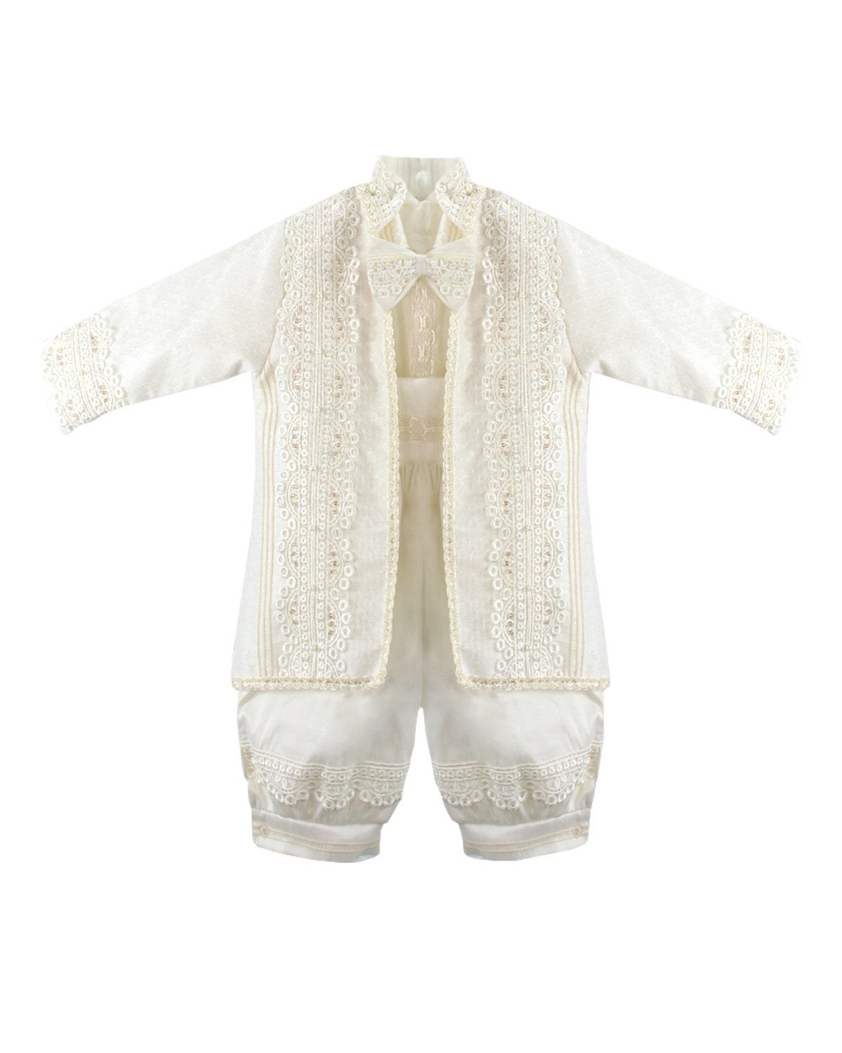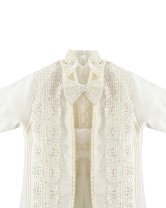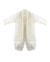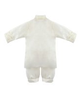 Boy's christening gown style, made of shantung with embroidered guipure, lace, crystal beading, and pearls. Elegant details with front buttons.