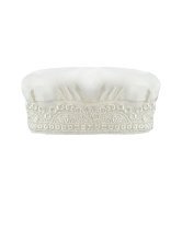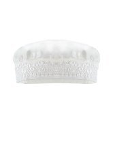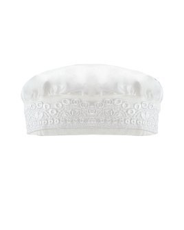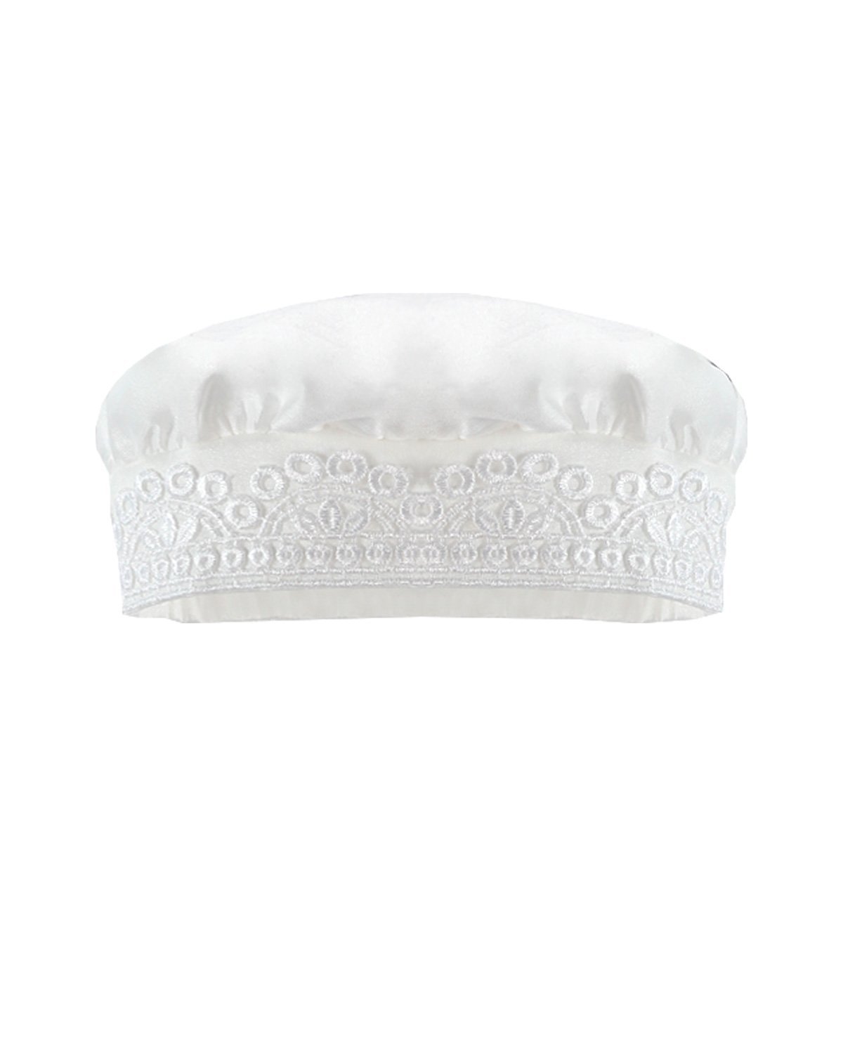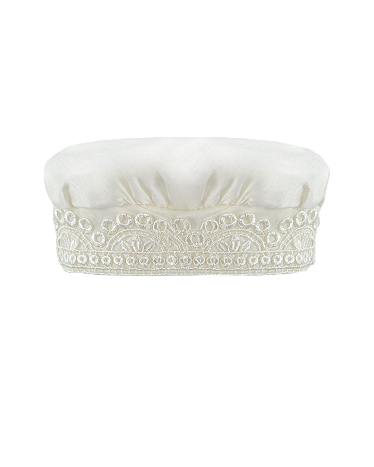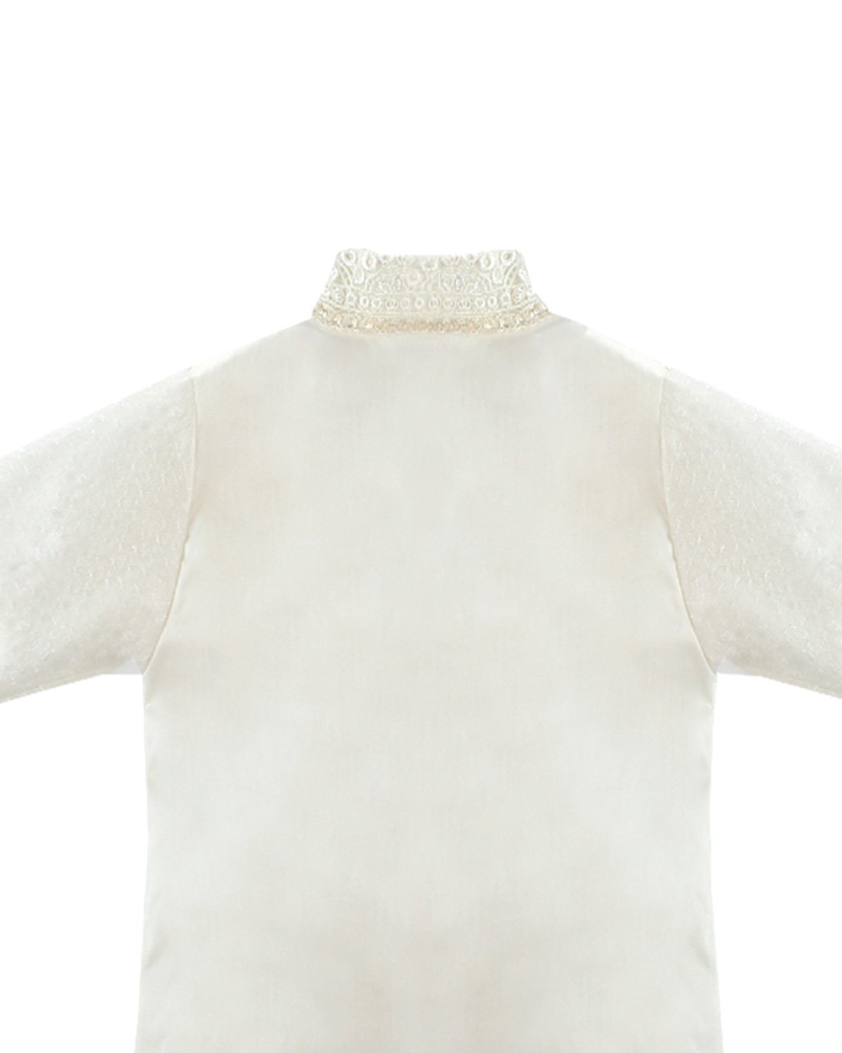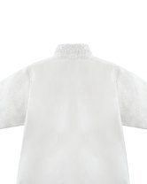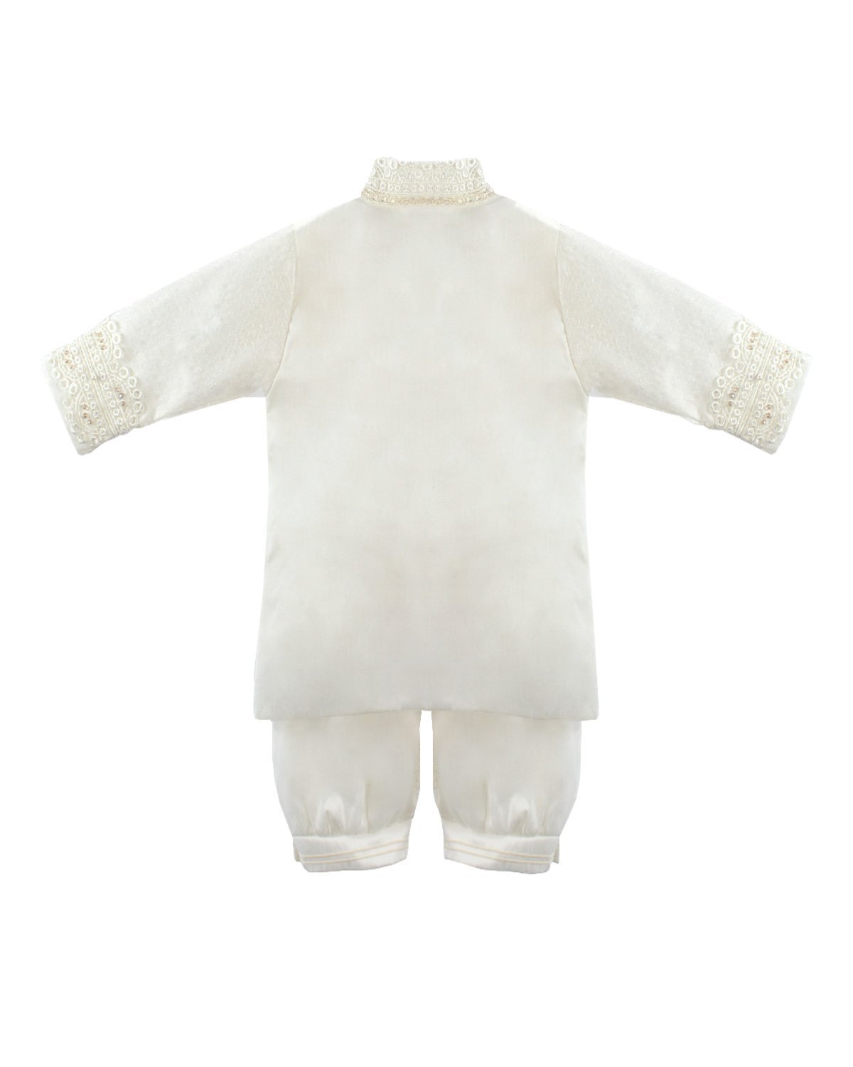 Boy's christening gown style, made of shantung with embroidered guipure, lace, crystal beading, and pearls. Elegant details with front buttons.