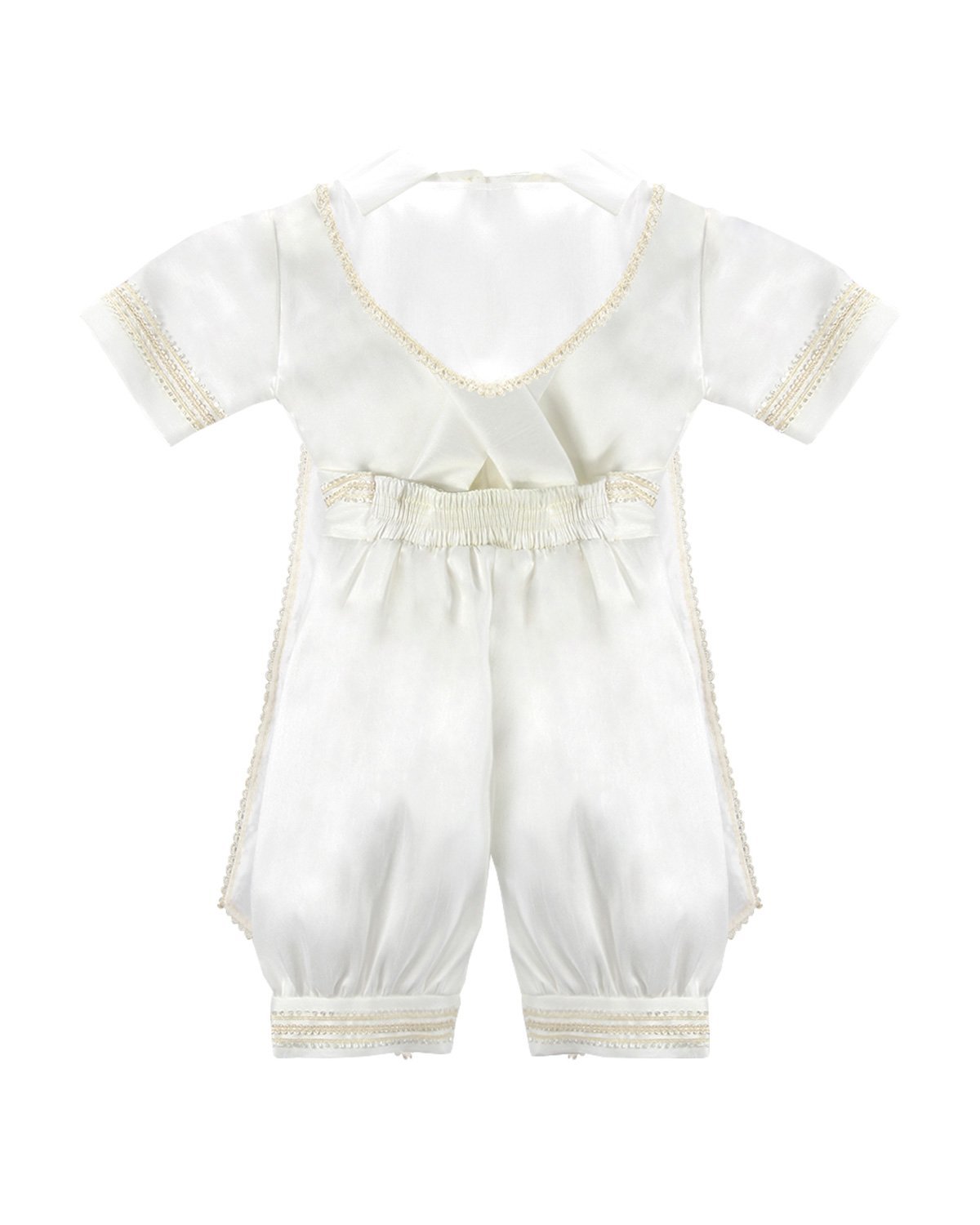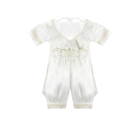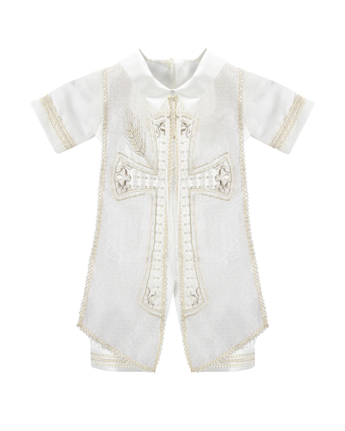 Elegant shantu outfit with puffed shorts, decorative shirt, and a stole with rhinestones, pearls, cross and wheat embroidery, and edge trim.