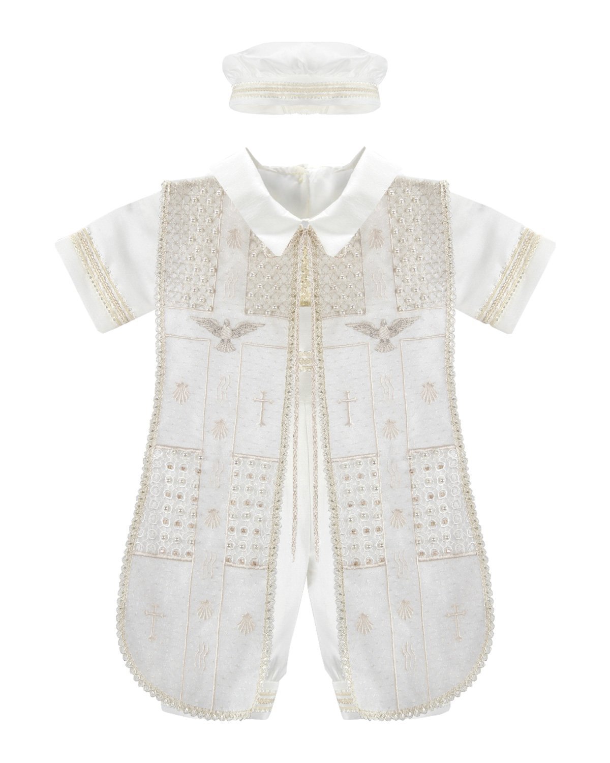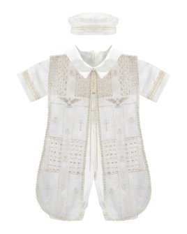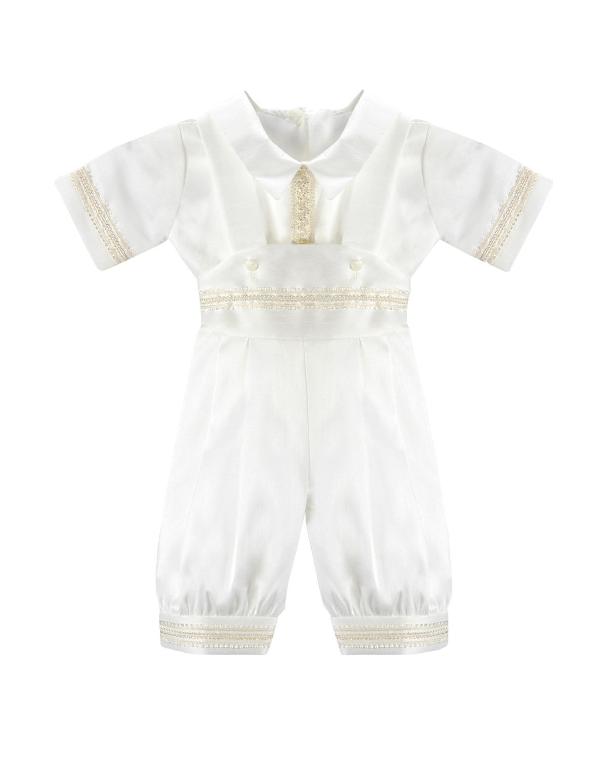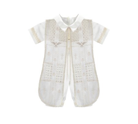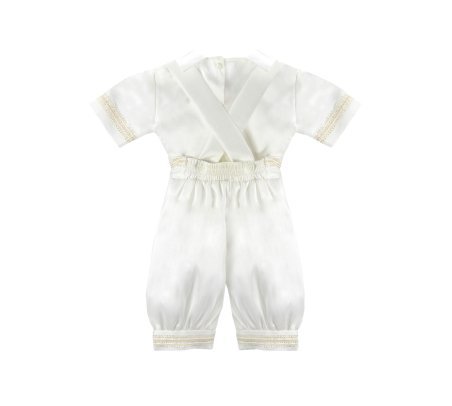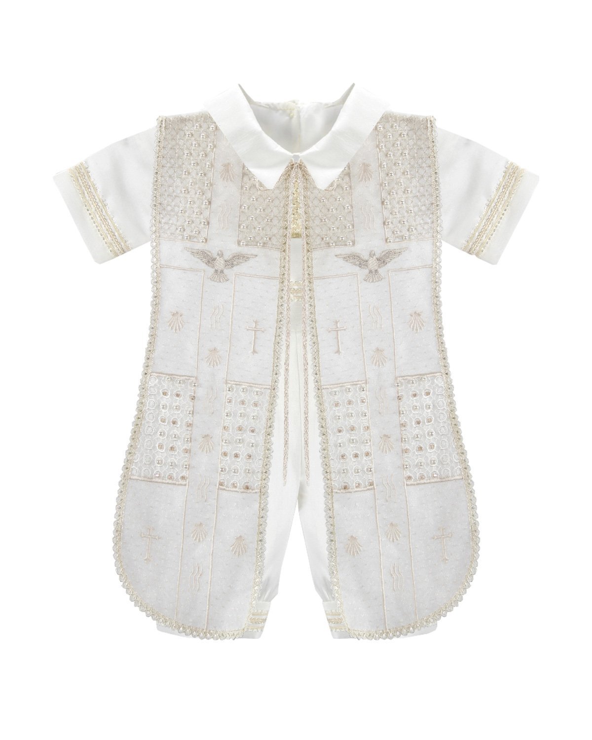 Shantu outfit with puffed shorts, decorative shirt, and a stole with rhinestones, pearls, and embroidery of the Holy Spirit and a cross.