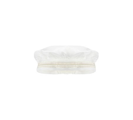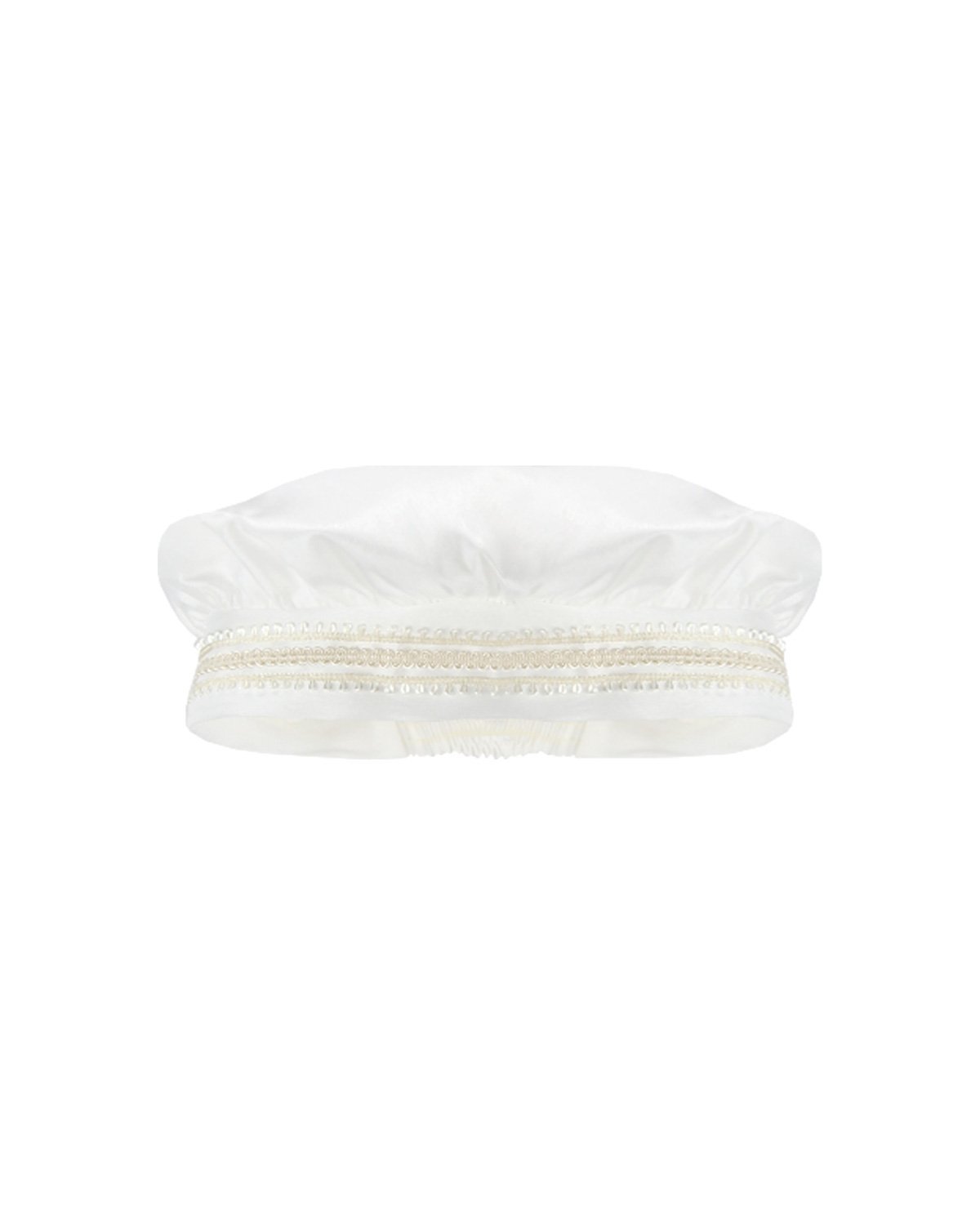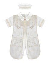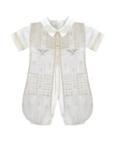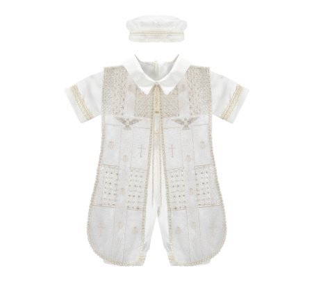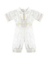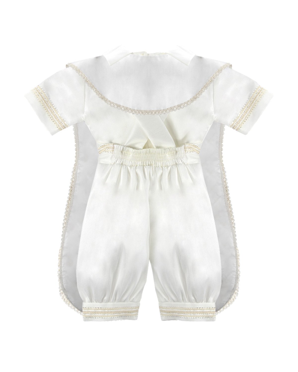 Shantu outfit with puffed shorts, decorative shirt, and a stole with rhinestones, pearls, and embroidery of the Holy Spirit and a cross.