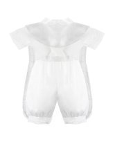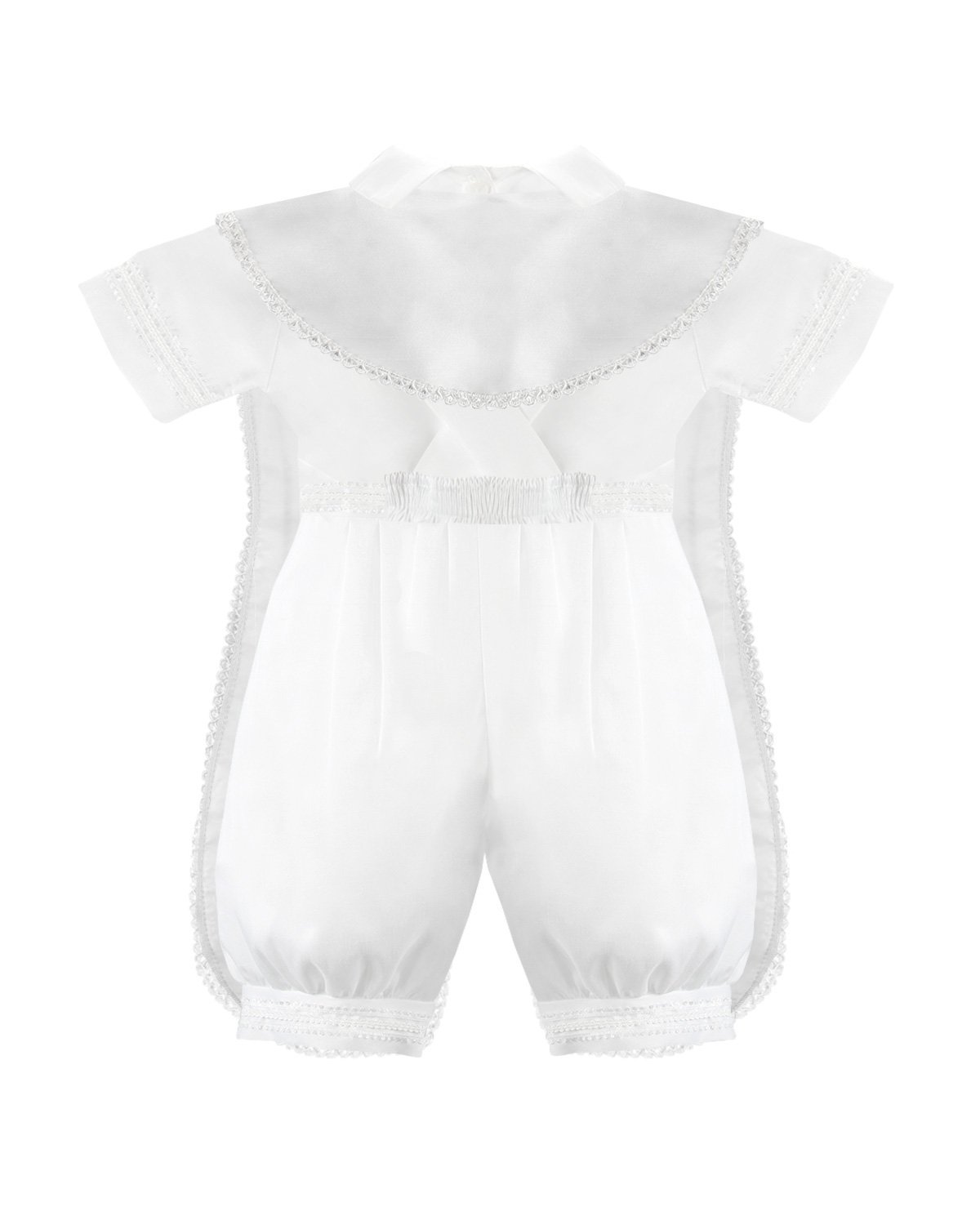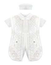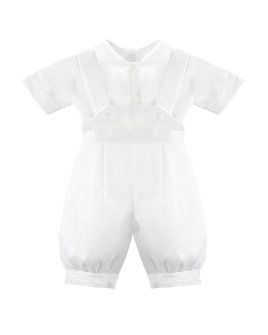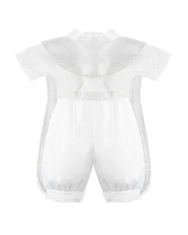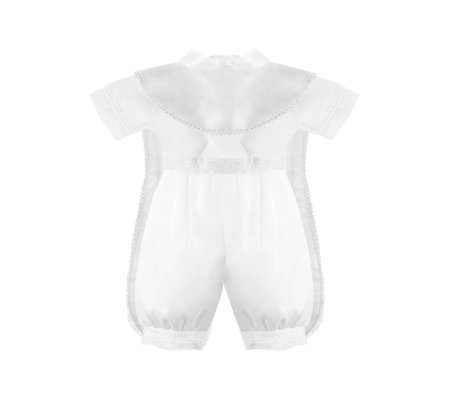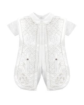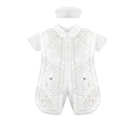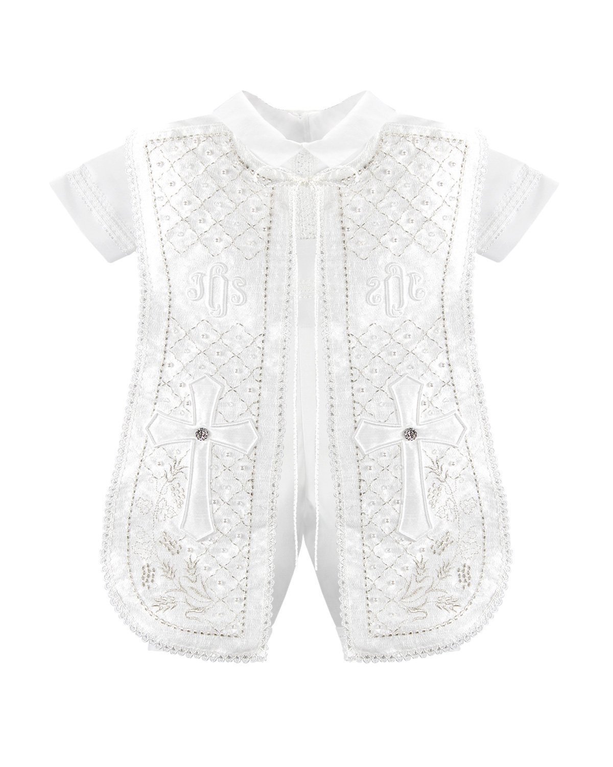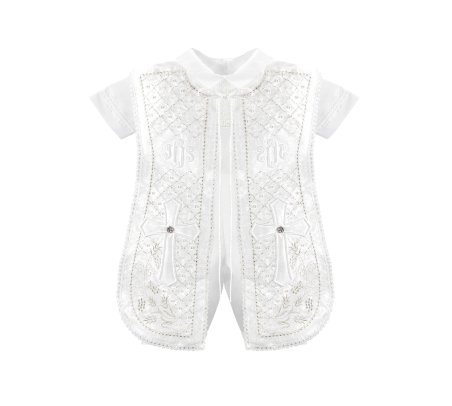 Shantu outfit with puffed shorts, decorative shirt, and a stole with rhinestones, pearls, and embroidery of JHS initials and a cross.