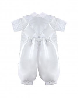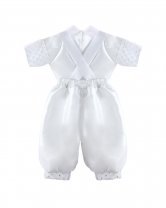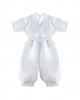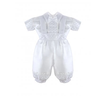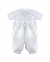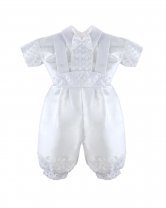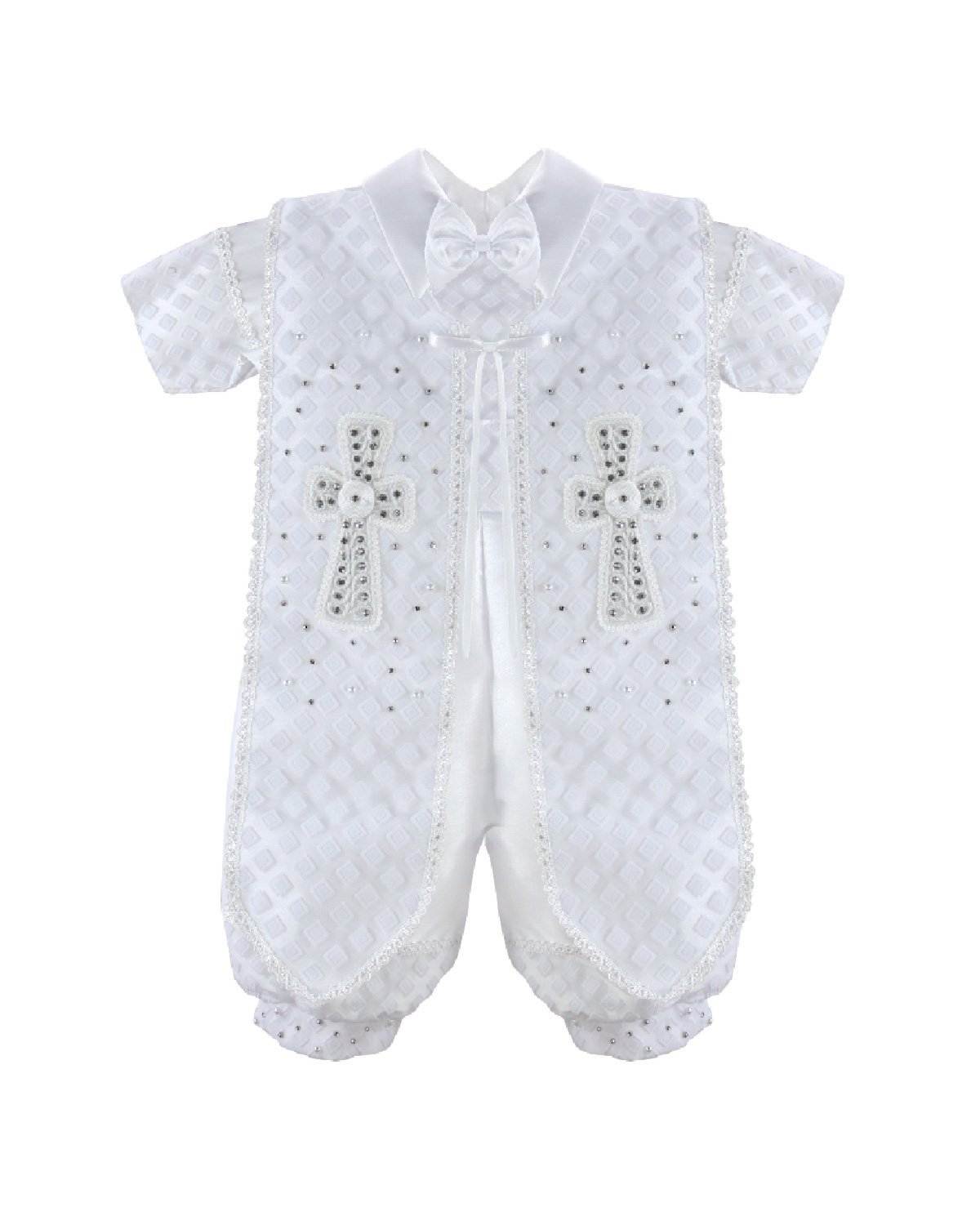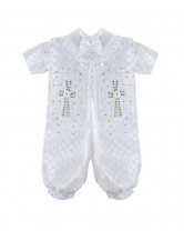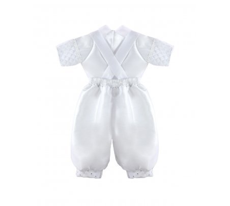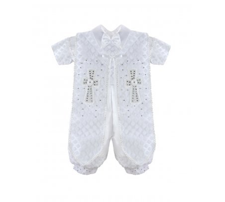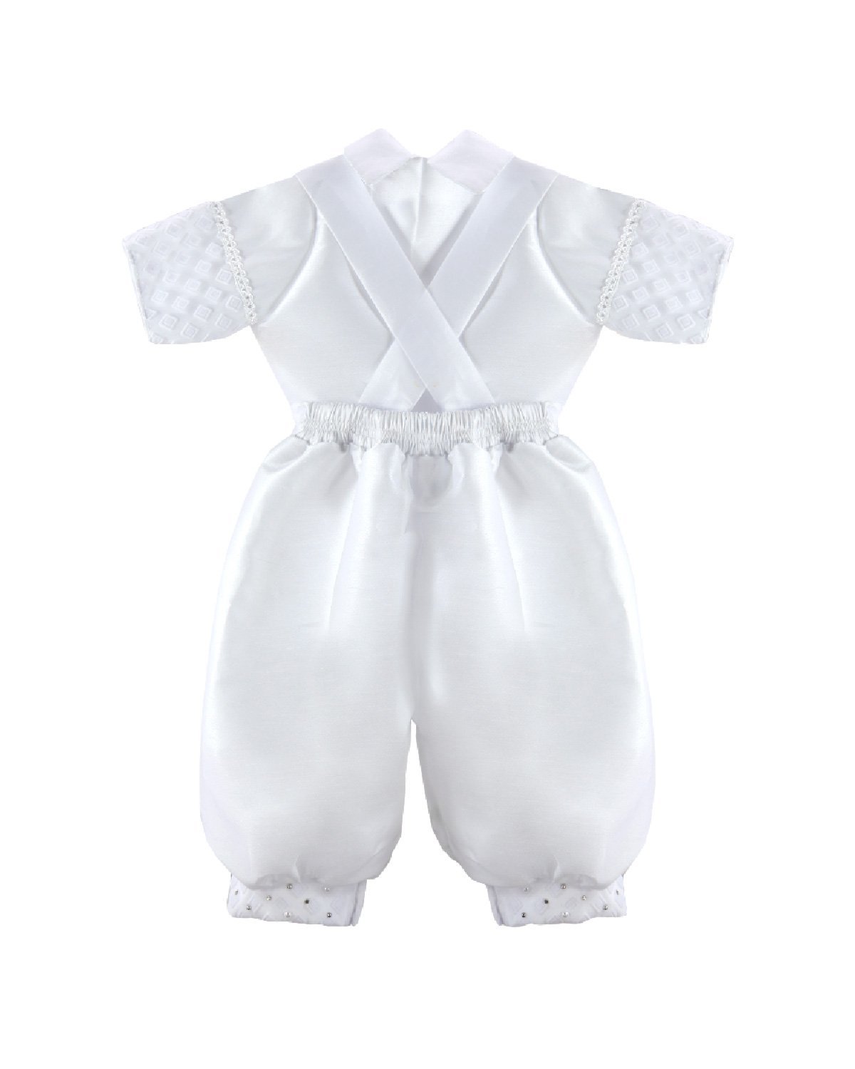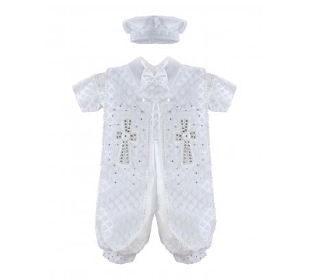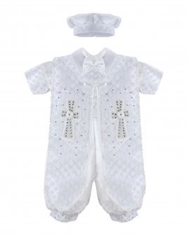 The Manuel S-002 Baptism Outfit for boys features a refined and spiritually inspired design. Crafted from textured shantu fabric, this set includes puffed shorts with suspenders and a short-sleeve shirt decorated with delicate trim on the sleeves and hems. The stole stands out with rhinestones, pearls, and embroidered crosses on the front, adding a meaningful and elegant touch. A matching bonnet is included, completing a polished and harmonious baptism outfit.