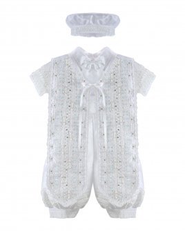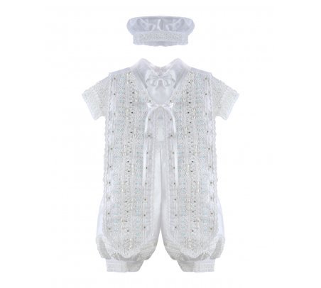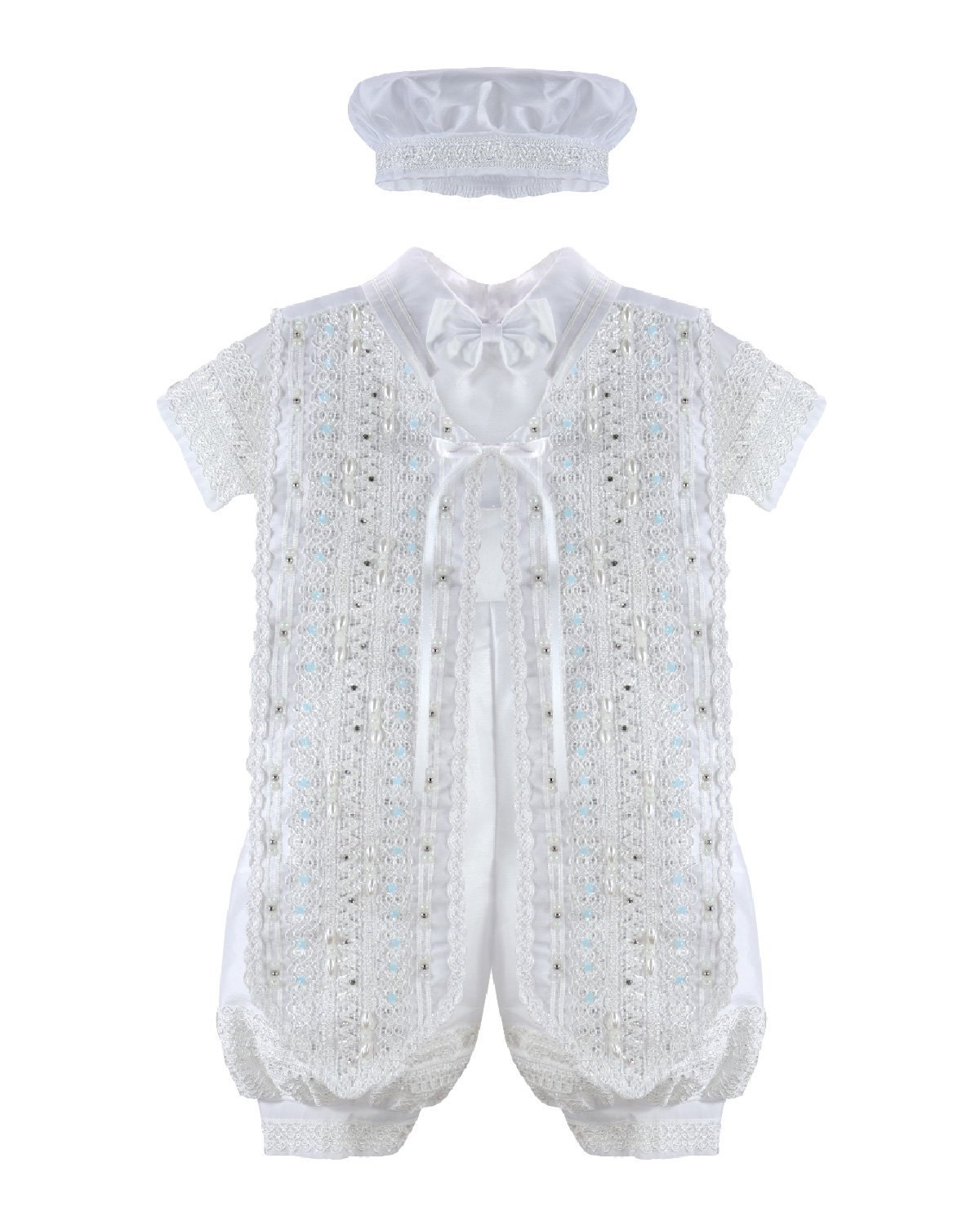 Boy's Baptism Outfit – Josue S-003 Model: Shantu outfit with puffed shorts, decorative shirt, embellished stole with trim, rhinestones, and pearls, and matching bonnet included.