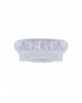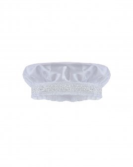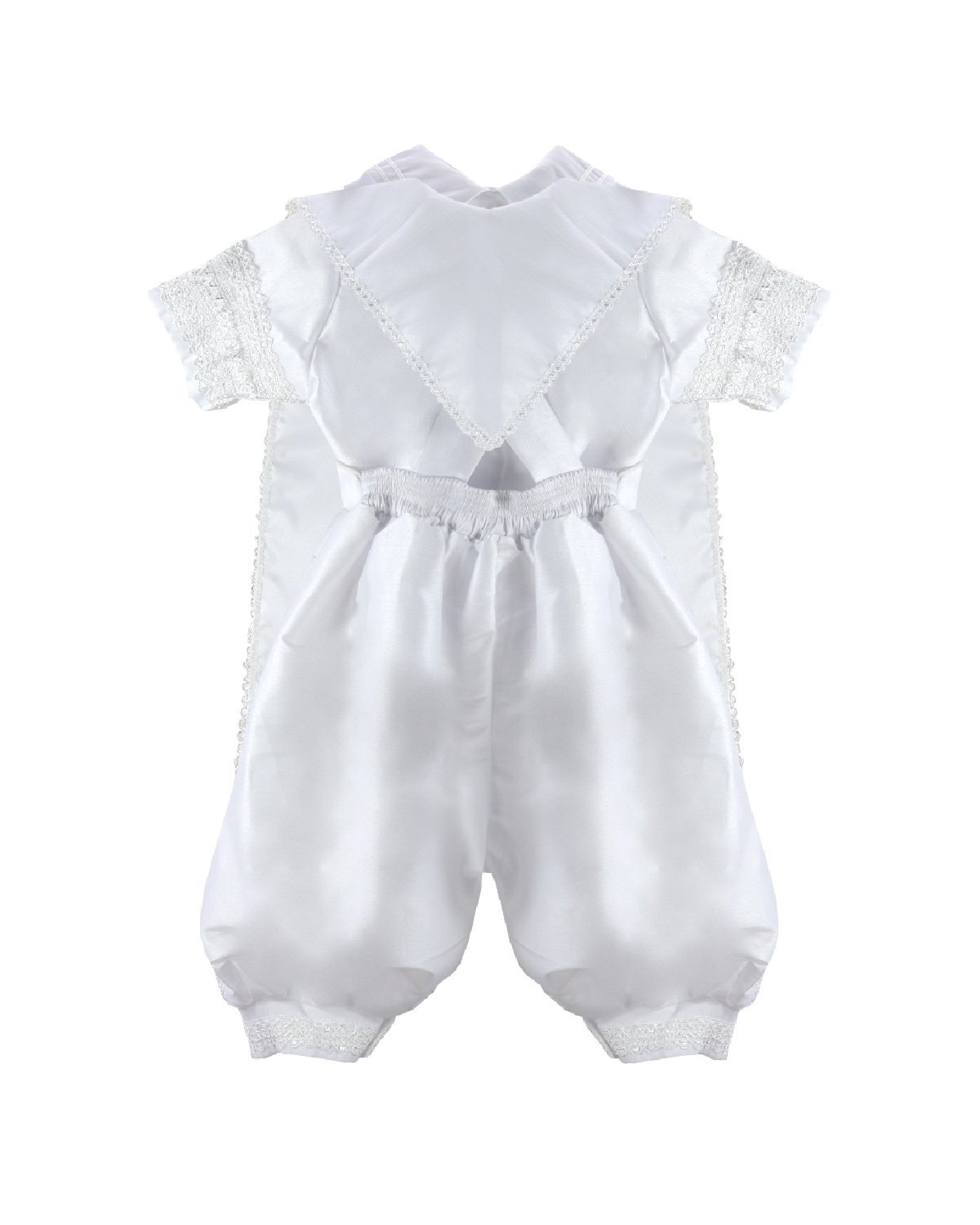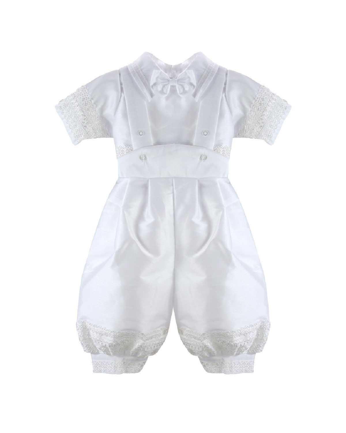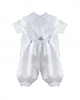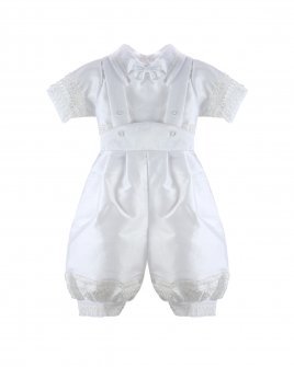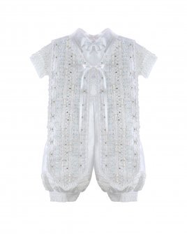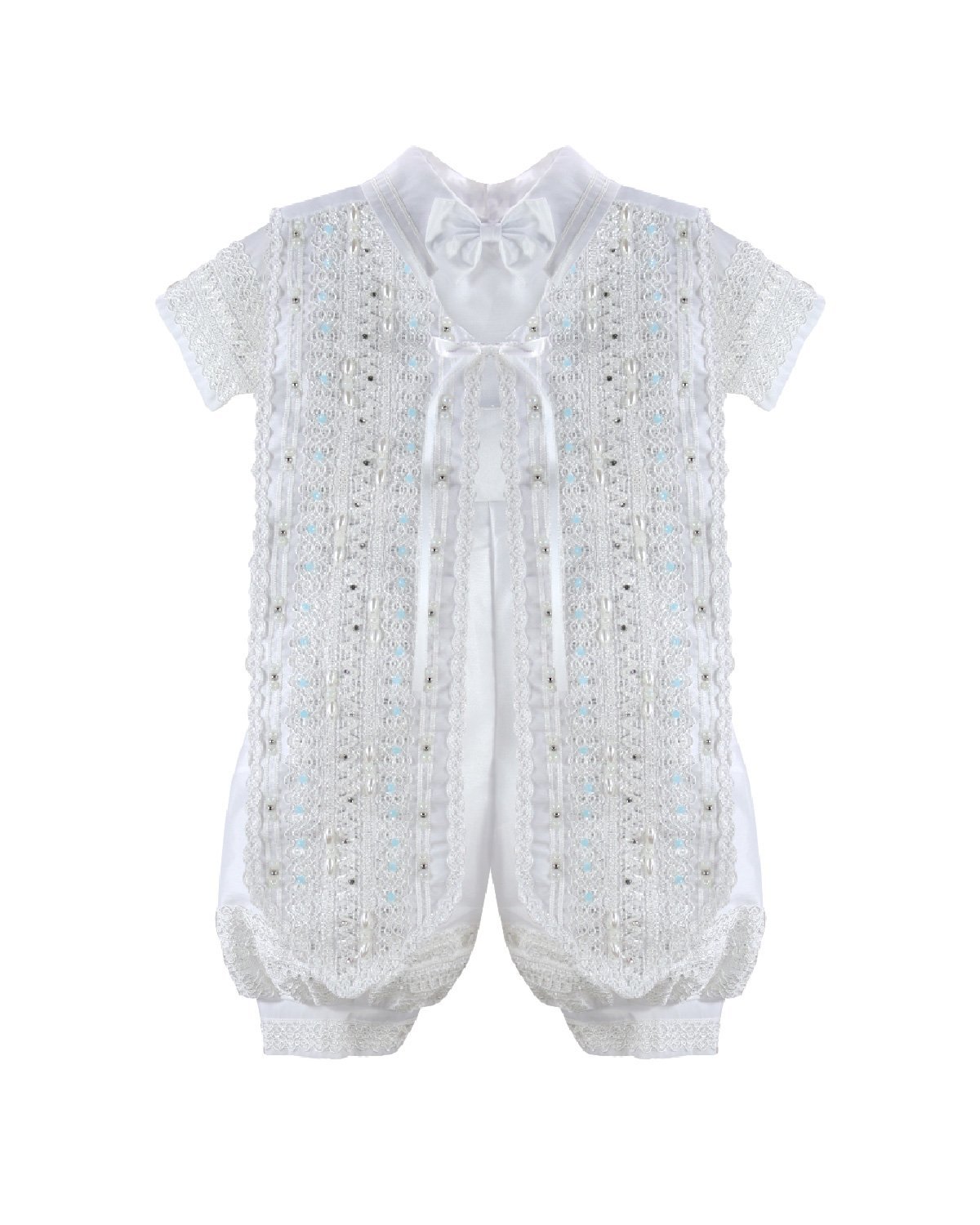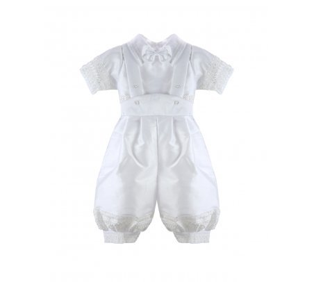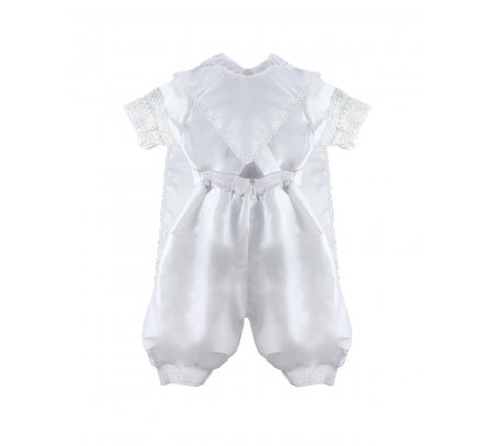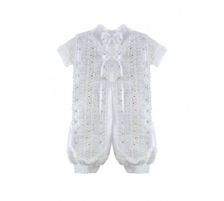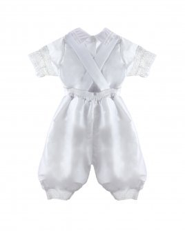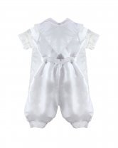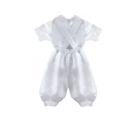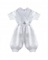 The Josue S-003 Baptism Outfit for boys features a refined and elegant design. Crafted from fine shantu fabric, this set includes puffed shorts with suspenders and a short-sleeve shirt decorated with delicate trim on the sleeves and hems. The stole stands out with vertical detailing, richly embellished with trim, rhinestones, and delicate pearls, creating a balanced and sophisticated look. A matching bonnet is included, completing a polished and memorable baptism outfit.