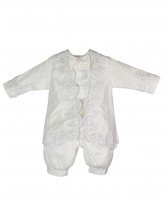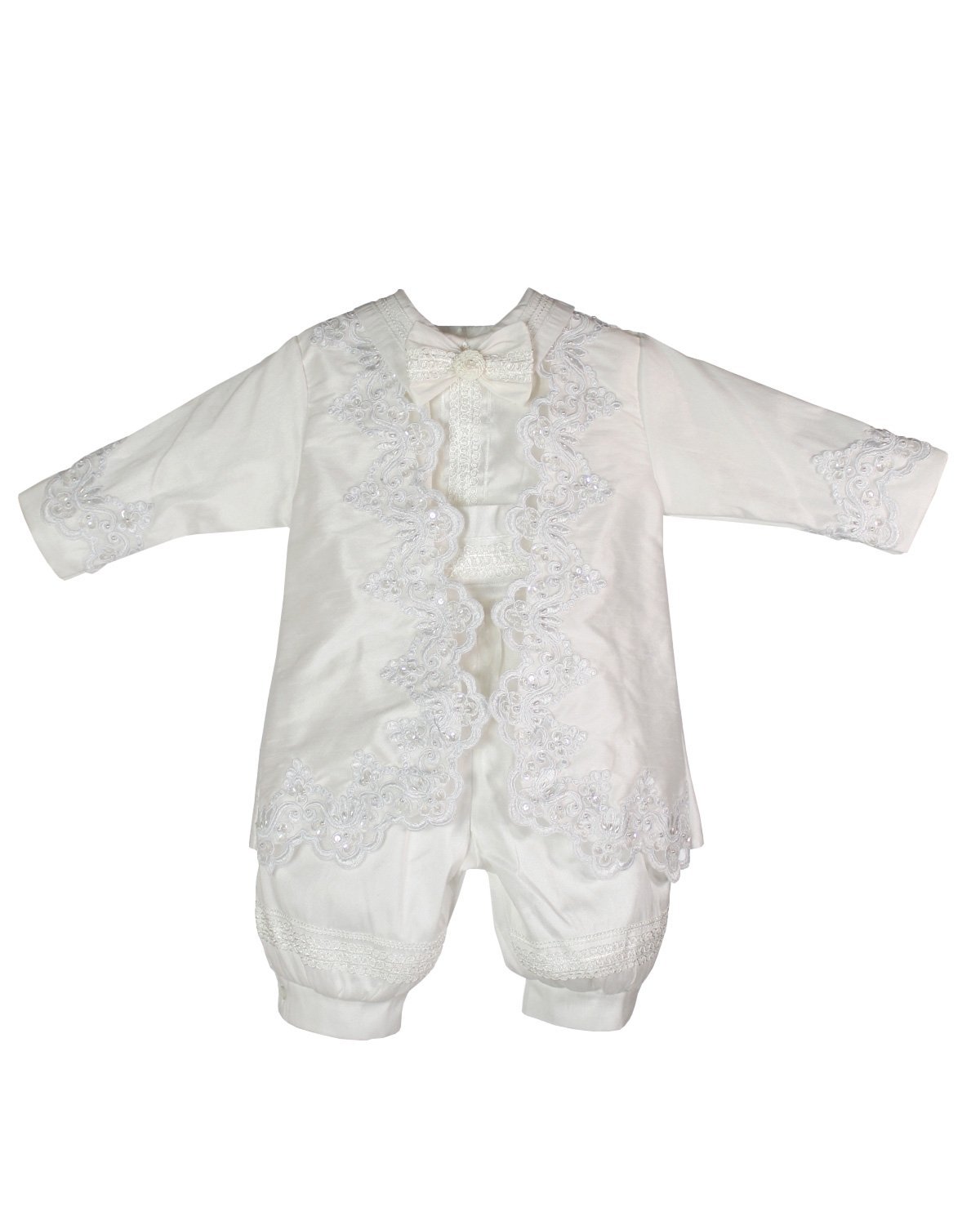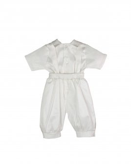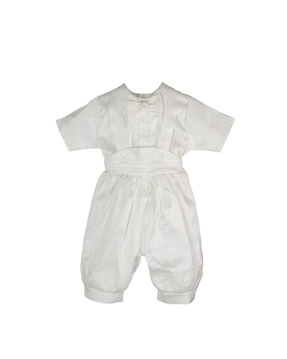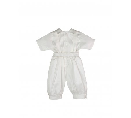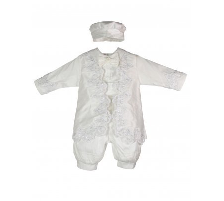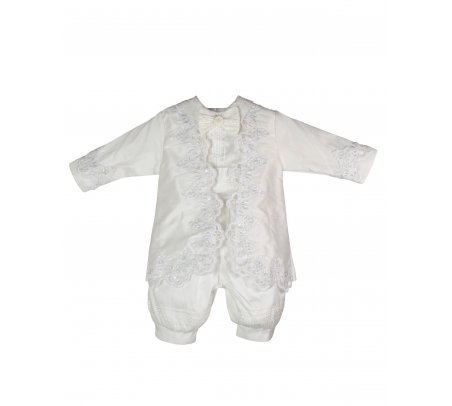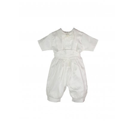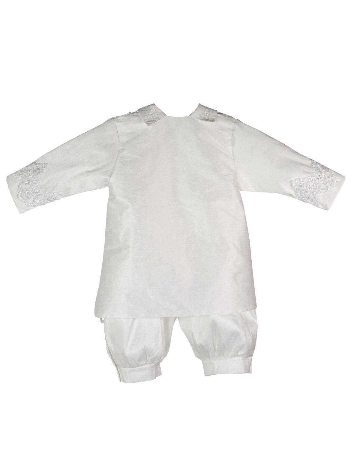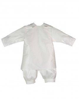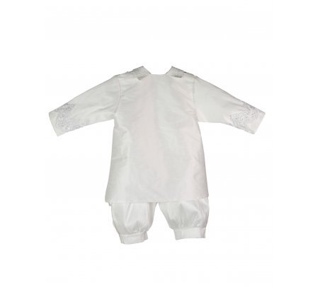 This boy's christening gown made of shantung presents scene details with rhinestones that gave it a touch of elegance and sophistication. Your baby will look like a true prince on his special day with this Maylin garment, a brand recognized for its quality and excellence.