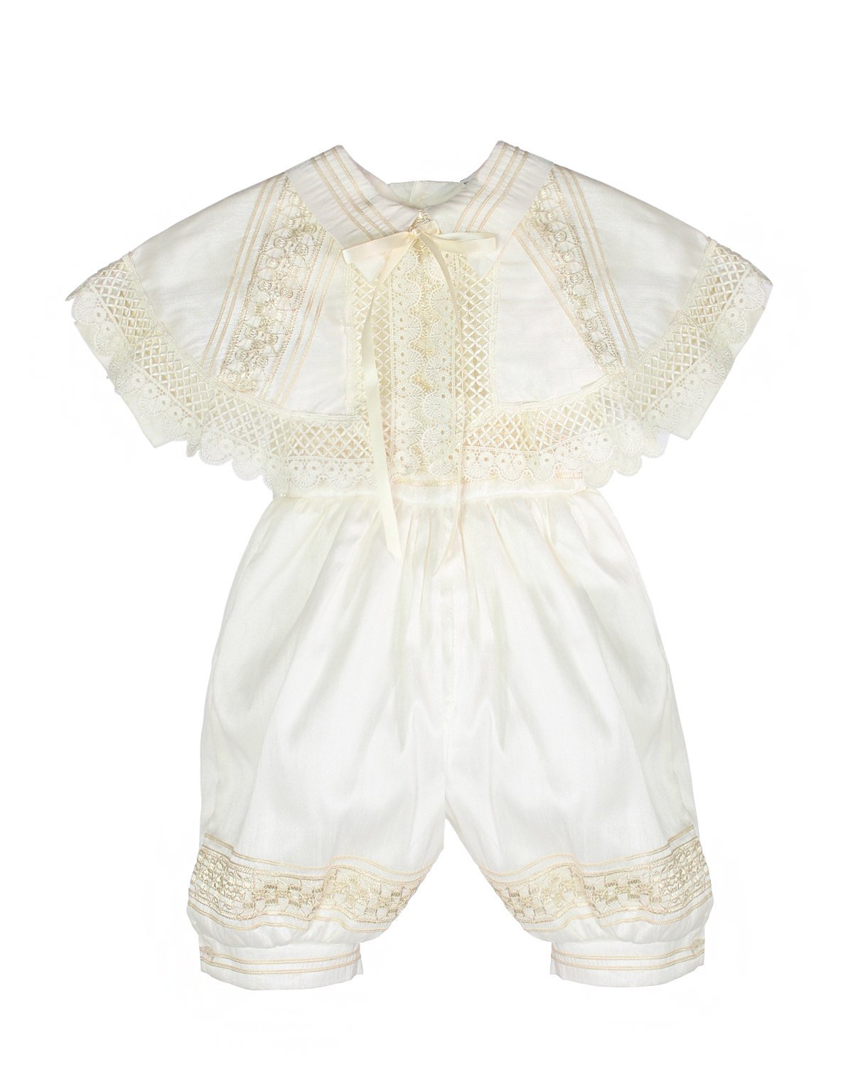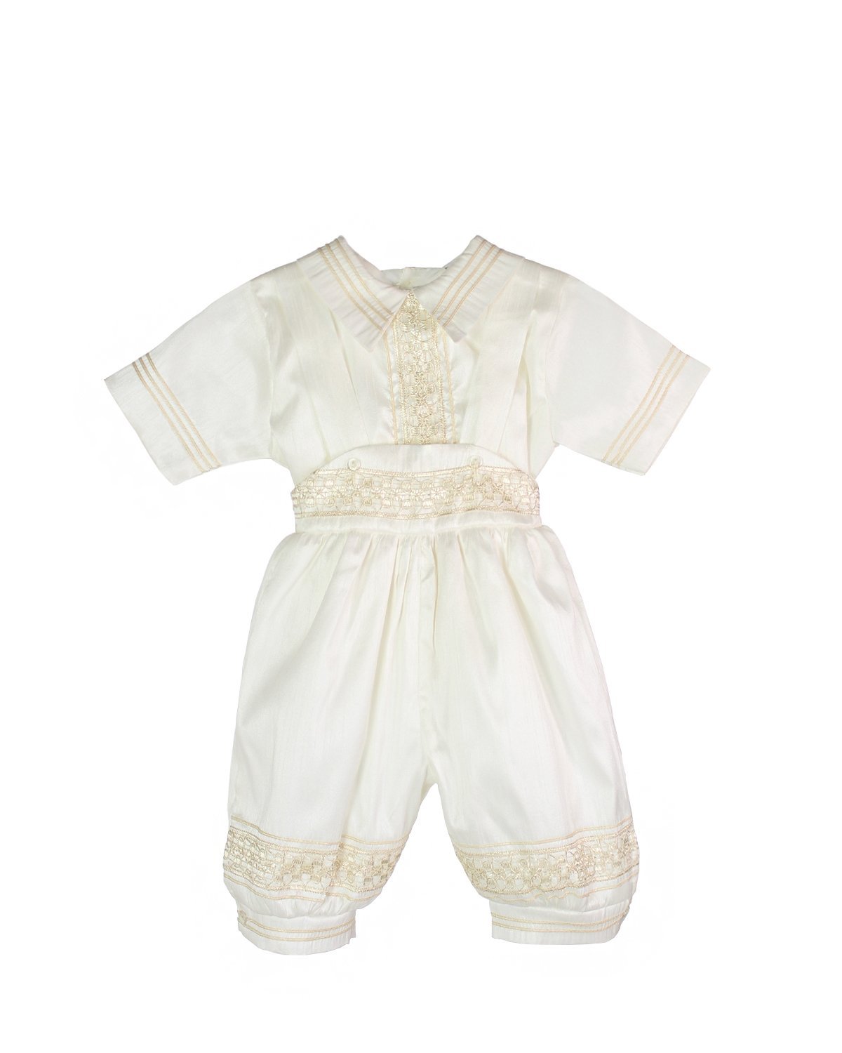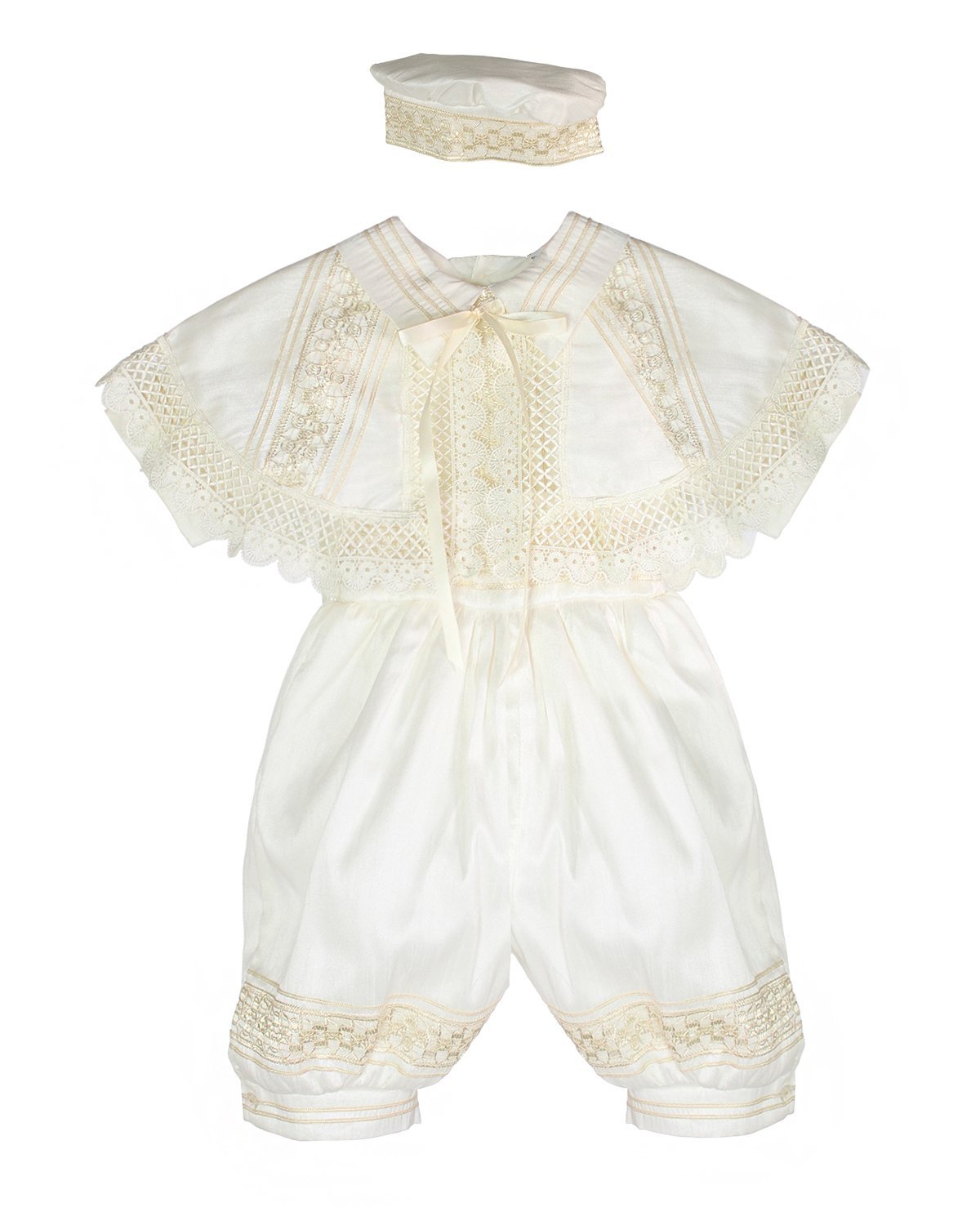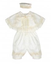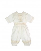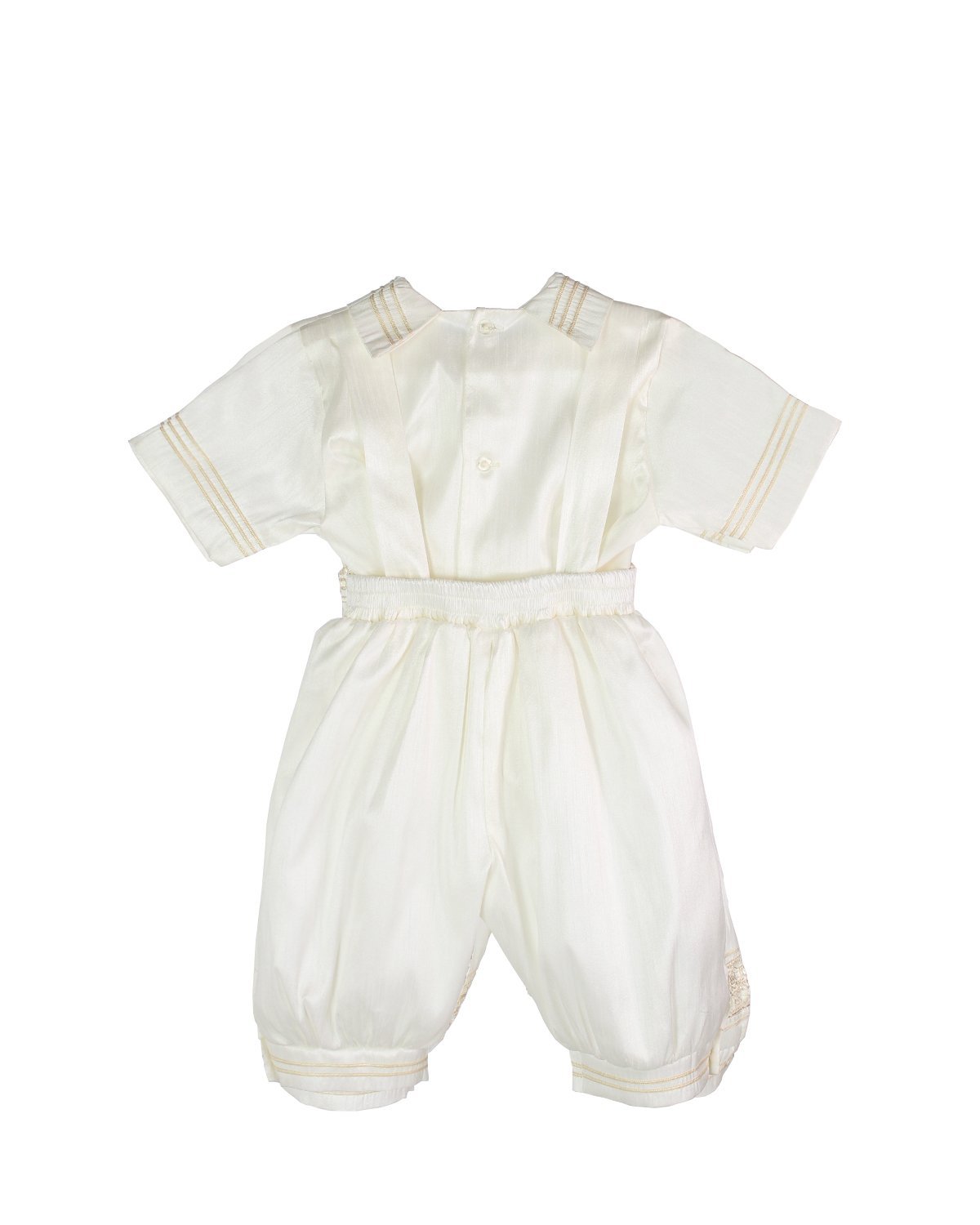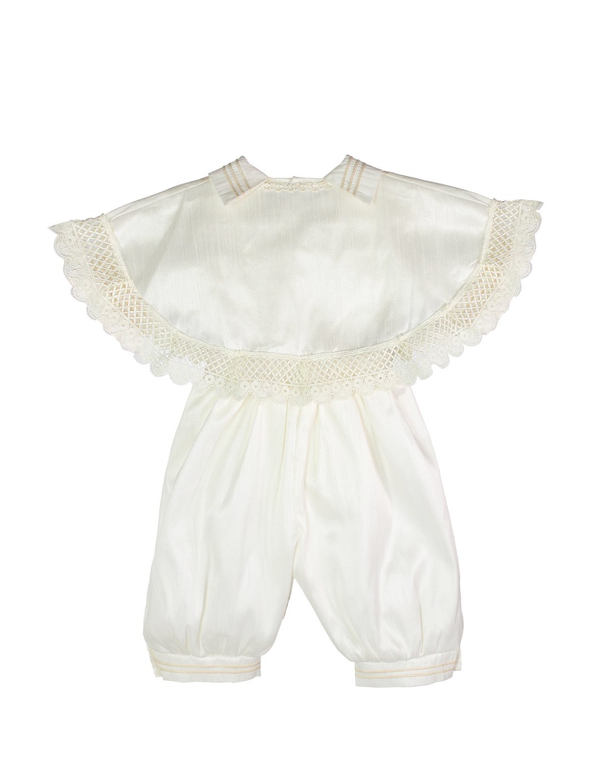Dress your little one with elegance for any special occasion with our beautiful boy's christening gown. Crafted from high-quality shantung fabric, this ensemble features fine embroidery on the pants and cape, and a slightly embroidered shirt. Comfort and style come together in this perfect ensemble for formal events and ceremonies.