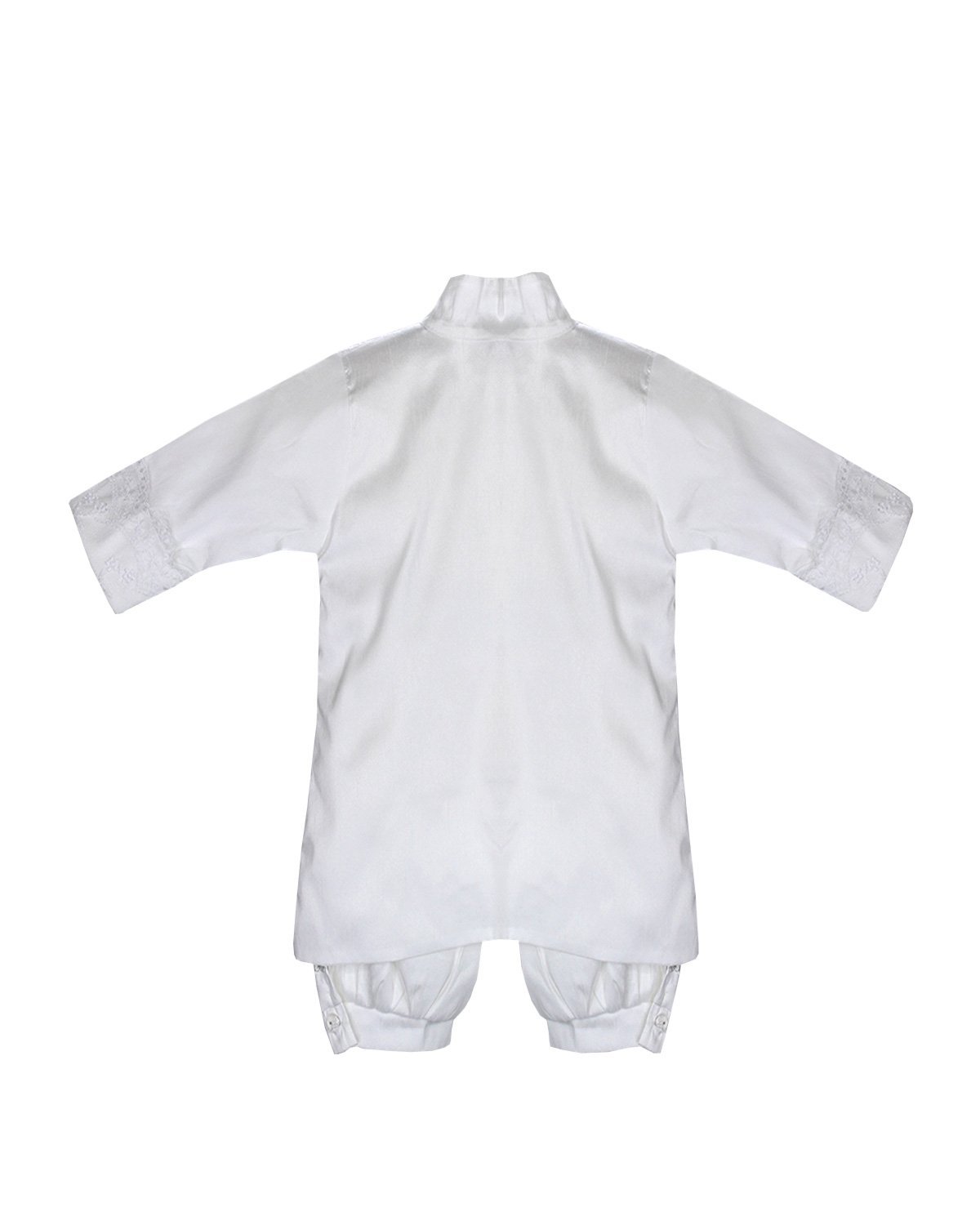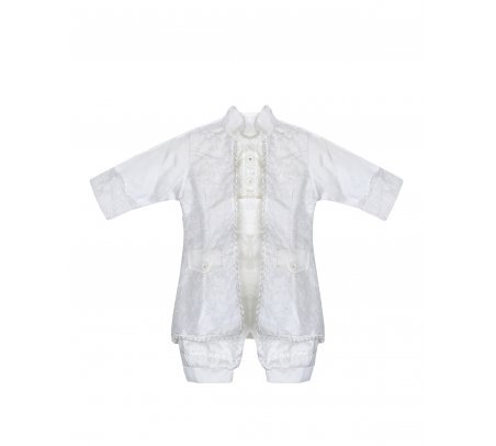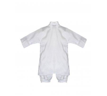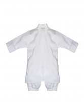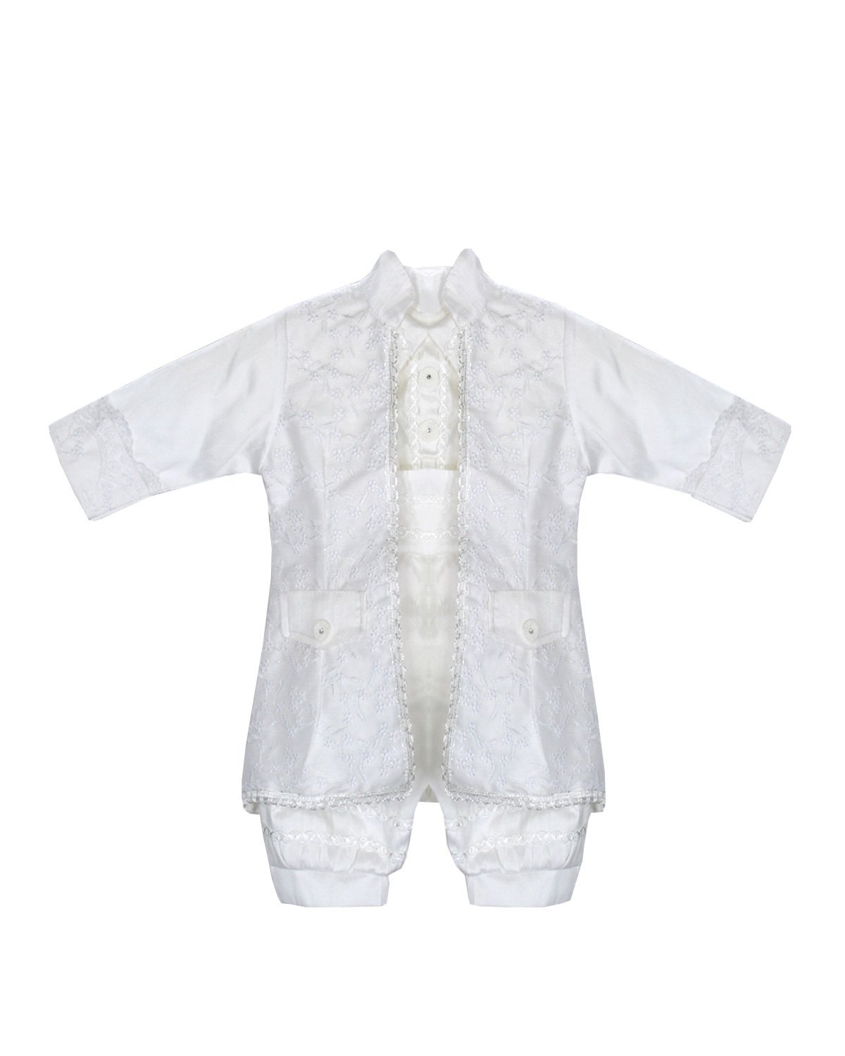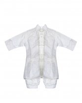 Dress your little prince in our exquisite boy's christening gown. Crafted from shantung, this set includes finely embroidered pants and shirt. The shantung jacket features intricate embroidery and a stylish border. Perfect for special occasions, our boy's christening gown guarantees a charming and dashing look.