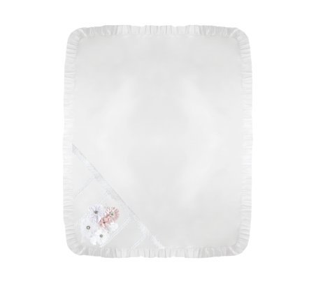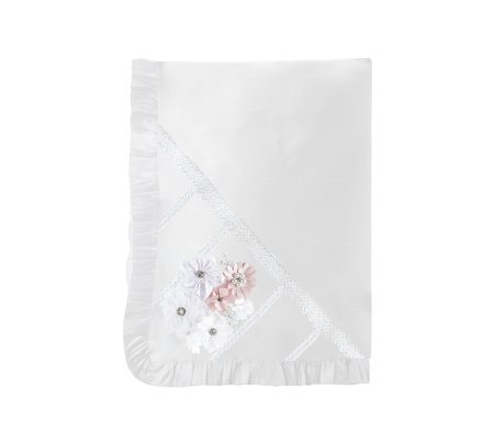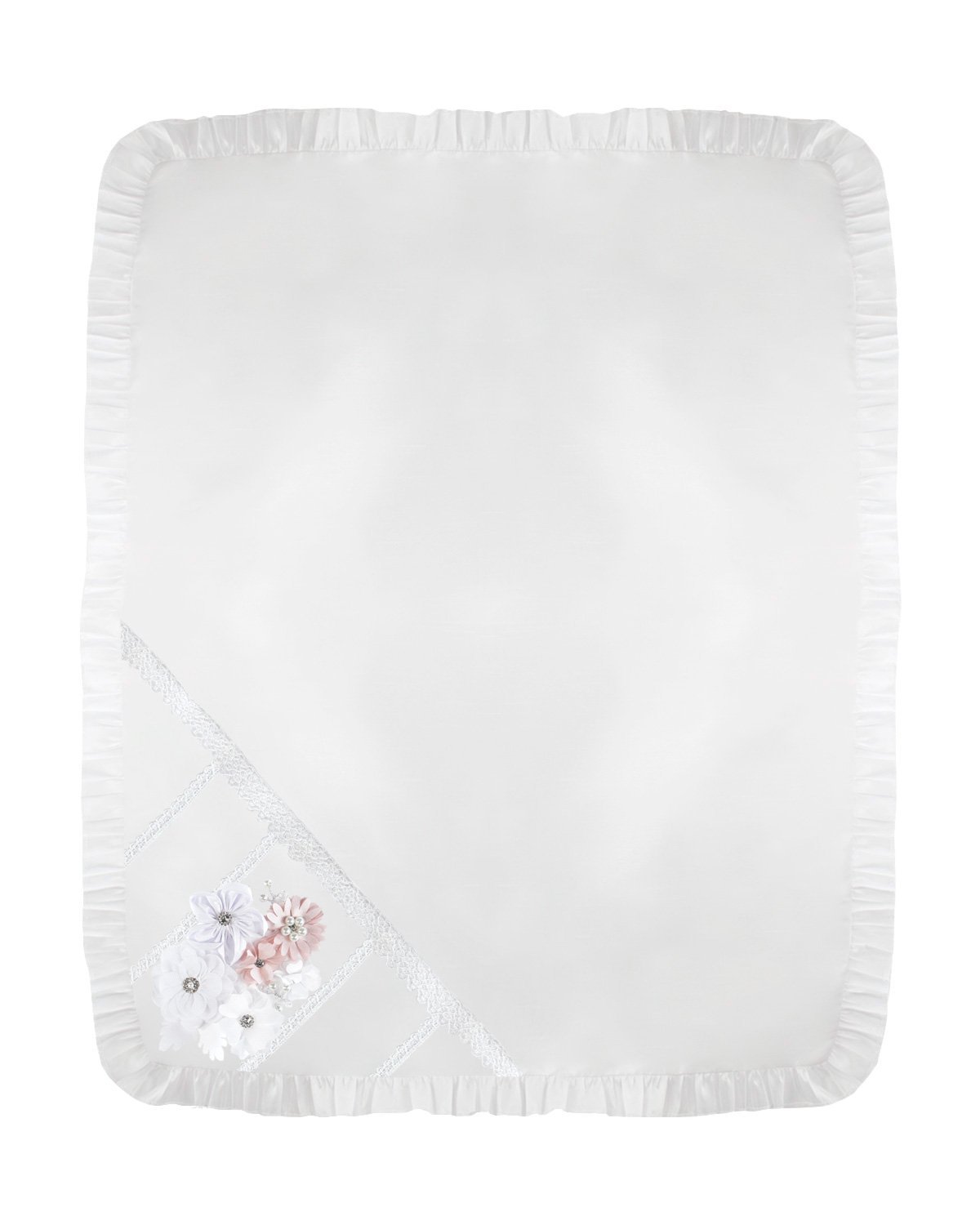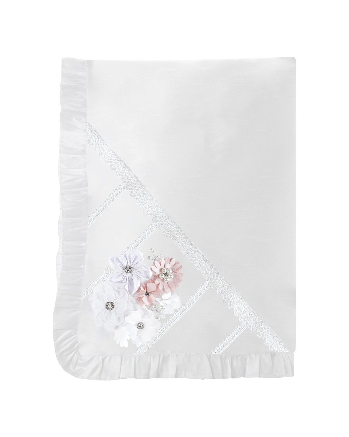 Samira Baptism Sheet made of shantung, featuring ruffled edges, embroidery, ribbons, pearls, rhinestones, and a 3D flower arrangement with rhinestones and pearls.