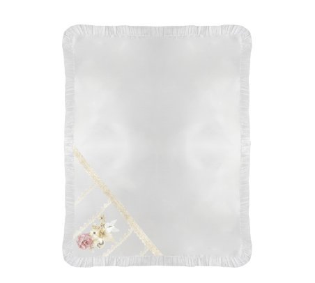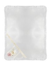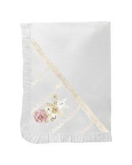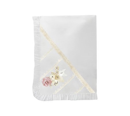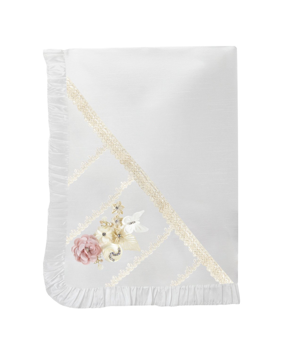 Mariposa Baptism Sheet made of shantung, featuring ruffled edges, embroidery, ribbons, pearls, rhinestones, and a 3D flower arrangement with butterflies.