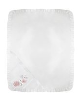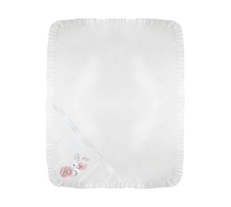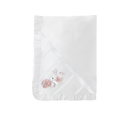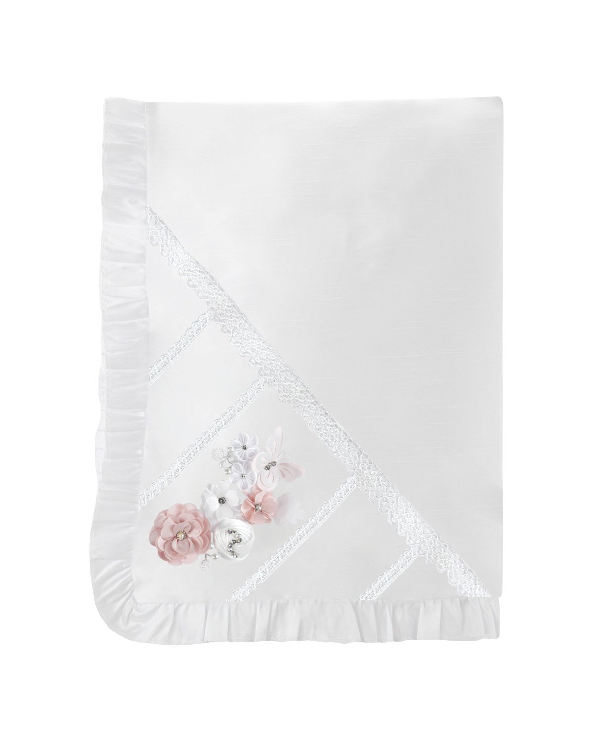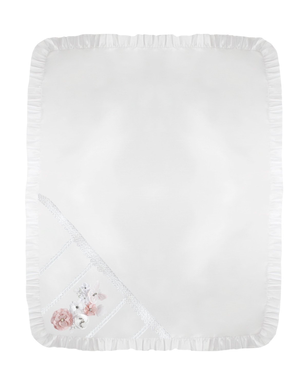 Mariposa Baptism Sheet made of shantung, featuring ruffled edges, embroidery, ribbons, pearls, rhinestones, and a 3D flower arrangement with butterflies.