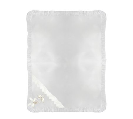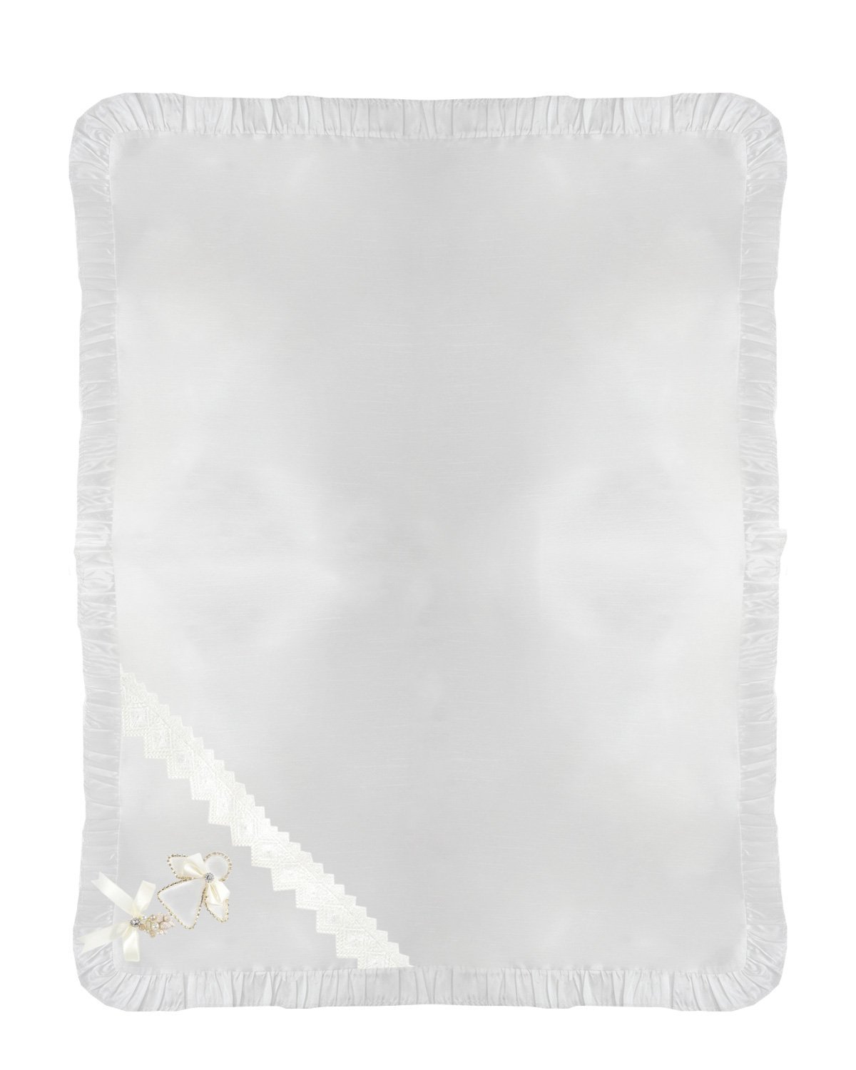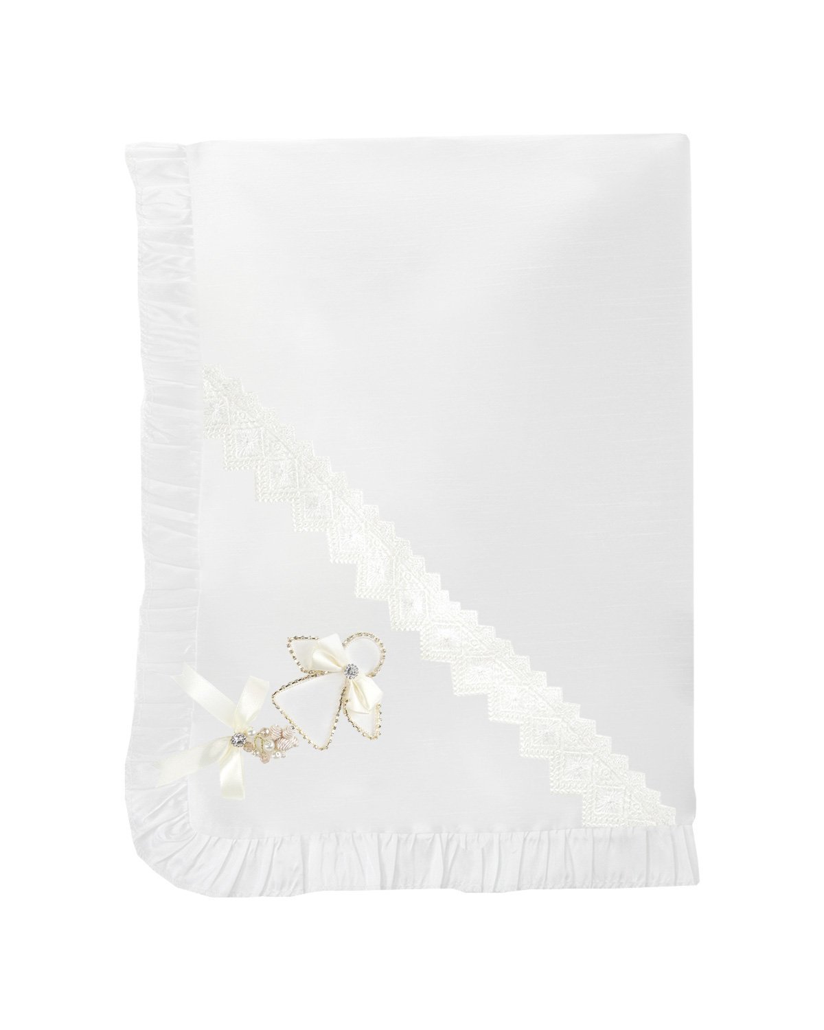 Angel Baptism Sheet Style, made of shantung with ruffles, embroidery, ribbons, pearls, rhinestones, and an angel figure crafted from rhinestones.