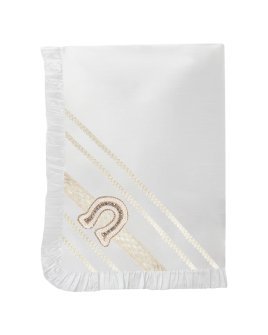 The Virgen Charro Baptism Sheet is a piece filled with meaning and elegance, crafted from high-quality shantung. Its design features a delicate ruffled edge, intricate embroidery, ribbons, pearls, and rhinestones that enhance its charm. At the center of a ribbon horseshoe lies an image of Our Lady of Guadalupe, creating a symbol of devotion and good wishes. Perfect for celebrating your baby's baptism with a unique and special touch.