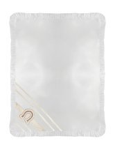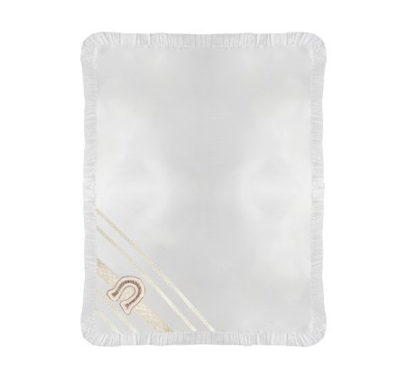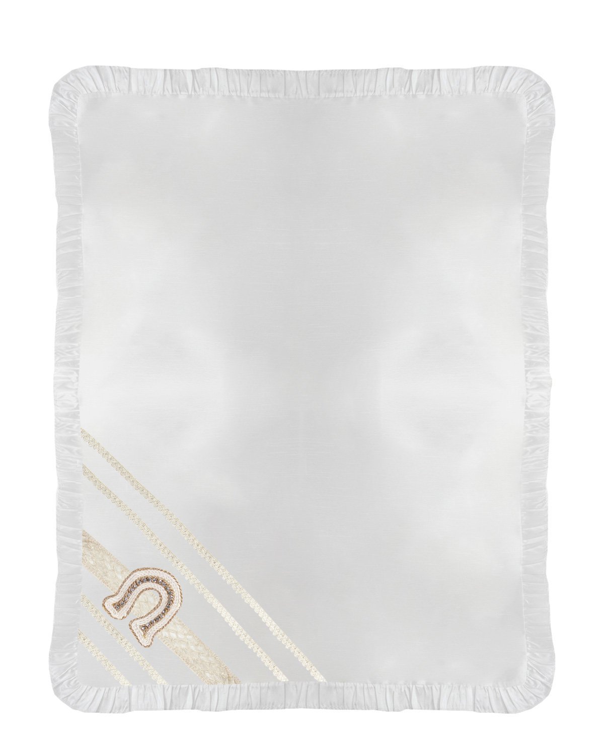 Virgen Charro Baptism Sheet made of shantung, featuring ruffled edges, embroidery, ribbons, pearls, rhinestones, a ribbon horseshoe, and an image of Our Lady of Guadalupe at its center.
