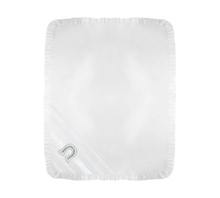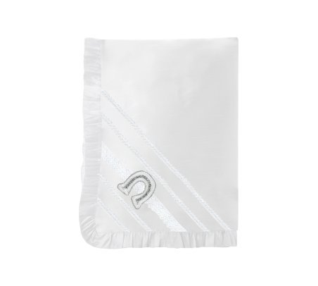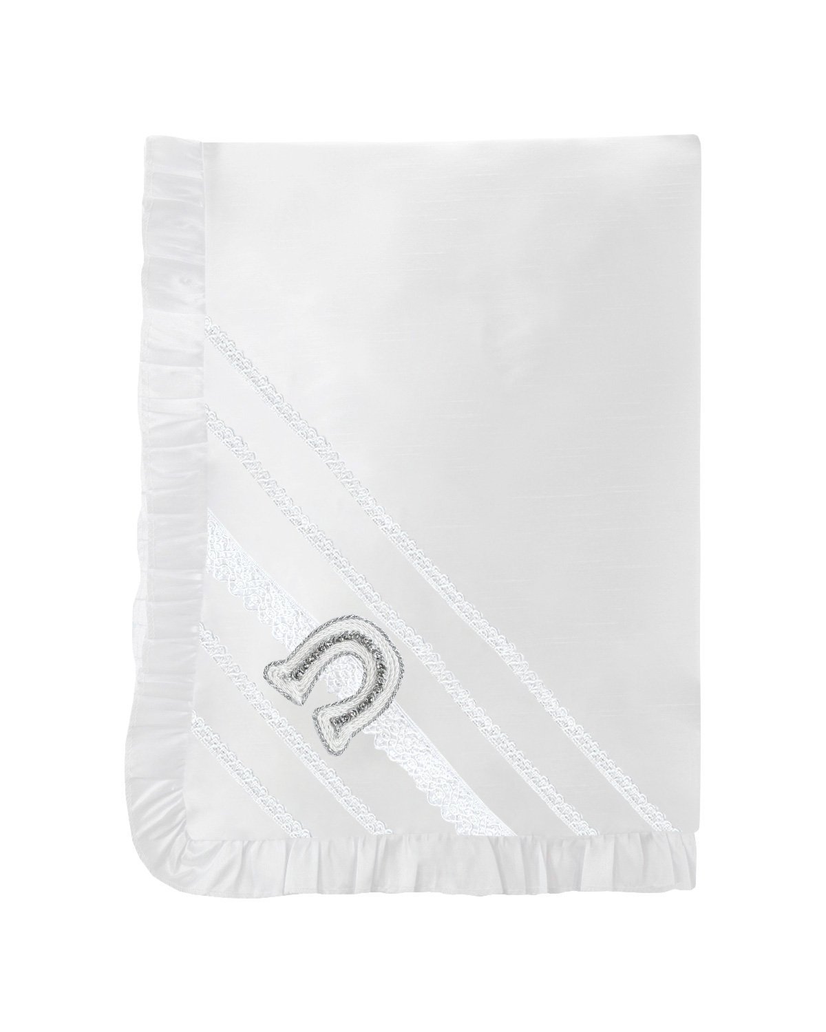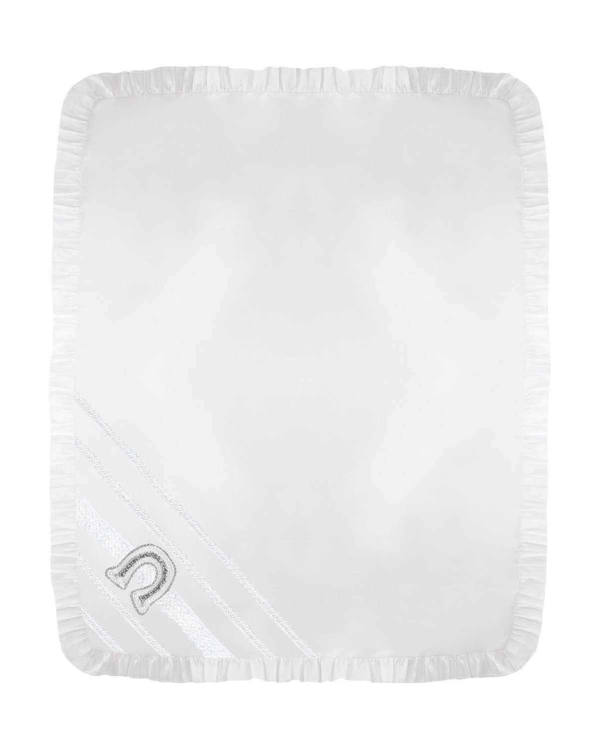 Virgen Charro Baptism Sheet made of shantung, featuring ruffled edges, embroidery, ribbons, pearls, rhinestones, a ribbon horseshoe, and an image of Our Lady of Guadalupe at its center.