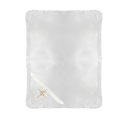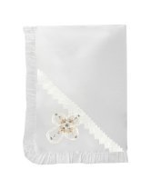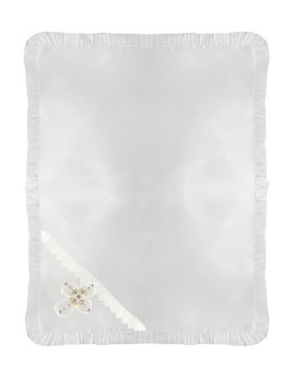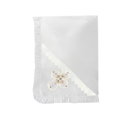 Emilio Baptism Sheet Style, made of shantung with ruffles, embroidery, ribbons, pearls, rhinestones, and a ribbon cross in one corner.