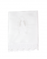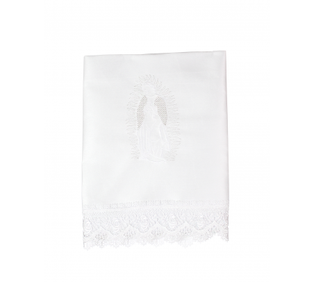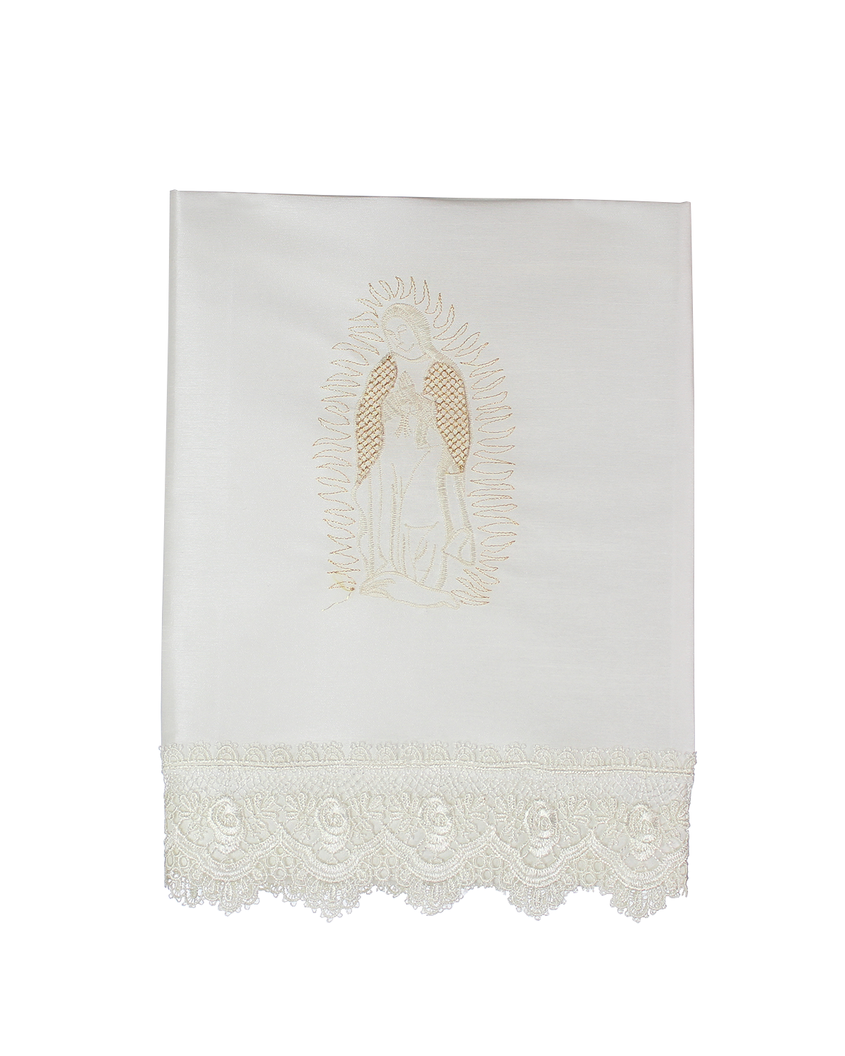 Virgen Baptism Swaddle with embroidered border and floral embroidery featuring Our Lady of Guadalupe.
