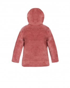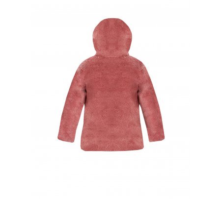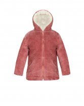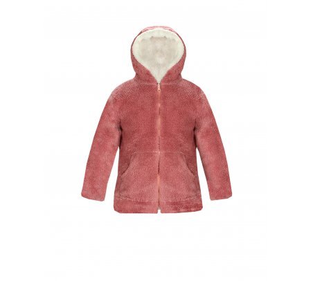 Girl's Coat, made from plush fabric with a lining, long sleeves, hood, front zipper, and front pockets. Ideal for cold days.
