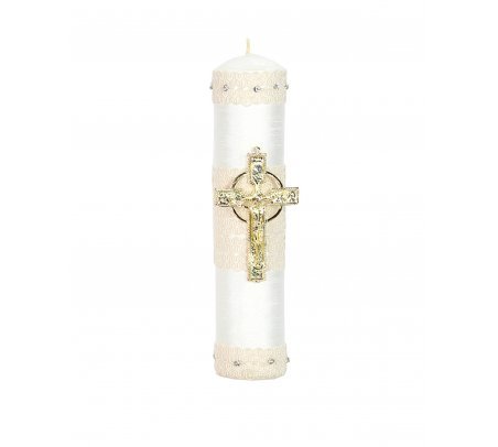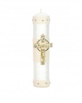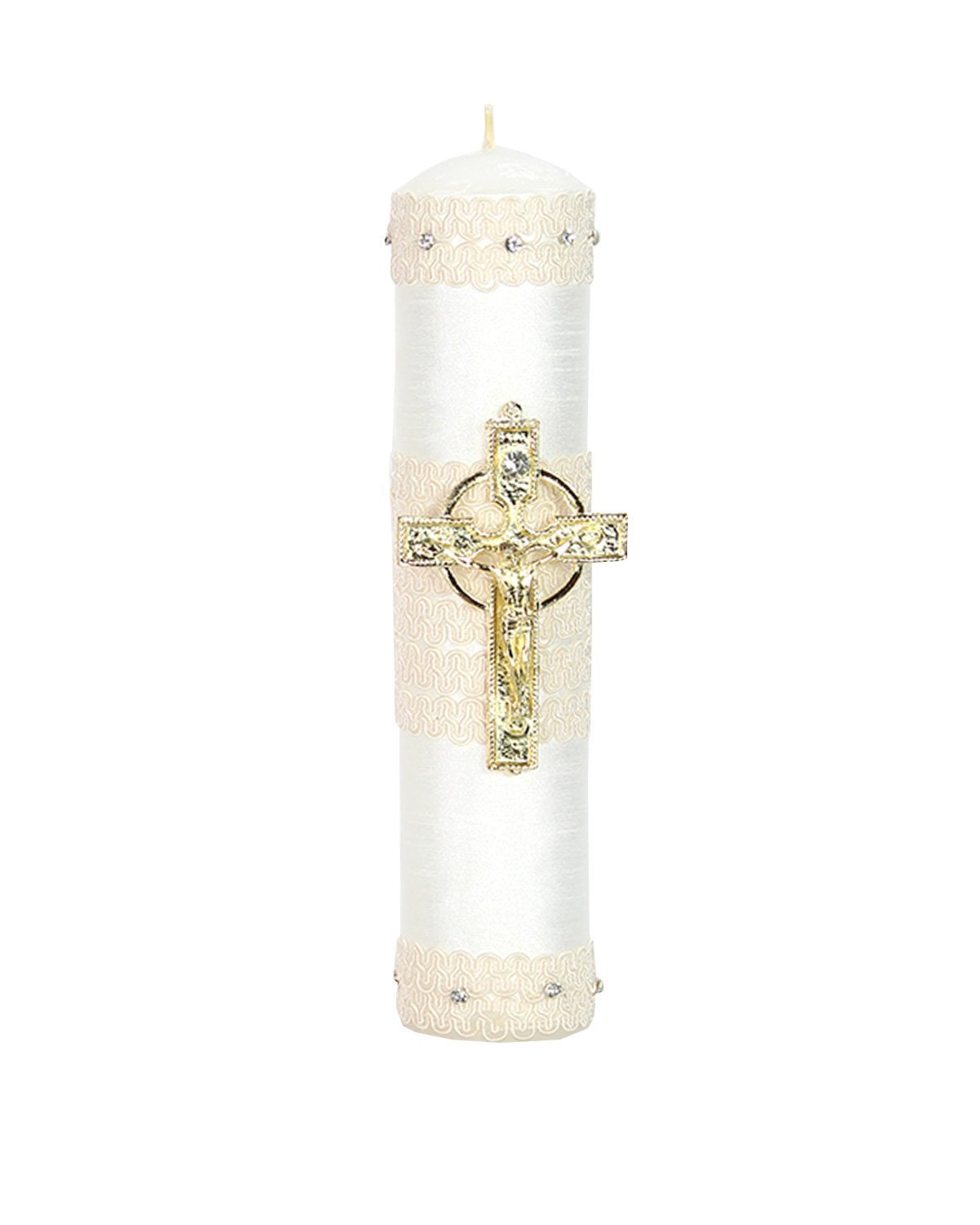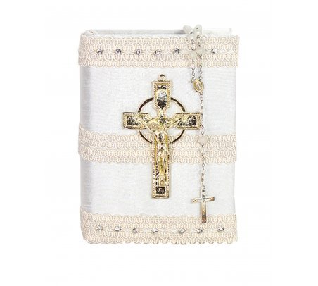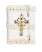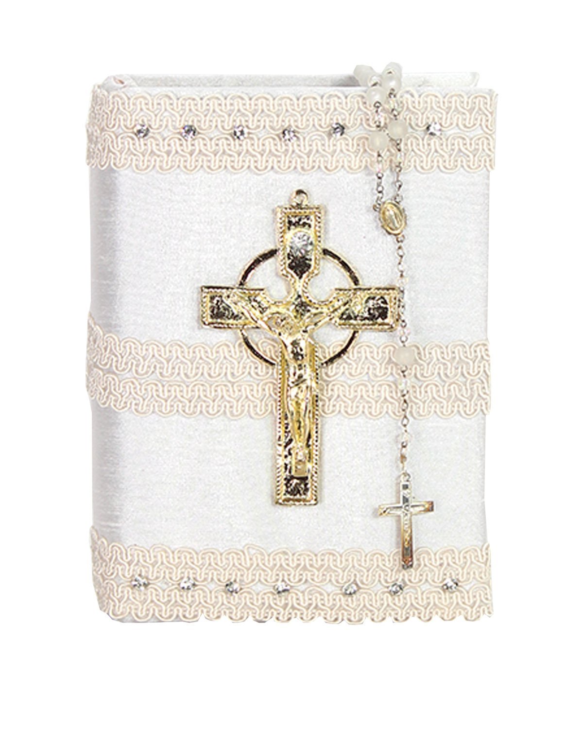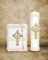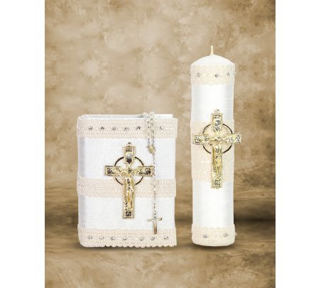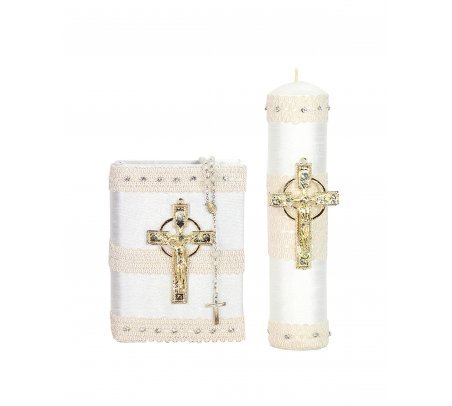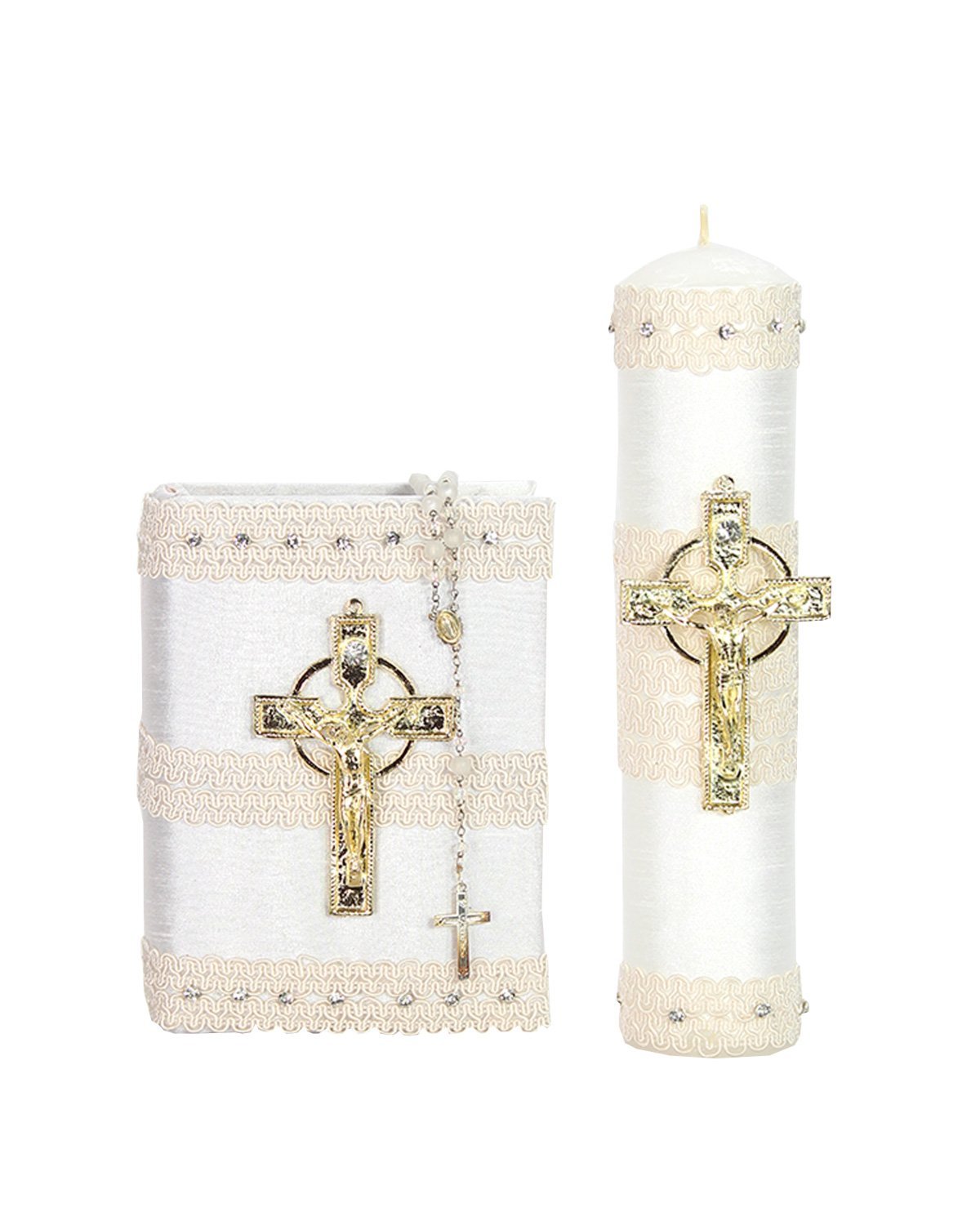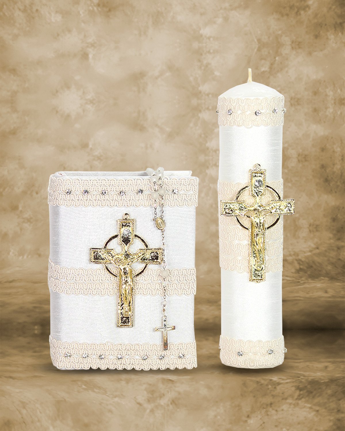 The First Communion Kit, Style David, includes a bible, a candle, and a rosary, all decorated with a crucifix, embroidery in the center and along the edges, and rhinestones.